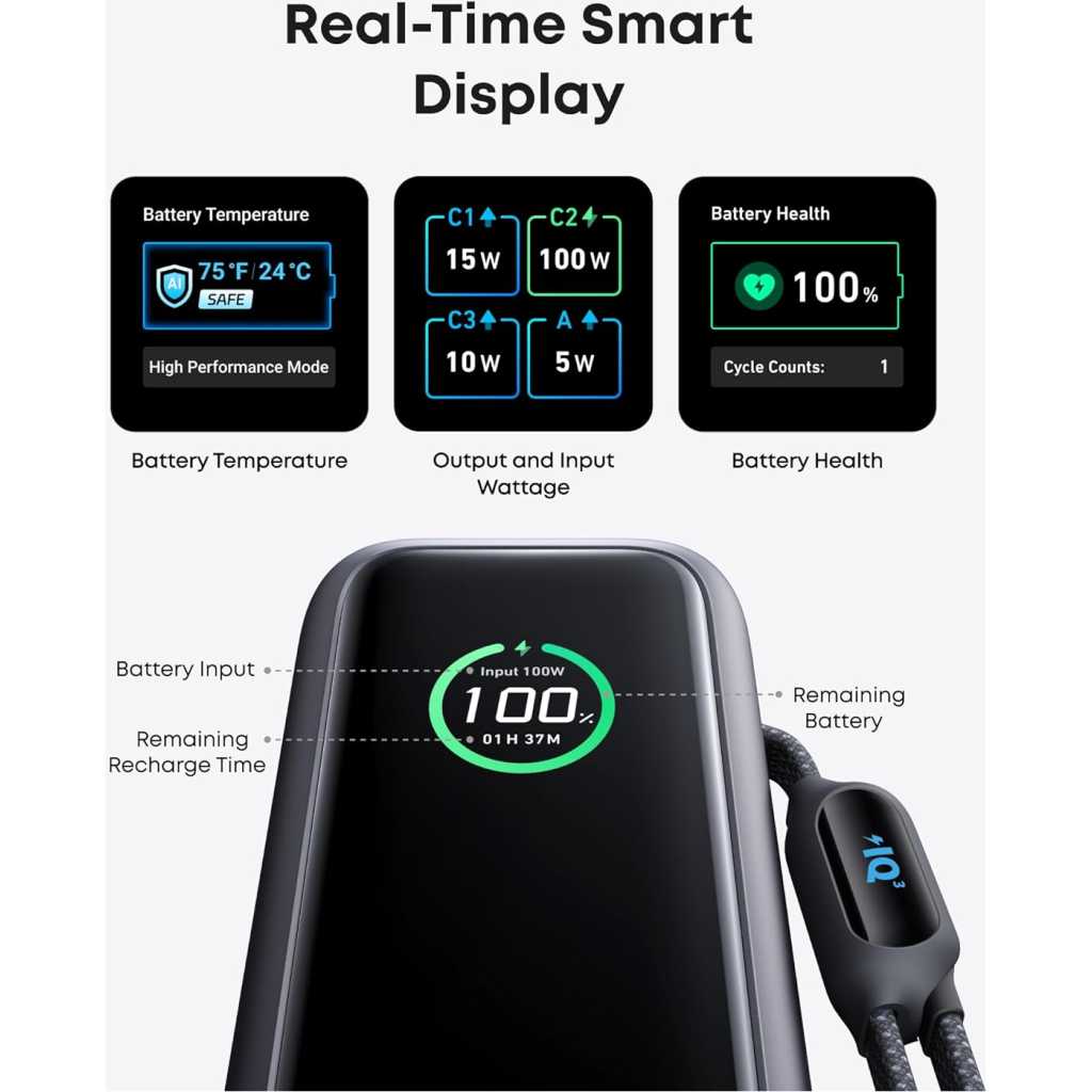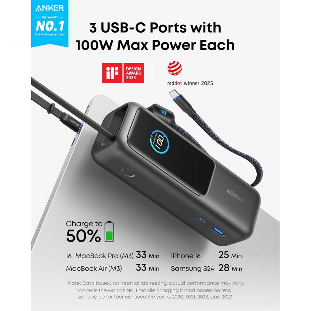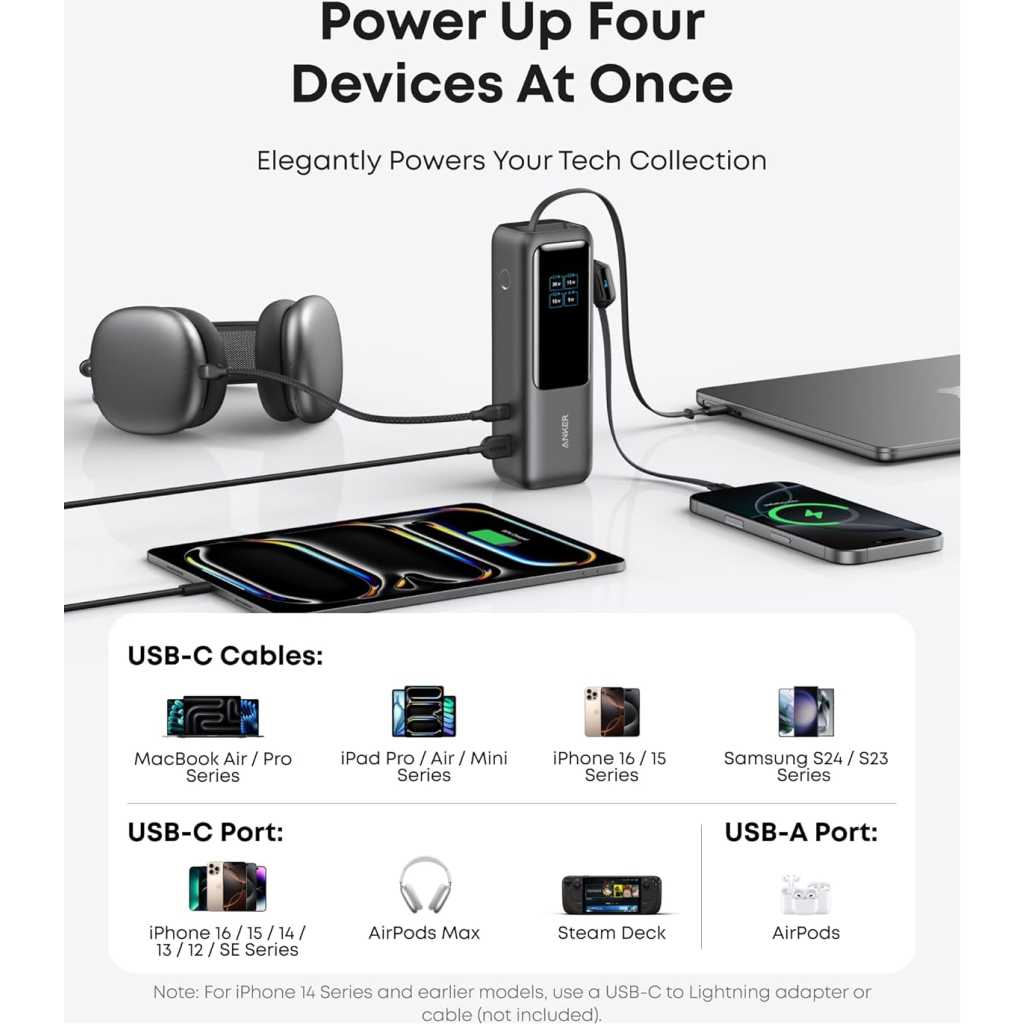 Key Features: Efficient 165W Dual Laptop Charging: Streamline your charging with dual ports that offer up to 165W, capable of powering two laptops quickly to keep up with your demands. Each port delivers up to 100W, so enjoy efficient charging without compromising on speed. 25,000mAh for Long-Haul Power: Set off on extended journeys with a huge 25,000mAh capacity that supports your devices through multiple uses, complete with 100W ultra-fast recharging that fuels the power bank to 30% in just 20 minutes. Dual Built-In Cables for On-the-Go Use: Enjoy the convenience of two built-in USB-C cables, retractable to 2.3 ft and doubling as a robust carrying strap. They are designed to endure over 17,000 bends and support up to 44 lbs. Charge 4 Devices at Once: Never run out of power, whether you’re charging smartphones, tablets, or other USB-enabled devices. Connect up to four at once thanks to dual USB-C Cables, a USB-A port, and a USB-C port. What You Get: Anker Power Bank (25K, 165W, Built-In and Retractable Cables), welcome guide, 12-month warranty, and our friendly customer service.