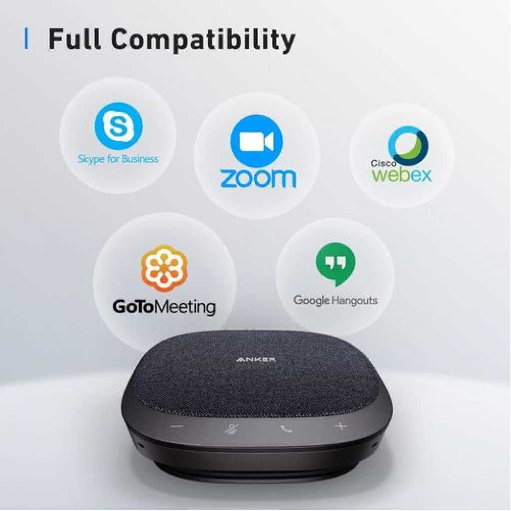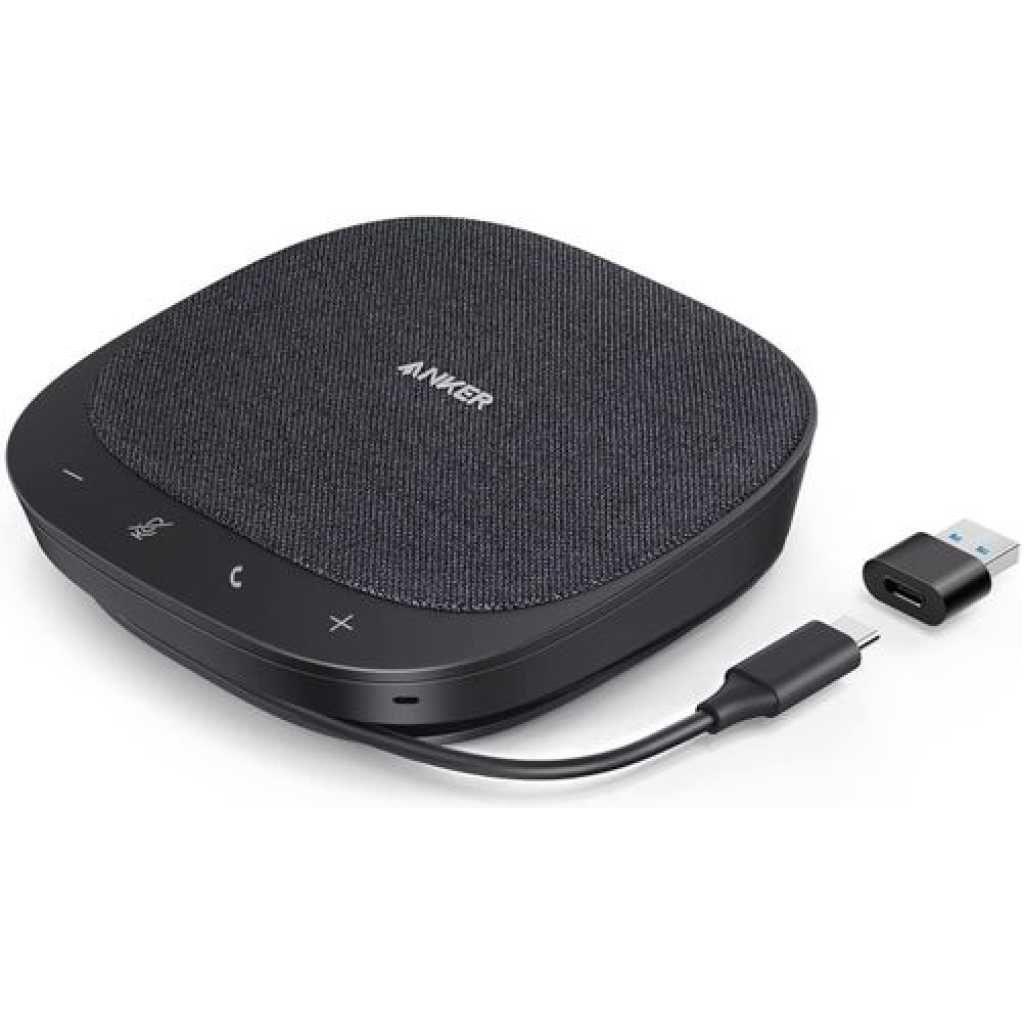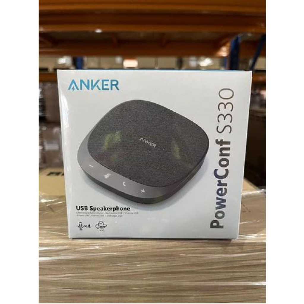 Anker PowerConf S330 USB Speakerphone, Conference Microphone for Home Office, Smart. Anker PowerConf S330 USB Speakerphone, Conference Microphone for Home Office, Smart Voice Enhancement, Plug and Play, 360° Voice Coverage via 4 Microphones, and Powerful Sound. Smart Voice Enhancement: Eliminate background noise while simultaneously enhancing voices for a professional meeting experience in any environment. Plug and Play: Connect via USB-C (includes standard USB adapter) and join meetings in an instant. A wired connection offers the most stable and reliable USB speakerphone experience. 360° Voice Coverage: A USB speakerphone with 4 high-sensitivity microphones to pick up all voices within 3m in super-high clarity. Superior Sound: A 1.75” driver paired with 2 passive bass radiators adds body and depth to both meeting audio and music. What’s In The Box: PowerConf S330 USB Speakerphone, USB-C to USB-A adapter. Voice Balancing PowerConf S330 uses automated gain control to balance volume levels. People further away or speaking more quietly are consistently loud and clear. Full Duplex Communication Unlike ordinary USB speakerphones, PowerConf S330 is able to relay sound from both ends simultaneously. Discussions are effortlessly efficient. Universal Compatibility A USB speakerphone that works with all leading online conferencing services such as Zoom, Skype, Google Hangout, FaceTime, WebEx, and GoToMeeting. Work On-the-Go Small enough to fit easily into a bag or backpack so you’re ready to turn any place into a work space. Any USB Port This USB speakerphone comes with a USB-C to USB-A adapter to ensure compatibility with any system. AnkerWork Software Update to the latest firmware for an optimum meeting experience. Full Duplex Audio: 2-way clear communication even if both ends are speaking simultaneously. Fully Compatible: A USB speakerphone designed to work effortlessly with all leading conference software. Auto Echo-Cancellation: A smart algorithm removes echo and feedback from remote calls. Computer Software: Get AnkerWork for PC or Mac to unlock full USB speakerphone functionality. Professional Design: Sleek looks and premium materials combine for a USB speakerphone that fits into any workspace. Key Features: Anker PowerConf S330 USB Speakerphone, Conference Microphone for Home Office, Smart. Smart Voice Enhancement: Eliminate background noise while simultaneously enhancing voices for a professional meeting experience in any environment. Plug and Play: Connect via USB-C (includes standard USB adapter) and join meetings in an instant. A wired connection offers a stable and reliable USB speakerphone experience. 360° Voice Coverage: A USB speakerphone with 4 high-sensitivity microphones to pick up all voices within 3m in super-high clarity. Superior Sound: A 1.75” driver paired with 2 passive bass radiators adds body and depth to both meeting audio and music. What’s In The Box: PowerConf S330 USB Speakerphone, USB-C to USB-A adapter.
