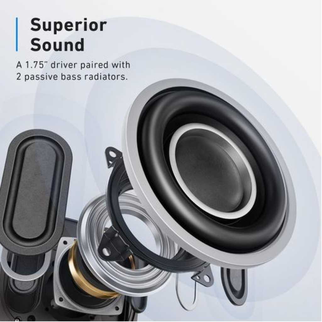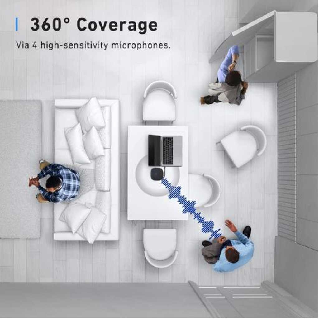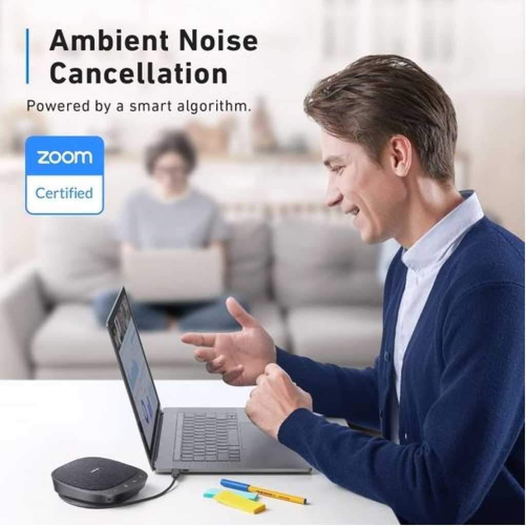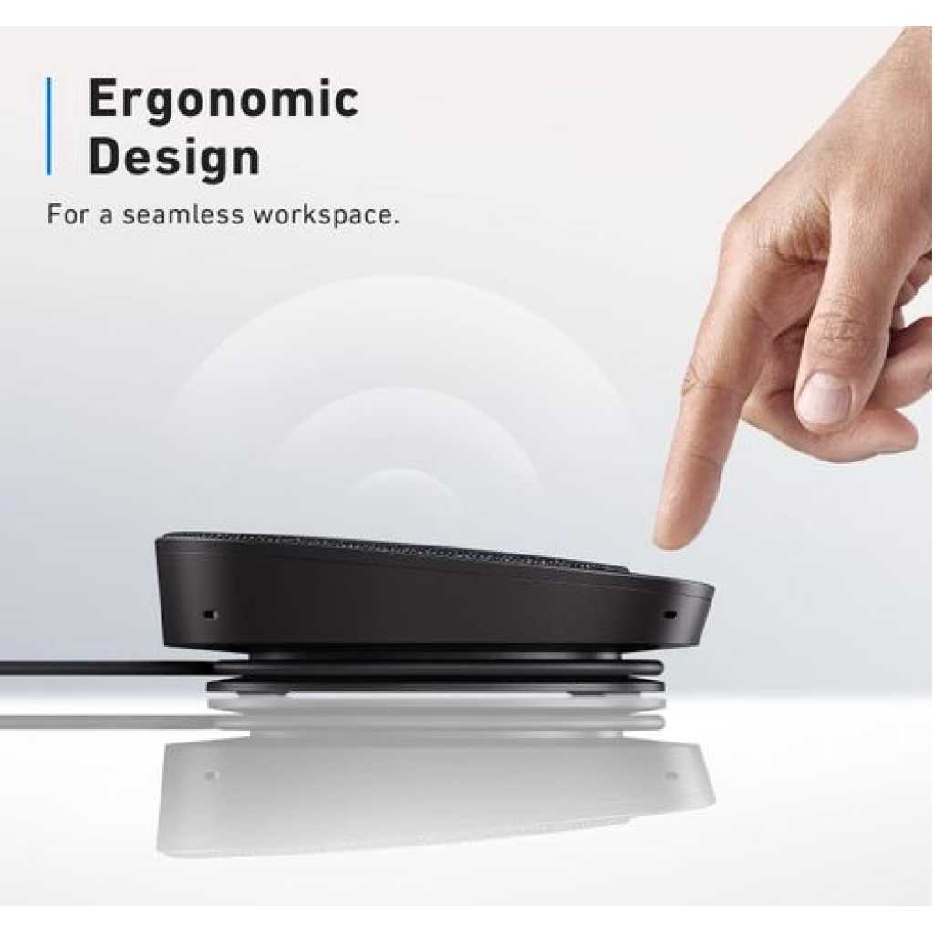 Anker PowerConf S330 USB Speakerphone, Conference Microphone for Home Office, Smart. Anker PowerConf S330 USB Speakerphone, Conference Microphone for Home Office, Smart Voice Enhancement, Plug and Play, 360° Voice Coverage via 4 Microphones, and Powerful Sound. Smart Voice Enhancement: Eliminate background noise while simultaneously enhancing voices for a professional meeting experience in any environment. Plug and Play: Connect via USB-C (includes standard USB adapter) and join meetings in an instant. A wired connection offers the most stable and reliable USB speakerphone experience. 360° Voice Coverage: A USB speakerphone with 4 high-sensitivity microphones to pick up all voices within 3m in super-high clarity. Superior Sound: A 1.75” driver paired with 2 passive bass radiators adds body and depth to both meeting audio and music. What’s In The Box: PowerConf S330 USB Speakerphone, USB-C to USB-A adapter. Voice Balancing PowerConf S330 uses automated gain control to balance volume levels. People further away or speaking more quietly are consistently loud and clear. Full Duplex Communication Unlike ordinary USB speakerphones, PowerConf S330 is able to relay sound from both ends simultaneously. Discussions are effortlessly efficient. Universal Compatibility A USB speakerphone that works with all leading online conferencing services such as Zoom, Skype, Google Hangout, FaceTime, WebEx, and GoToMeeting. Work On-the-Go Small enough to fit easily into a bag or backpack so you’re ready to turn any place into a work space. Any USB Port This USB speakerphone comes with a USB-C to USB-A adapter to ensure compatibility with any system. AnkerWork Software Update to the latest firmware for an optimum meeting experience. Full Duplex Audio: 2-way clear communication even if both ends are speaking simultaneously. Fully Compatible: A USB speakerphone designed to work effortlessly with all leading conference software. Auto Echo-Cancellation: A smart algorithm removes echo and feedback from remote calls. Computer Software: Get AnkerWork for PC or Mac to unlock full USB speakerphone functionality. Professional Design: Sleek looks and premium materials combine for a USB speakerphone that fits into any workspace. Key Features: Anker PowerConf S330 USB Speakerphone, Conference Microphone for Home Office, Smart. Smart Voice Enhancement: Eliminate background noise while simultaneously enhancing voices for a professional meeting experience in any environment. Plug and Play: Connect via USB-C (includes standard USB adapter) and join meetings in an instant. A wired connection offers a stable and reliable USB speakerphone experience. 360° Voice Coverage: A USB speakerphone with 4 high-sensitivity microphones to pick up all voices within 3m in super-high clarity. Superior Sound: A 1.75” driver paired with 2 passive bass radiators adds body and depth to both meeting audio and music. What’s In The Box: PowerConf S330 USB Speakerphone, USB-C to USB-A adapter.
