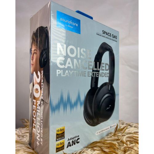 Enjoy Personal Space Anywhere: Low, mid, and high frequency noises are individually targeted by the 3-stage noise cancelling system. Hybrid active noise cancelling reduces low-frequency sounds like airplane engines and traffic noise by up to 98%. The other 2 stages filter out mid and high frequency noises such as crying babies and barking dogs. Ideal for Long-Haul Flights and Traveling: Up to 50 hours of playtime in noise cancelling mode will easily cover a vacation, an around-the-world flight, or weeks of commutes. In normal mode, you’ll get up to 65 hours of listening, and if you run out of power mid-journey, a 5-minute fast charge gives you 4 hours of playtime. Tailored Noise Cancelling Response: Adaptive noise cancelling detects external noises around you and automatically adjusts to different tailored modes. It switches to maximum level on flights or trains, reduces wind noise when you’re outdoors, and switches to a lower, comfortable level indoors. Highly-Detailed Sound: Experience sound with new levels of detail thanks to Space Q45 Bluetooth headphones’ innovative double-layer diaphragm drivers. Bass is extended for extra punch, vocals are rich, and treble is crisp—allowing every layer of the song to shine through. Hi-Res Wireless Sound: LDAC mode transmits up to 3× more data than standard Bluetooth codecs for a stunning high-resolution experience, even when using Space Q45 Bluetooth headphones in wireless mode. Secure and Well-Fitting: Space Q45 noise cancelling headphones are packed with comfort-enhancing details. The aluminum alloy hinges flex to fit the shape of your head, and the cushioned headband has a seamless sliding design for easy extension. To fit ears of different sizes, the ear cups have a wider diameter, plus bouncy-soft cushioning for hours and hours of comfort. soundcore App: Choose from 22 EQ presets, select a suitable level of noise cancelling and transparency, set volume level limits, customize the controls, and more. Customized Transparency: Space Q45 noise cancelling headphones also has Talk mode, allowing you to speak to people in your vicinity with ease, while the 5 levels of transparency in the app allow you to choose how much of your surroundings you let in. Multipoint Connection: Connect Space Q45 noise cancelling headphones to 2 devices at the same time—ideal for when you want to switch between listening to music, attending remote meetings, and making calls. What’s in the box soundcore Space Q45 Headphone x1 USB-C Cable x1 AUX Cable x1 Protective Case x1