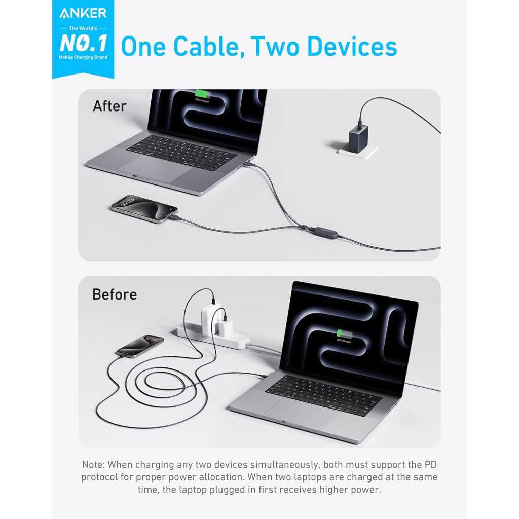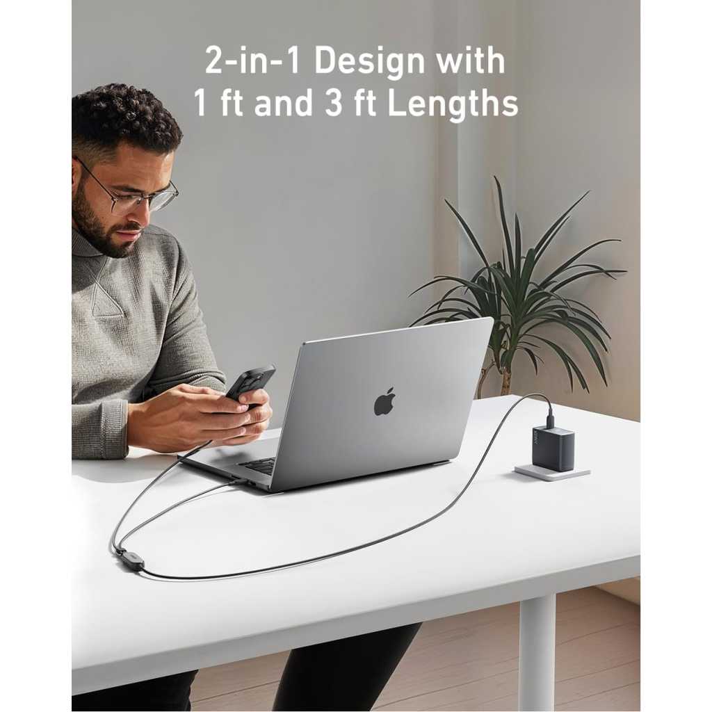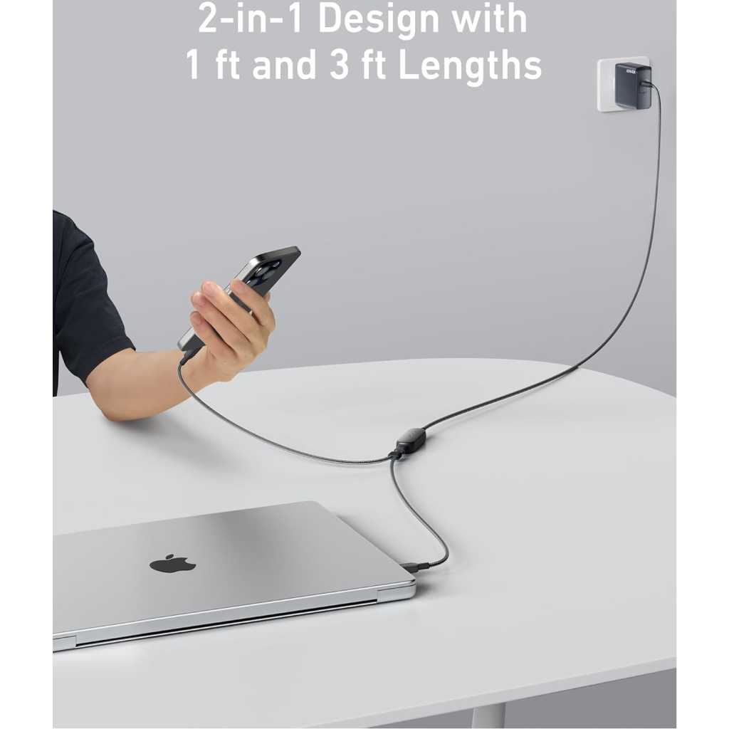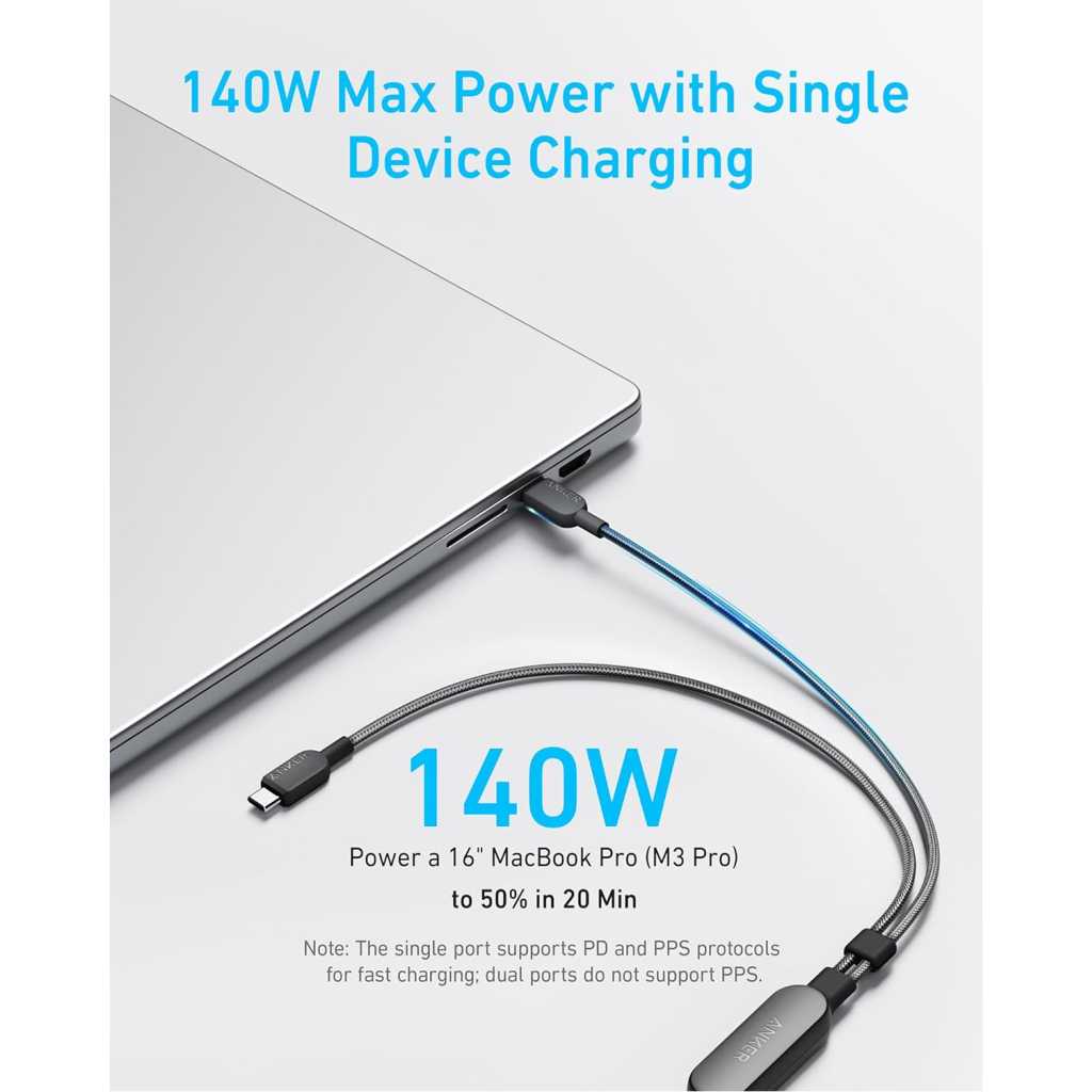 Key Features: 2-in-1 Charging Cable: Charge your smartphone and tablet simultaneously with one convenient cable, perfect for travel and business trips. Designed to minimize clutter, it’s ideal for keeping your space organized and carrying less while on the move. One Port, 140W Max Charging: Supercharge your 16-inch MacBook Pro (M3 Pro) to 50% in just 20 minutes with a single 140W USB-C port, designed for maximum power delivery and optimal charging speeds. Smart Power Management: Enhance your charging efficiency with this versatile cable, equipped with smart power distribution to optimize each device’s power needs. Flexible and Tough: Includes a 3 ft base cable and two 1 ft sections that can be adjusted with a cable slider, designed for durability with over 10,000 bend resistance. What You Get: Anker 2-in-1 USB-C to USB-C Cable (4 ft, 140W, Braided), welcome guide, 18-month warranty, and our friendly customer service.