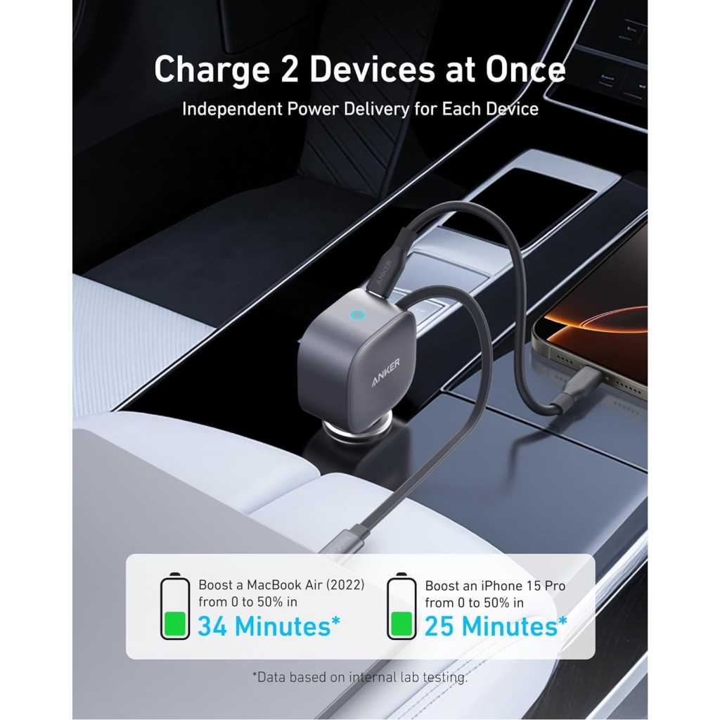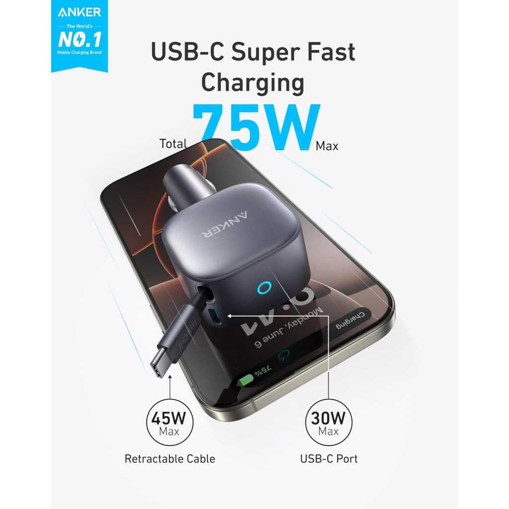 Key Features: Full-Throttle 75W USB-C Charging: Power up rapidly with a charger that delivers up to 75W, giving you super-fast charging when you need it most. Dual-Device Power Delivery: Experience rapid charging with the built-in 45W Power Delivery retractable cable and 30W USB-C port, perfect for powering up laptops and tablets together without slowing down. Pull, Charge, and Store: Extend by pulling the retractable cable more than 2 inches. Retract swiftly with a short pull and release. Keep Your Car Organized: Drive in style with a clutter-free charger that keeps your car’s interior neat and orderly. What You Get: Anker Nano Car Charger (75W, USB-C Port, Built-In Retractable USB-C Cable), welcome guide, 18-month warranty, and our friendly customer service.