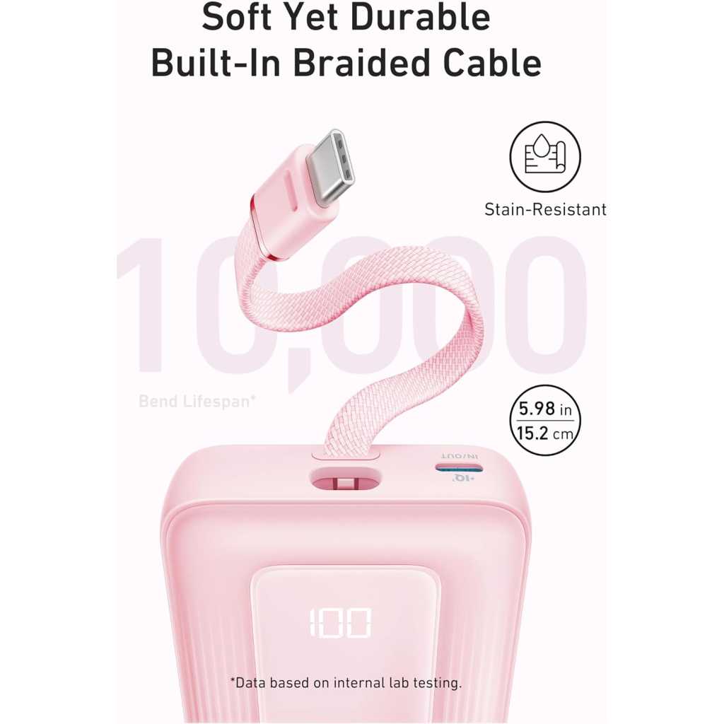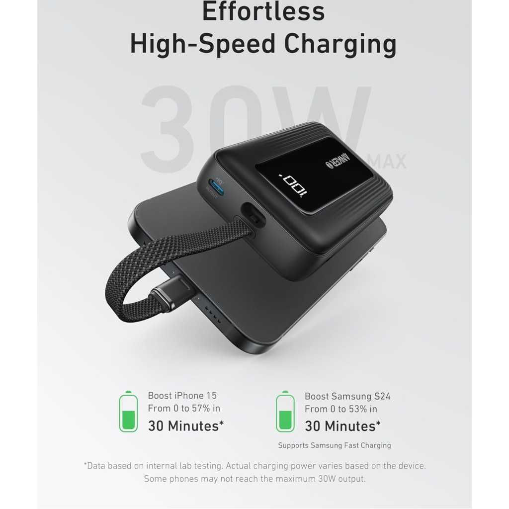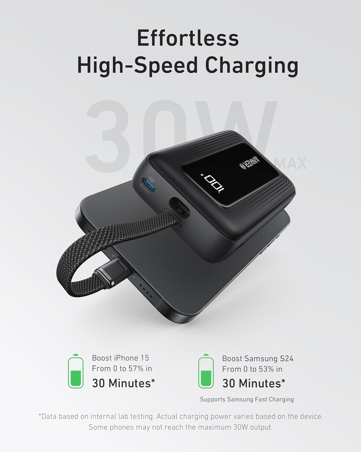 Key Features: Go Beyond with 20,000mAh: Carry the power you need to charge your iPhone 15 up to 4 times or your Samsung S24 3.79 times, perfect for extended travel and long days. 30W Two-Way Fast Charging: Charge quickly with 30W output and recharge just as fast with 20W input, keeping your devices ready in no time. Boost an iPhone 15 from 0 to 57% in just 30 minutes. Durability on Demand: Features a 5.98-inch built-in USB-C cable that’s not only convenient but also extremely durable, designed to withstand over 10,000 bends. Enhanced Safety: Equipped with ActiveShield 2.0 technology that monitors temperatures 3 million times per day and adjusts power output to ensure safe charging. What You Get: Anker Zolo Power Bank (20K, 30W) with a 5.98-inch (15.2 cm) built-in USB-C cable.