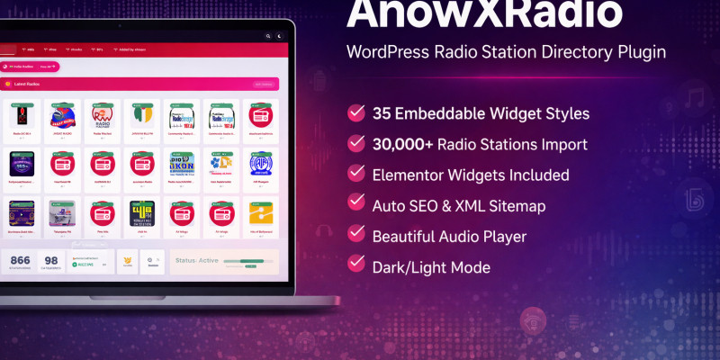 AnowXRadio - WordPress Radio Station Directory. Professional radio station directory plugin with 35 widget styles, audio player, Radio Browser import & Elementor support.