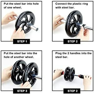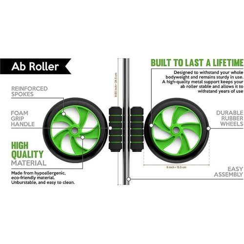 Product Description Superior Stability The Ab roller has ergonomic handles that make its abdominal muscle rollers have strong stability to ensure balance during the exercise and avoid injuries. Non-Skid Wheels The wide non-skid wheel securely grips any type of floor and the thick knee mat is here to protect your knees from any kind of injury. It bear up to 100 kg weight easily. Multi-Functional Roller The Ab roller is designed for stomach ( abs, abdominal, belly) exercise. It strengthens the muscles of your oblique, hip, shoulder, triceps and makes you more stable. Ab Roller is an ab wheel with a patented design that improves the effectiveness of ab exercises and helps to engage and strengthen muscles in the back, chest, arms, and core. Unlike traditional ab wheels, the Ab Roller uses a unique carbon steel spring mechanism that provides resistance as users roll out and assistance as they roll back, engaging muscles more thoroughly. While most ab rollers feature flat wheels that only allow for rolling straight out and back, the Ab Roller features a wide, spherical wheel that helps users engage all ab muscles, including obliques, by pivoting to the right and left. This helps to strengthen deep core muscles that stabilize the pelvis and spine. The Ab Roller also features padded, angled, ergonomic hand grips that maximize engagement of arm muscles while remaining comfortable and stable. AB Roller is one of the best home fitness equipment that can exercise your upper body, and is designed to build your abs, back, arms and shoulder muscles. The powerful rolling exercises can help reduce belly fat and carve perfect abs. It gives you a total body workout, which is great for achieving peak fitness levels, from beginners to advanced trainers, men and women. This AB Roller exercise equipment comes with dual wheels for excellent stability. They come independently with the package and give a broader base and more support to you as you stretch out and roll back to exercise and trim your tummy. PVC Wheels fit into the metal bar for more safety and durability. Thick ergonomically designed foam handles have been added to increase grip and overall comfort during workouts and even for prolonged use BENEFITS OF AB ROLLER WHEEL Everyone wants a set of toned abs! NMS TRADERS – AB Roller is the most useful tool to tone and strengthen your abs, shoulders, arms and lower back. No matter you’re a beginner or an expert, it will strengthen your abs and core faster than endless sit-ups and crunches. Safe and effective for in-home training. Single wheel design for smooth, fluid movements. Strengthen and tone your core muscles. Comfortable hand grips to cushion your hands. Extra thick mat for knee support. Helps sculpt and tone abdominals. FEATURES OF AB ROLLER WHEEL Two non-skid wheels for added stability and smooth functioning. Easy-grip handles to prevent slippage. The knee mat protects your knee and prevents injury while you train and exercise. Compact design for traveling and getting fit anywhere. Suitable for all fitness levels: from beginners to experts. SPECIFICATIONS OF AB ROLLER WHEEL Material: PVC, Foam, Steel, Rubber Dimension: 32 x 20cm Dimensions of knee pad: 34 x 16.8 x 1.1cm IN PACKAGE 2 x Roller Wheel 2 x Foam Handles 1 x Steel Bar 1 x Knee Mat WITH KNEE PAD The AB roller kit comes with a knee pad. The comfortable knee pad helps to maximize results of ab roll out exercises and protect your knees from getting hurt. HOW TO USE ? Easy to assemble, our Ab Roller is suitable for travelling, and manufactured from lightweight durable materials for easy carrying in bags or luggage, guaranteeing wherever you are, the perfect core workout will be within arm’s reach.