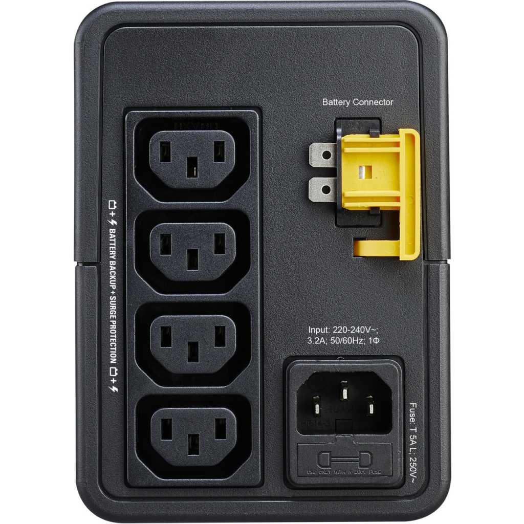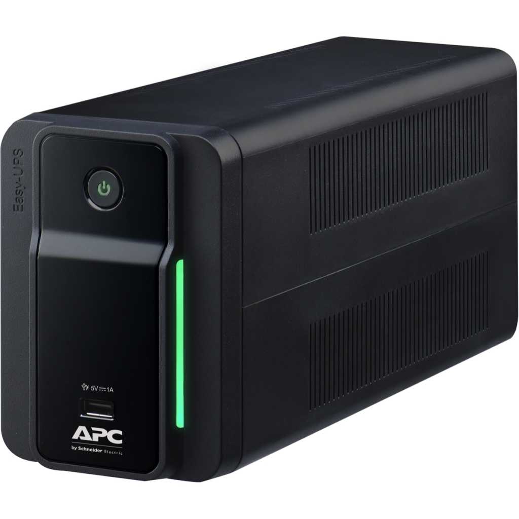 APC Back-UPS 700VA 230V AVR – Black. With increased power capacity, Easy UPS gives you enough time to keep working and remain productive for hours and then safely shut down devices following an outage. Product features Automatic Voltage Regulation (AVR) Automatic Voltage Regulation boosts/trims the AC voltage when it drops/exceeds levels. This allows the equipment plugged into the unit to operate during low/high voltage conditions, conserving the battery power in the event of a power cut. The Easy UPS will switch to battery power if the input voltage level becomes too low/high for the Automatic Voltage Regulation to compensate, or if the AC power is distorted. USB Charging Port for Smartphones and Tablets (only for BVX700LUI models) This USB charging port provides a maximum of 5V 1 A DC power. The port will charge the connected equipment when the UPS is on line mode, battery mode and off charging mode. Quick Mute The Easy UPS is able to temporarily mute user correctable audible alarms such as On Battery. During such audible alarms, a short press of the POWER button will temporarily mute the audible alarm until the condition has been reset. A short double beep will confirm that Quick Mute has been activated. Pressing the POWER button for more than 2 seconds will turn off the UPS. Other events such as Battery replacement and Charger notification can not be temporarily muted. The unit in these cases must be turned off. Voltage Sensitivity Adjustment Ensure the Easy UPS is off. Press and hold the POWER button for 10 seconds until a beep is heard. The LED will flash and sensitivity LOW is set. If press and hold the POWER button for 10 seconds again, the LED will be on and sensitivity MEDIUM is set. Key Features: APC Back-UPS 700VA 230V AVR – Black. Main Input Voltage : 230 V AC 1 phase Main Output Voltage : 230 V AC 1 phase Rated power in W : 360 W Rated power in VA : 700 VA Input Connection Type : IEC 60320 C14 Output connection type : Two universal sockets