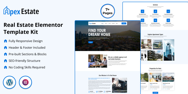 Apex Estate: Premium Real Estate Elementor Kit. Apex Estate is the Elementor kit for real estate agencies and agents. Includes 3 Home pages, Property listings, and Agents pages.