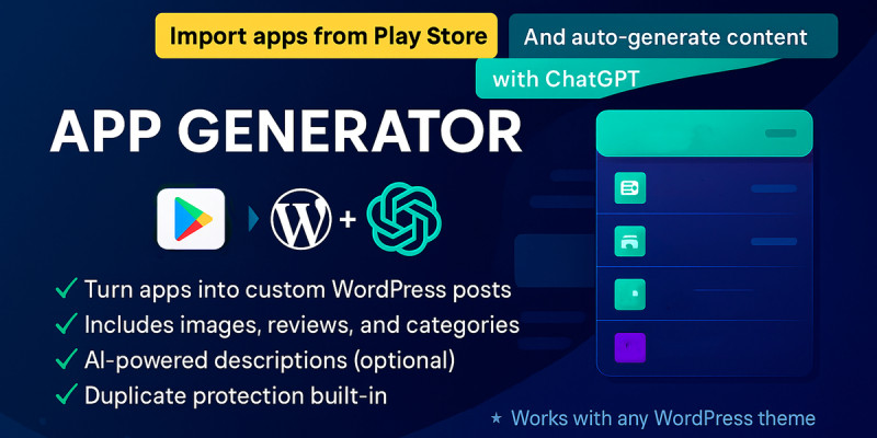 App Generator - WordPress Plugin. Import Android apps into WordPress from Google Play with AI-enhanced descriptions, images, and full metadata.