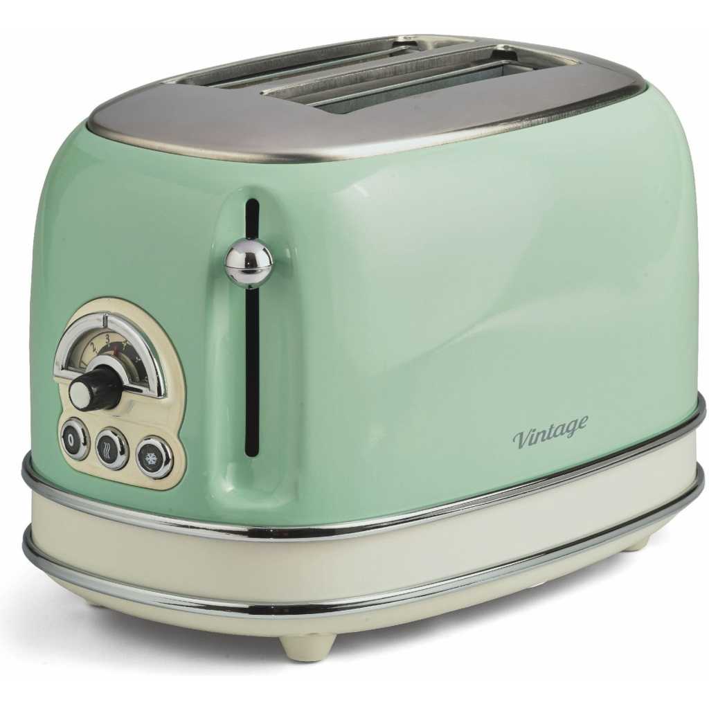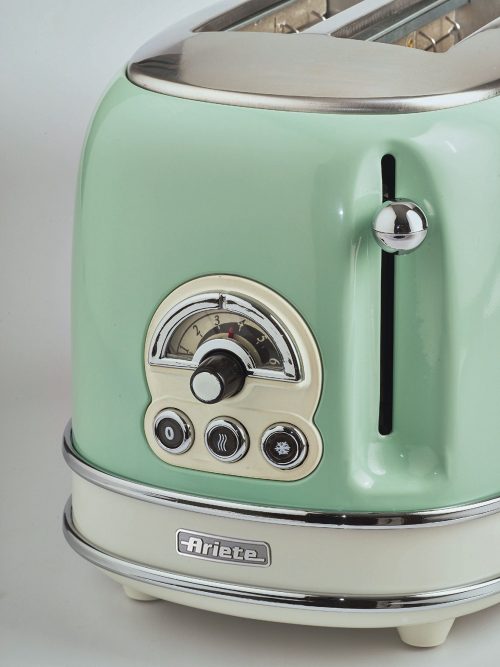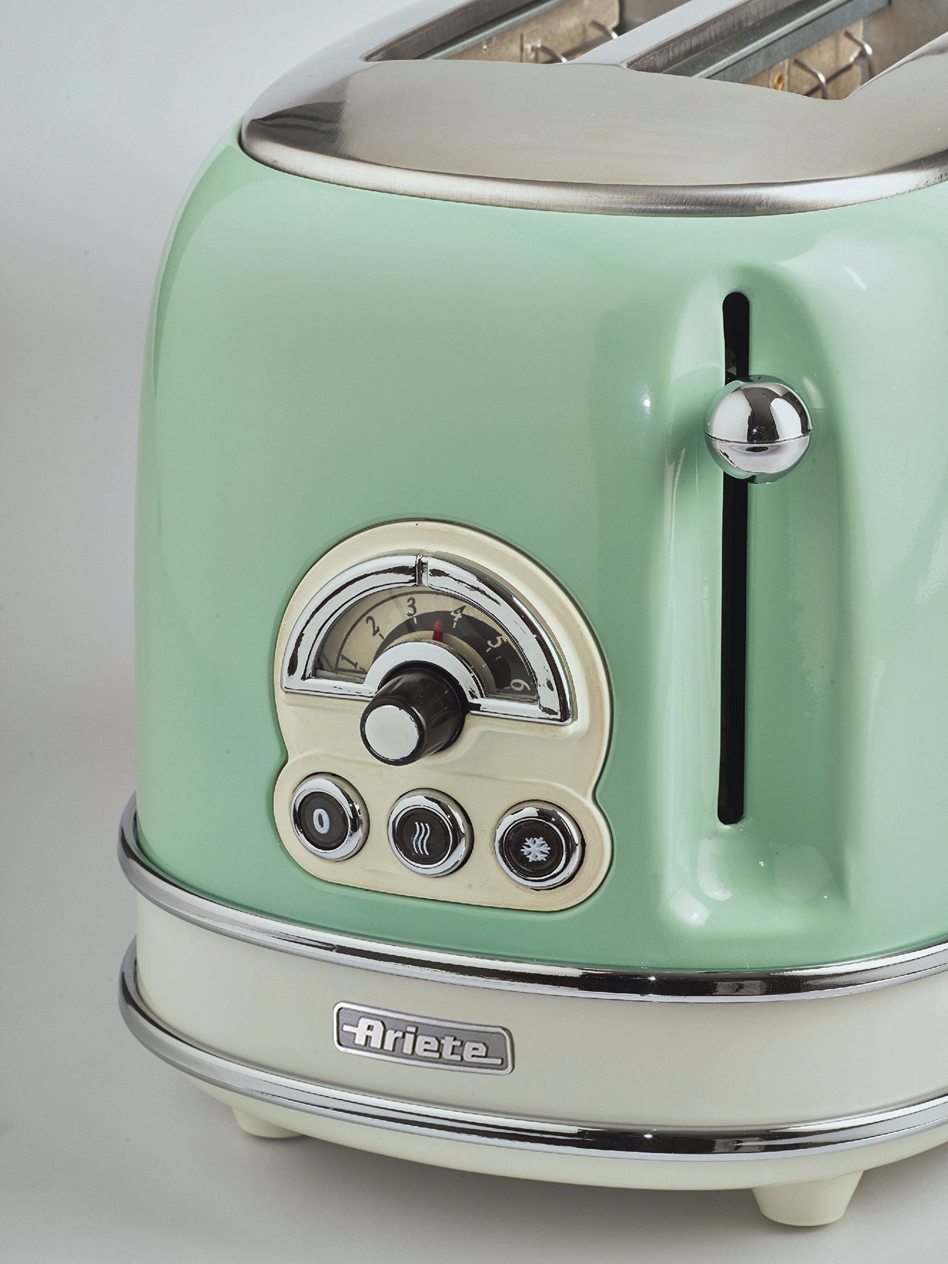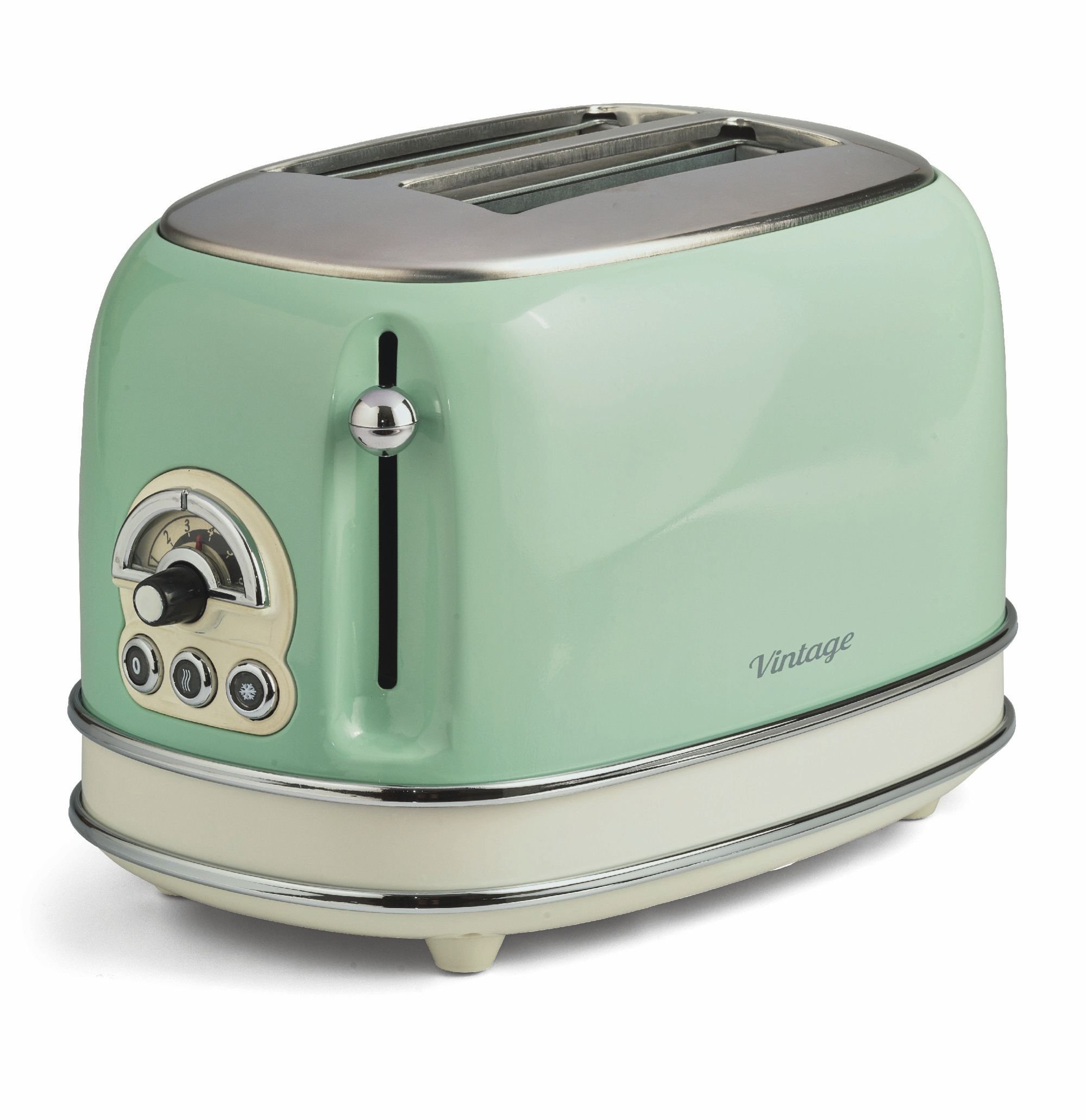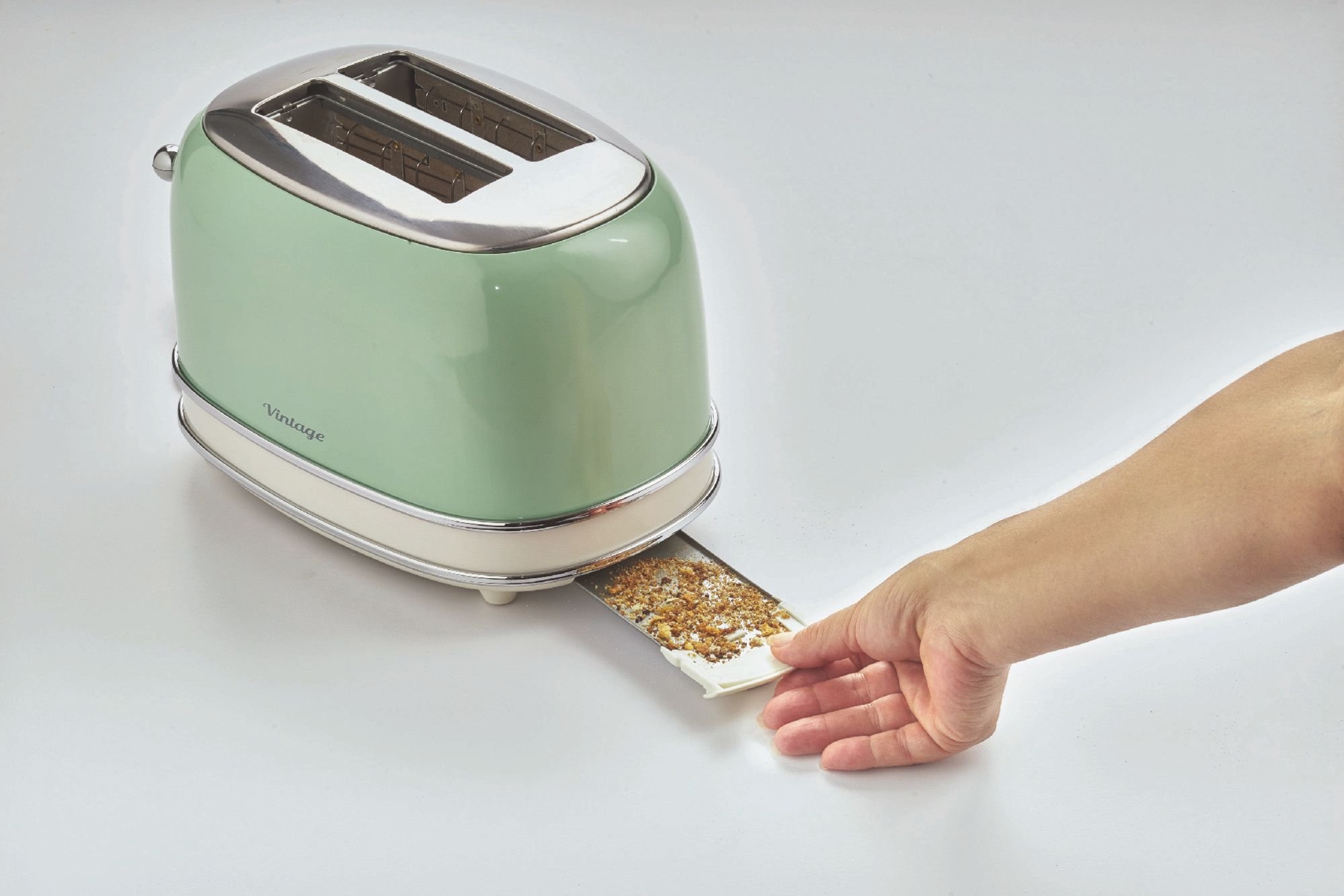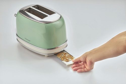 2-slice vintage toaster without pliers to toast simple slices or filled sandwiches, with auto eject and removable crumb tray, six levels of browning, cool touch sides and defrosting, heating and cooking function. Product specification 680 – 810 W Metal body Three functions including cancel, defrost and reheat Six browning levels Crumb tray Automatic ejection of the slices Intergrated cable compartment Non-slip feet Power plug- Type G Key Features: Retro design will bring a quirky style to your kitchen Style plus functionality with three functions: Cancel, defrost and reheat 6 browning levels will ensure your morning toast is made just the way you like it Removable crumb tray lets you keep it clean without worrying about stray crumbs Non slip feet will keep it in place and stop it sliding across your kitchen top