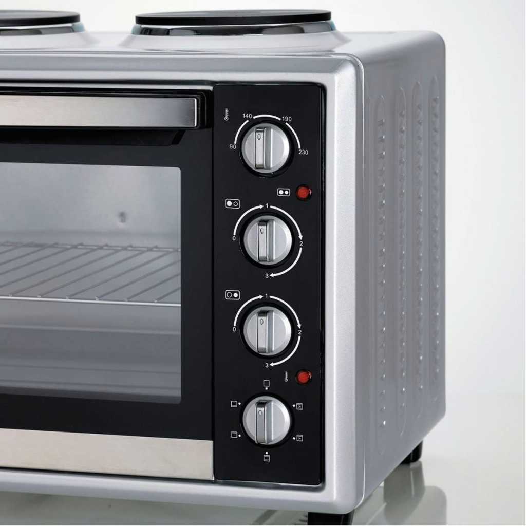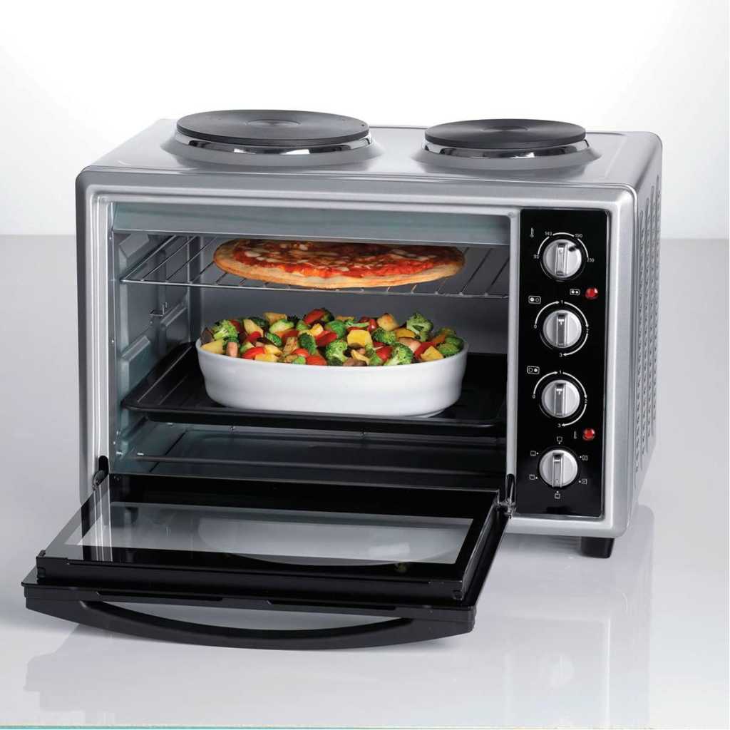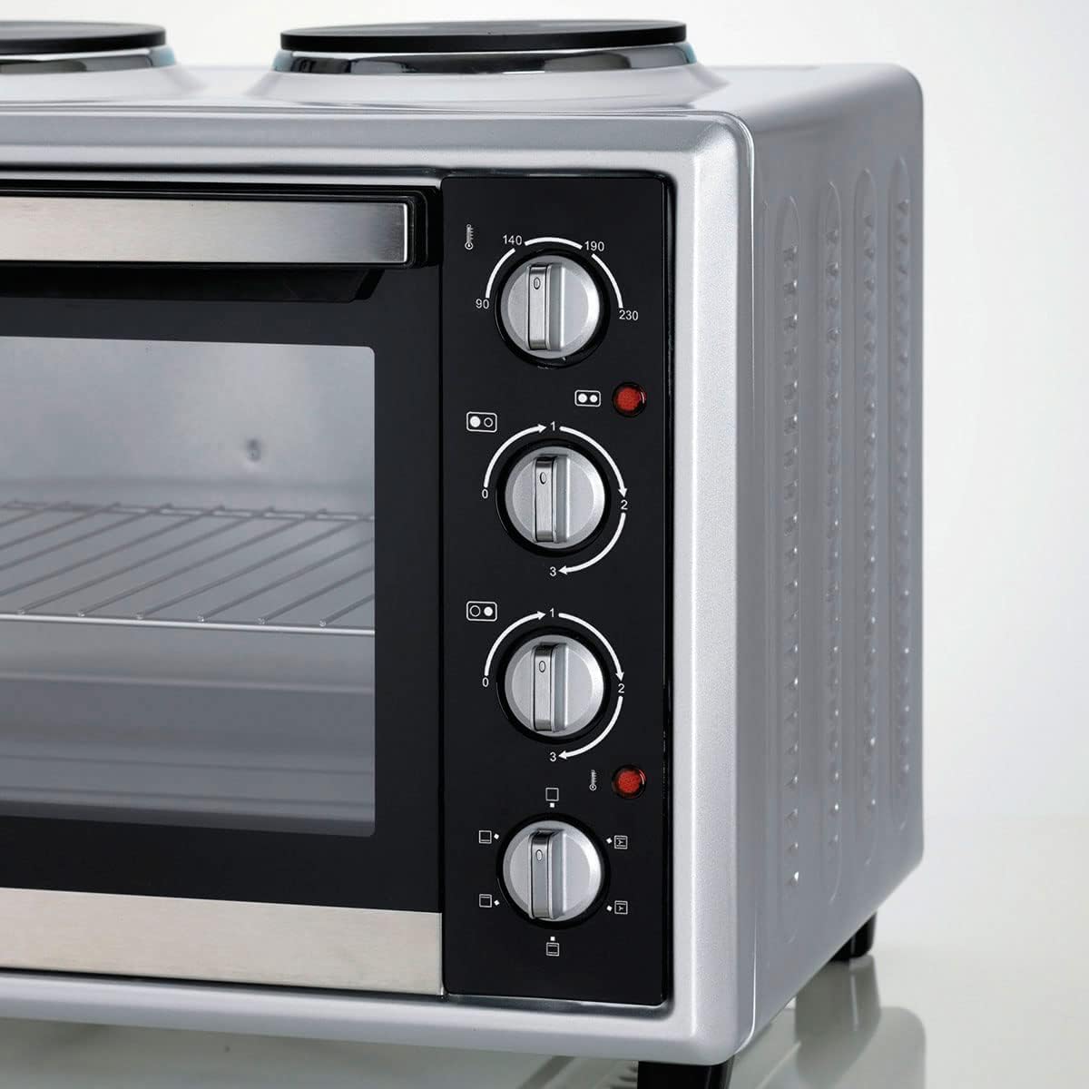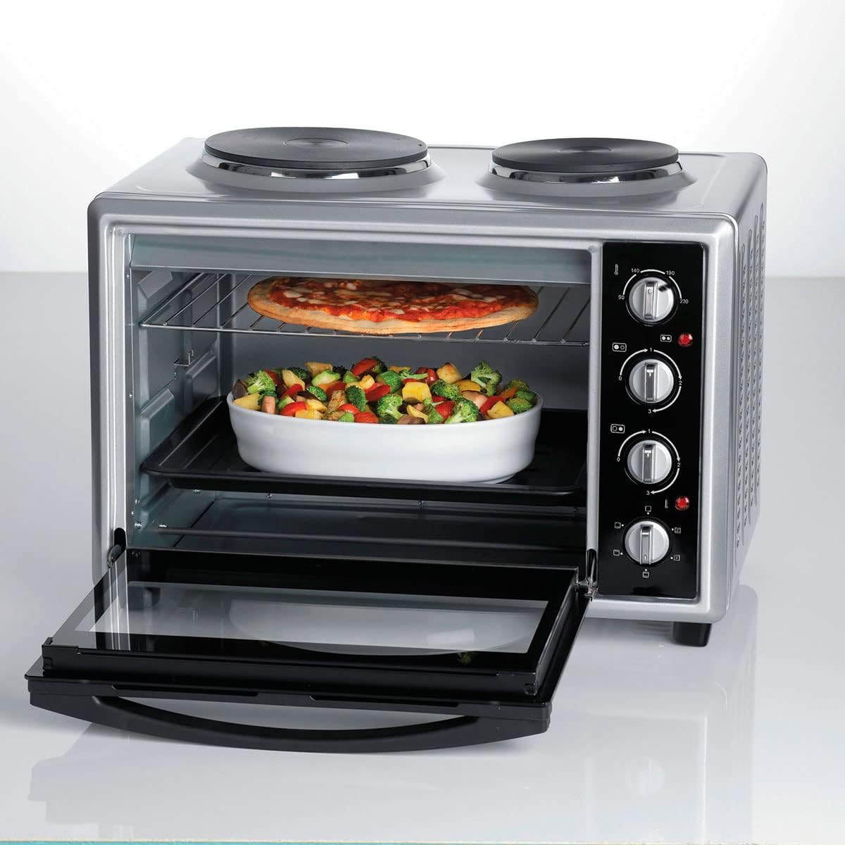 40 liter electric oven ideal for preparing large quantities of roasts, lasagna, pizza or desserts. Thanks to the static oven function you can bake homemade bread and pizza and obtain perfect cooking, without having to turn on the traditional oven, Key Features: Power oven 1500W – Capacity 40L Power small hotplate 750W – Power big hotplate 1000W Total power 3250 W Both hot plates can work together with oven Both hot plates can be adjusted by power level