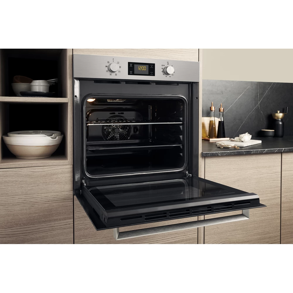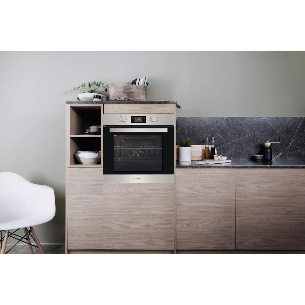 Ariston 66 – Litres Oven With Fan, A Built-in Electric Oven With Self Cleaning Function, Stainless Steel – Italy. Multifunction Oven 60cm Built-In Electric Oven Diamond clean cleaning system 66 ltr – embosed cavity Number of functions: 5 traditional functions + 2 expert recipes Electronic with knob 1 grid, 1 tray Technical Info: Energy Class: A Usable volume capacity: 66 Supply Voltage (V): 220-240 Supply Frequency (H): 50-60 Product Dimension: H 595 mm W 595 mm D 551 mm Number of functions 8 Number of cleaning fuctions 1 Number of traditional functions 5 Number of special fuctions 2