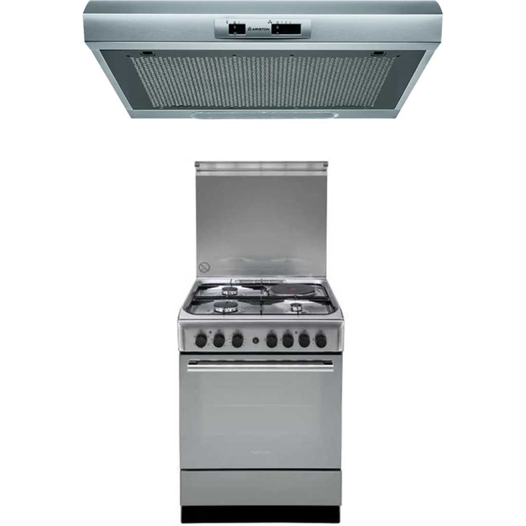 Ariston Cooker A6MSH2F(X) 60cm; 3 Gas, 1 Electric Hot Plate, Electric Oven, Timer, Electric Grill, Rotiserrie And Ariston 60cm Cooker Hood. Key Features: Ariston Cooker A6MSH2F(X) 60cm; 3 Gas, 1 Electric Hot Plate, Electric Oven, Timer, Electric Grill, Rotiserrie And Ariston 60cm Cooker Hood. Ariston Cooker A6MSH2F 6ocm wide, 60cm depth, 85cm high 3 Gas Hobs 1 Electric Hotplate Electric Multifunction Oven Oven & Grill Mechanical Timer (Minute Minder) Gas Safety feature for gas hobs Durable Control Knobs with Clear Indicative Rings Heavy-Duty Pan Rest/Stand or Top Grills See-through Oven Door Glass Warming Drawer Rotisserie Thermostat Stainless Steel Finishing Auto Ignition Hob Flame Failure Device Rapid Hot Plate Mechanical control High Efficiency burners Tangential Ventilation Close pipes burners Injector type Full Glass Oven Door Hydro Assist Cleaning System Made in Poland 1-year FREE Ariston warranty Free Standing Hood 60cm Visor Hood Slider Washable Filter IEC extraction 250.0 (m³/h) Sound level 62 dB(A) No. of speeds: 3 halogen lights x 20 Watt 2 Self Supporting Aluminium filters Dishwashers friendly filters Supply Voltage: 220-240 Supply Frequency: 50/60 Absorbed Power (W): 200 Product Dimension: H 13.23 cm W 60.0 cm D 51.2 cm