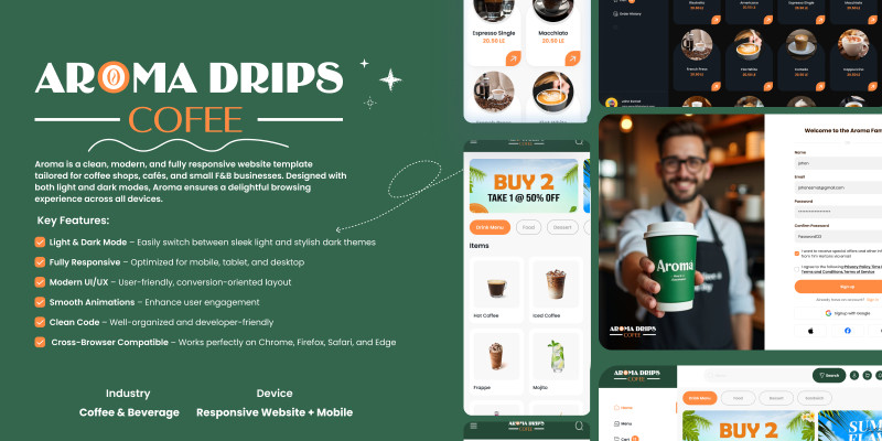 Aroma Drips - React Drinks Ordering Template. a sleek, lightning-fast ordering system that makes customers fall in love with your drink menu, reliable