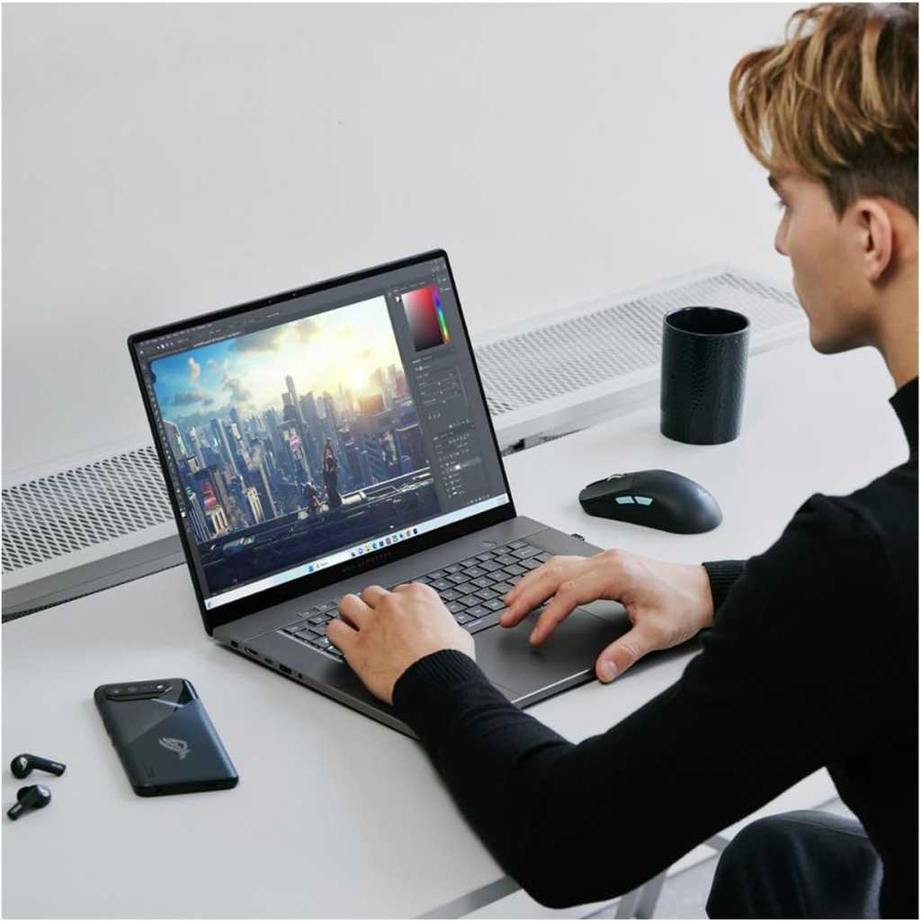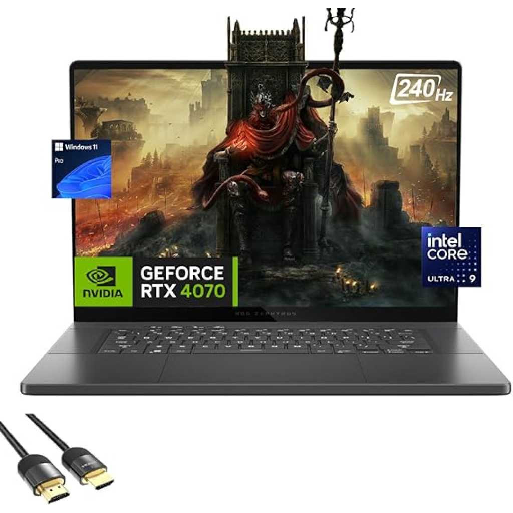 Key Features: ASUS ROG Zephyrus G16 Gaming Laptop, 16″ OLED 240Hz Display, Core Ultra 9 185H (Up to 5.1GHz), GeForce RTX 4070, 16GB DDR5, 2TB PCle 4.0, WiFi 6E, Backlit KB, TB 4, HDMI, PDG HDMI Cable, Win 11 Pro AI-powered – Boost your productivity with the Core Ultra 9 185H processor. This processor is equipped with integrated AI accelerators, prepared to leverage the most recent advancements in technology. Its specific Neural Processing Unit (NPU) cores enable AI to lower power usage, thereby extending battery life during continuous AI tasks. Initiating Visual Imagery – Enhance your visual journey with the Zephyrus G16, equipped with an OLED ROG Nebula Display. Experience lightning-fast 0.2ms response times, bright 2.5K resolution, and a seamless 240Hz refresh rate. With NVIDIA G-SYNC, say goodbye to visual tearing, stuttering, and reduced input lag Engineered for Optimal Gaming Performance – Enhance gaming and creativity with the NVIDIA GeForce RTX 4070 laptop GPU, featuring a max TGP of 115W. Enjoy DLSS 3.5 and ray tracing for lifelike graphics and an immersive gaming experience Introducing Copilot in Windows – your AI-powered assistant for quick answers, creative inspiration, and focused tasks. Boost productivity with instant responses, image generation, and more. Elevate your Windows 11 experience and unleash your creativity Multiple Ports Available – Connect your laptop with other devices. 2x USB Type-A, 2x Type-C, 1x HDMI, 1 x SD Card Reader, 1x Headphone/microphone combo