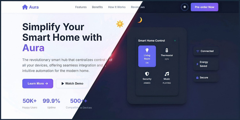 Aura - Smart Home Landing Page Template . Responsive smart home landing page with Dark & Light mode, clean code, and modern design.