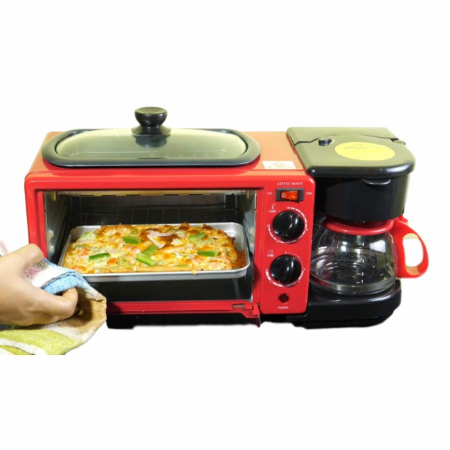 Avinash Home Multi-functional Breakfast Maker-Black. Good things come in small packages. This appliance has got a variety of unique, trivial, and vital functions that could bring more value to any ordinary breakfast . It can make sandwiches, deep fry, great coffee, warming, and plenty others. Start your mornings with this 3 in 1 Breakfast Maker! Enjoy coffee, toast, and eggs all prepared by one space-saving appliance. The oven has a 15-minute timer, temperature control setting, and indicator light. The coffee maker has a 4-cup capacity, swing-out filter compartment, and pauses ‘n serve anti-drip feature. The griddle has a 6-inch diameter frying griddle and uses energy and heat from the toaster oven and is perfect for frying eggs and other breakfast foods