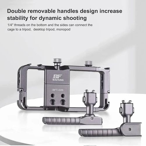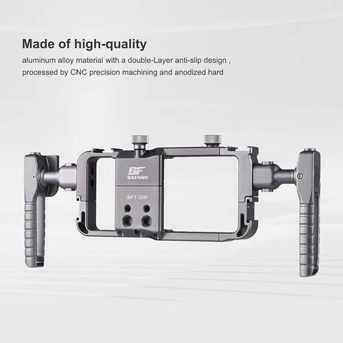 Product Description [UNIVERSAL PHONE CAGE]: Designed for smartphones 58-90mm wide, providing a comfortable handheld video recording experience. [DUAL HANDLES DESIGN]: Record smooth videos easily with detachable side handles for added stability. [PROTECTIVE SILICONE PADS]: Anti-slip coverings prevent phone falls and scratches, ensuring device safety. [MULTIPLE EXTENSION PORTS]: Four cold shoe mounts allow for customization with various accessories like LED lights and microphones. [PREMIUM ALUMINUM ALLOY]: High-quality material with double-layer anti-slip design for durability and professional video recording. Spec: Color: Black/ Grey(optional) Material: Aluminum Alloy Compatible Phone Width: 58-90mm Package List: 1 * Phone Cage 2 * Handles 1 * Remote Shutter 1 * User Manual