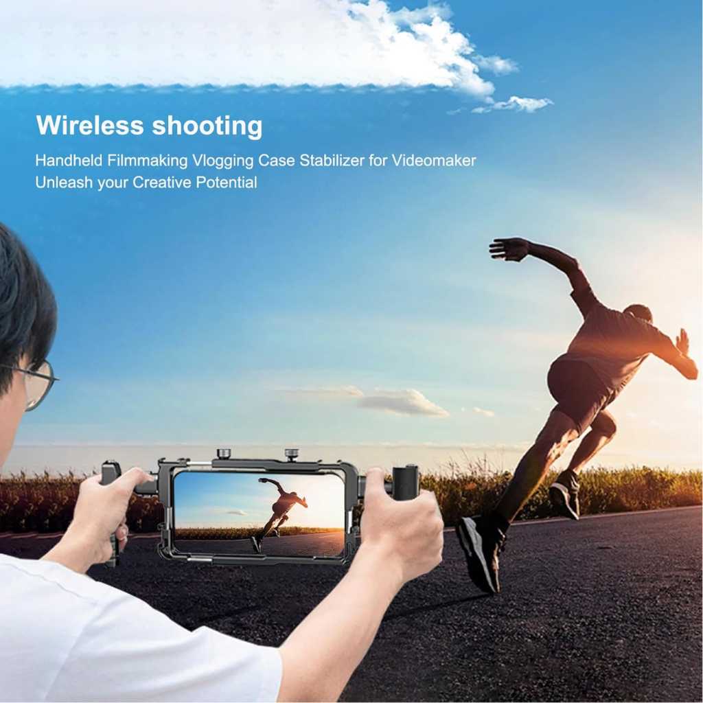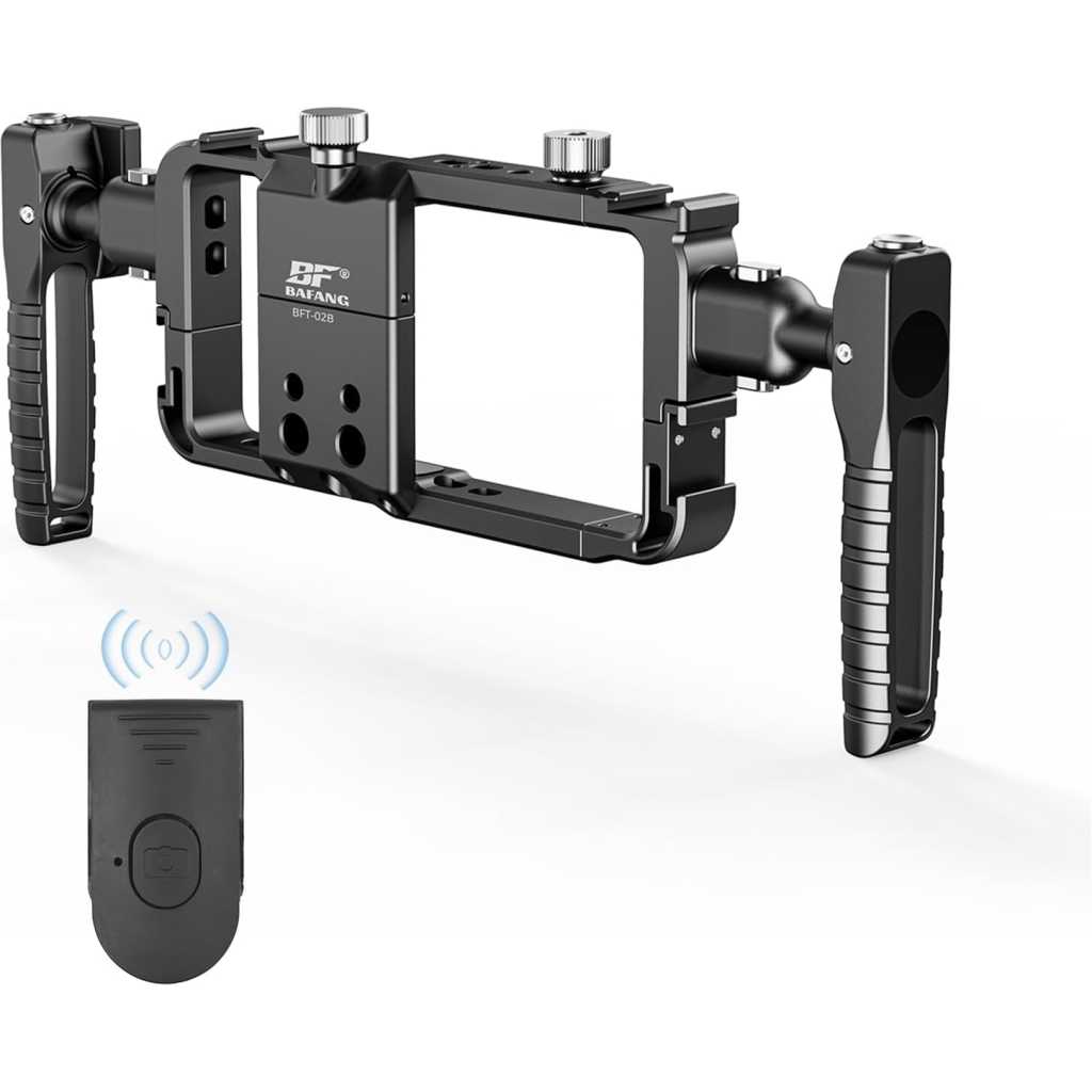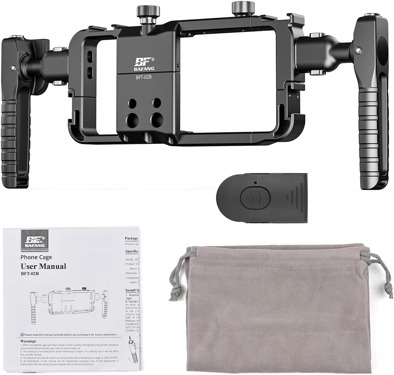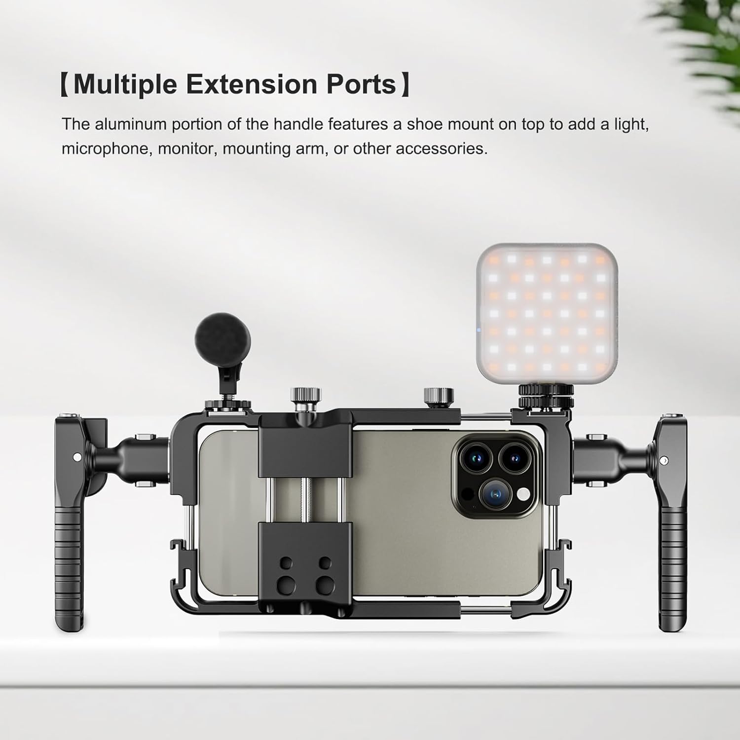 Universal Phone Cage: The phone cage designed for smartphones with a width of 58-90mm, can provide a comfortable and weight handheld video recording experience. Dual Handles Design: Comes with dual side handles, you can use this phone cage to record smooth vid stably and easily. And the side handle can be detached and used as a handle conveniently. With ive Silicone Pads: The phone video cage has -slip silicone coverings to the phone from falling off and it from scratch. Mulle Extension Ports: The phone video rig has four cold shoe mounts that allows you to add a LED fill , microphone, monitor or other accessories to make your video recording more professional. Premium Aluminum Alloy: The phone video cage is made of high-quality aluminum alloy material with a -Layer -slip design, processed by precision machining and anodized hard. Features: Universal Phone Cage: The phone cage designed for smartphones with a width of 58-90mm, can provide a comfortable and weight handheld video recording experience. Dual Handles Design: Comes with dual side handles, you can use this phone cage to record smooth vid stably and easily. And the side handle can be detached and used as a handle conveniently. With ive Silicone Pads: The phone video cage has -slip silicone coverings to the phone from falling off and it from scratch. Mulle Extension Ports: The phone video rig has four cold shoe mounts that allows you to add a LED fill , microphone, monitor or other accessories to make your video recording more professional. Premium Aluminum Alloy: The phone video cage is made of high-quality aluminum alloy material with a -Layer -slip design, processed by precision machining and anodized hard. Specifications: Color: Black Material: Aluminum Alloy Compatible Phone Width: 58-90mm Package List: 1 * Phone Cage 2 * Handles 1 * Remote Shutter 1 * User Manual Key Features: [UNIVERSAL PHONE CAGE]: Designed for smartphones 58-90mm wide, providing a comfortable handheld video recording experience. [DUAL HANDLES DESIGN]: Record smooth videos easily with detachable side handles for added stability. [PROTECTIVE SILICONE PADS]: Anti-slip coverings prevent phone falls and scratches, ensuring device safety. [MULTIPLE EXTENSION PORTS]: Four cold shoe mounts allow for customization with various accessories like LED lights and microphones. [PREMIUM ALUMINUM ALLOY]: High-quality material with double-layer anti-slip design for durability and professional video recording.