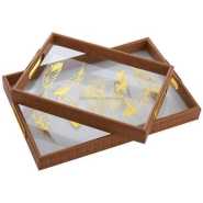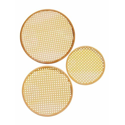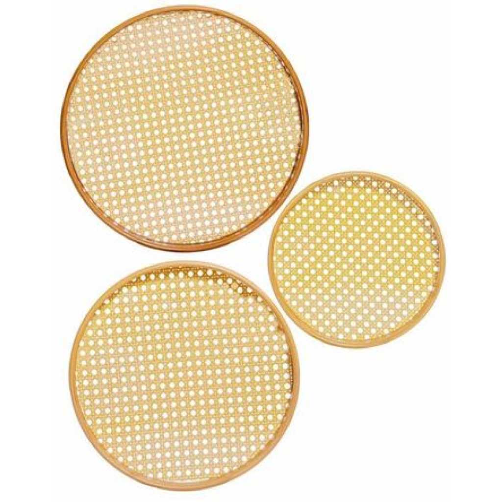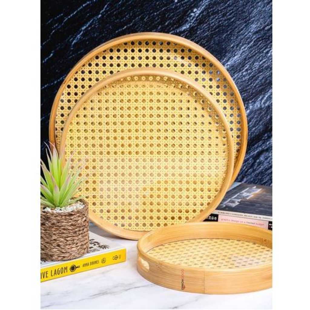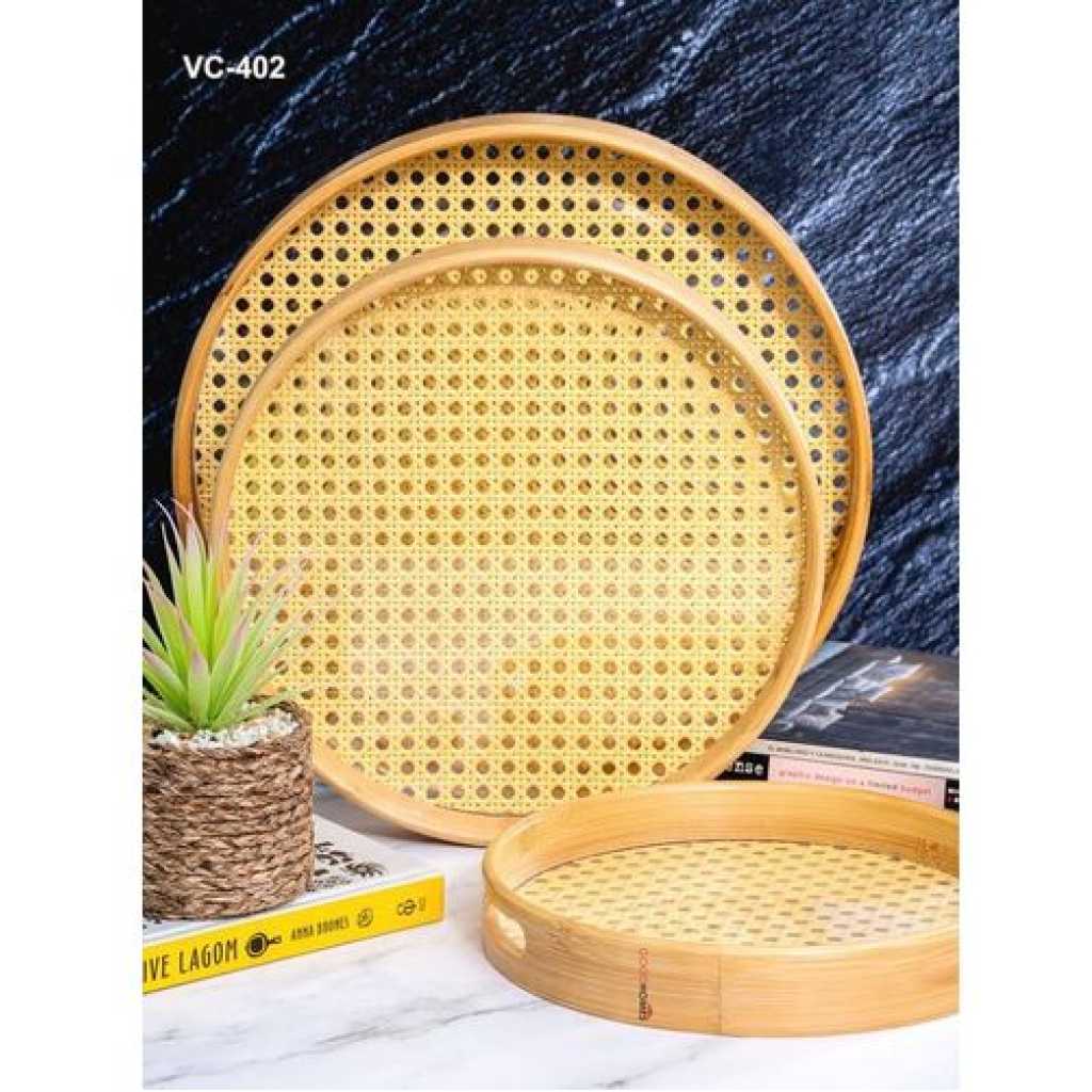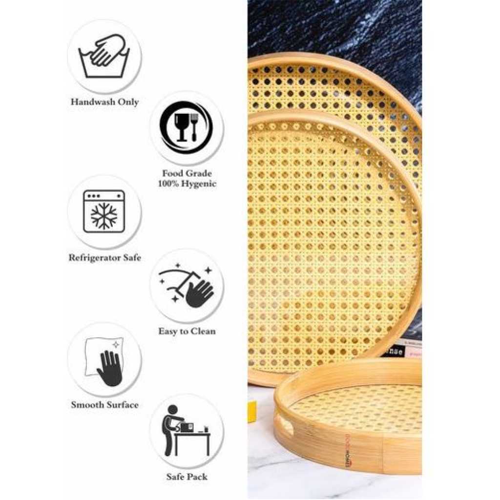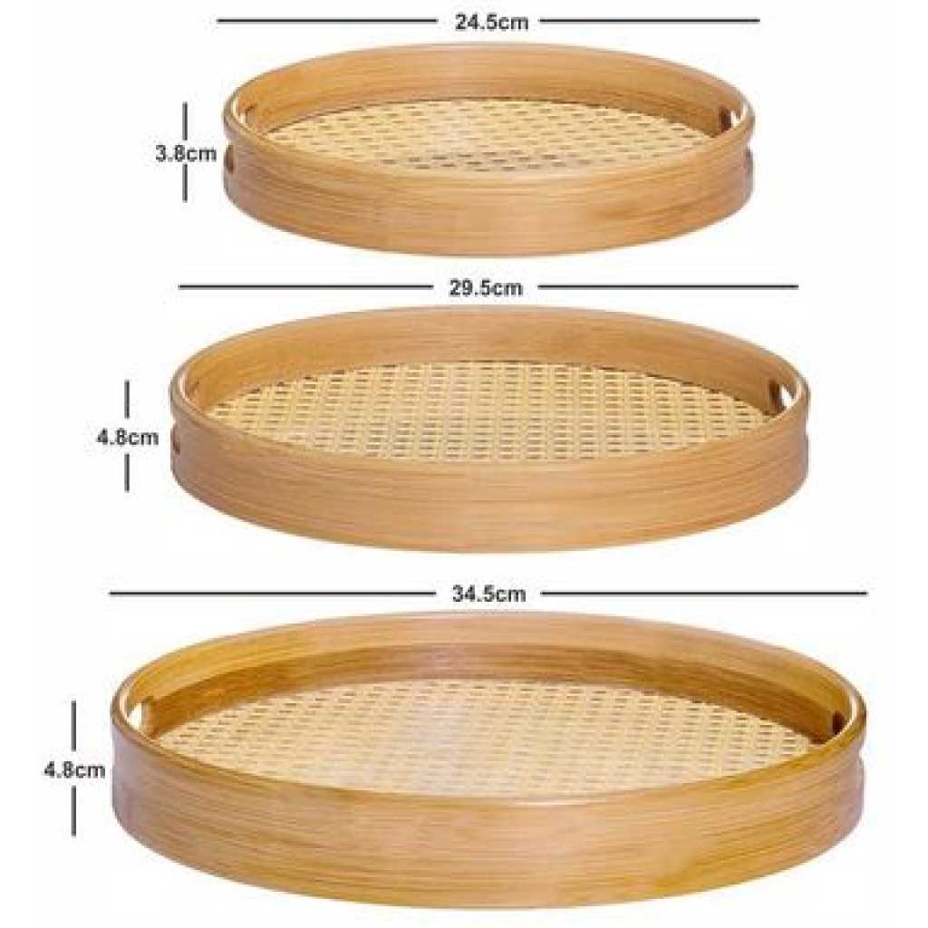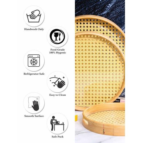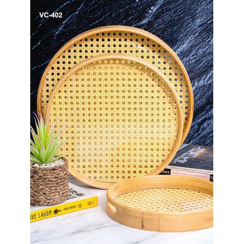 Bamboo Wooden Round Serving Tray Set of 3pcs- Cream This set of beautiful round wooden trays with an acrylic base and easy-to-grip handle is a practical yet stylish addition to any kitchen and adds a chic element to serving a variety of things. Key Features: Bamboo Wooden Round Serving Tray Set of 3pcs- Cream Product Type: Tray, Product Shape: Round, Product Material: Wooden Measurement -: Large : H-4.8cm, Round-34.5cm, W-586gm, Medium : H-4.8cm, Round-29.5cm, W-402gm, Small : H-3.8cm, Round-24.5cm, W-292gm Hand wash only, Food Grade 100% Hygenic, Refrigerator safe With so many serving options, this durable and easy-to-clean tray offers a handy yet modern element to any kitchen and will be a great addition to your serving ware. In the box: 3pcs, Color: Cream