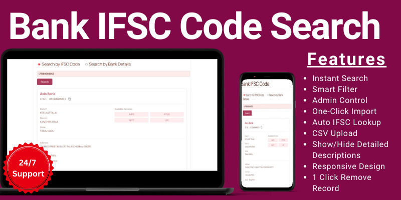 Bank IFSC Code Search WordPress. Search IFSC codes, bank names, and branches instantly. Includes CSV import, manual entry, and admin controls. Fully responsive.