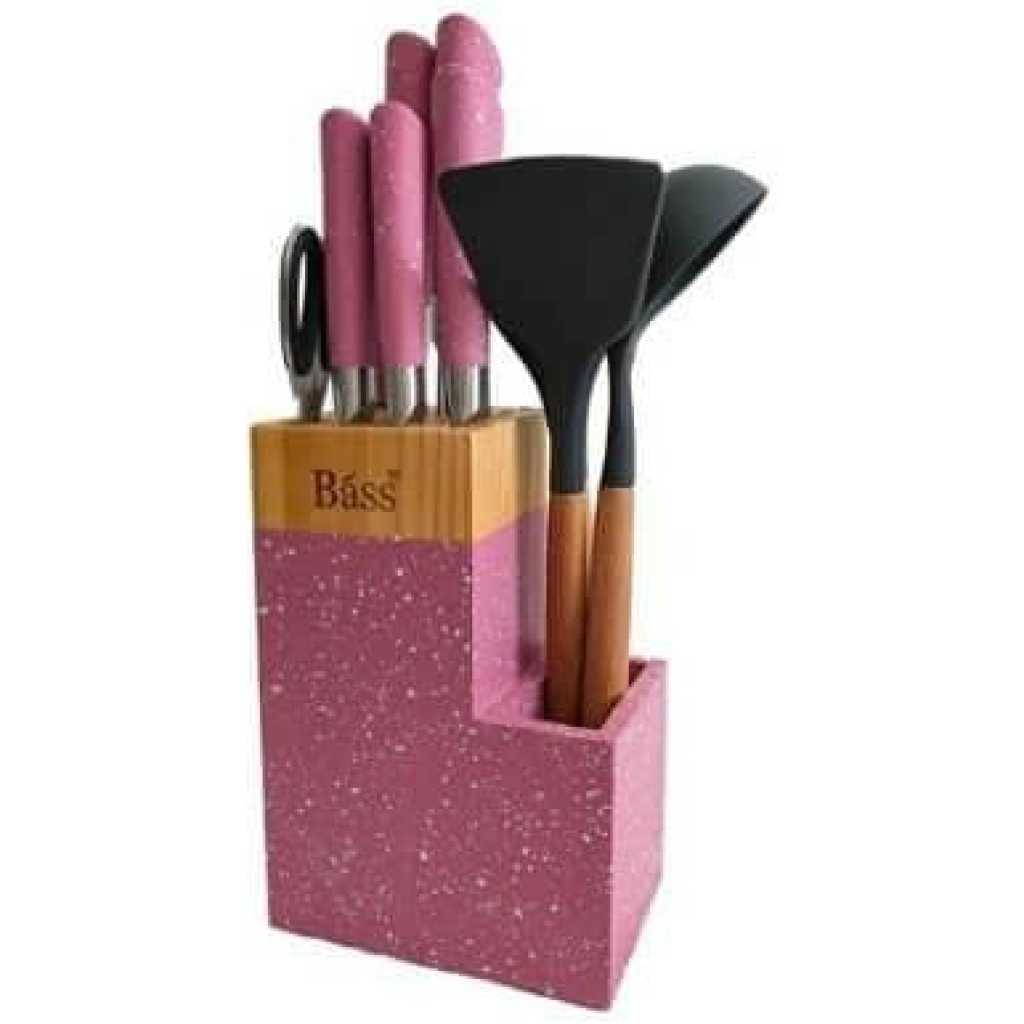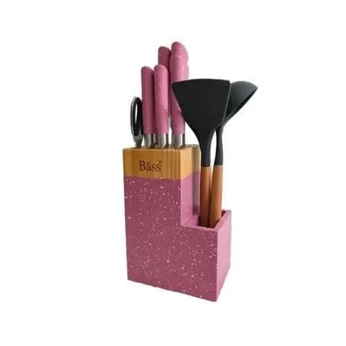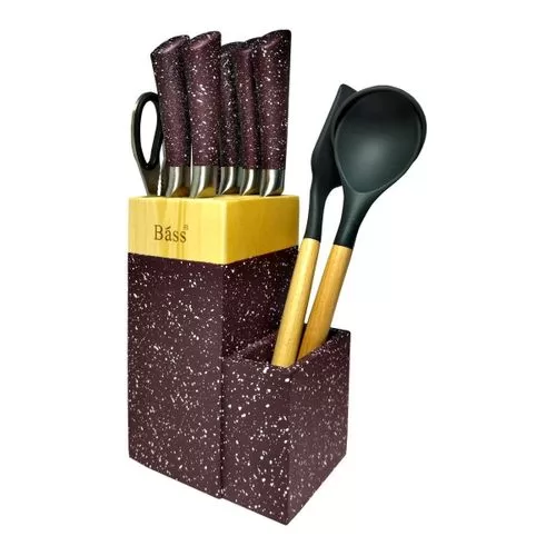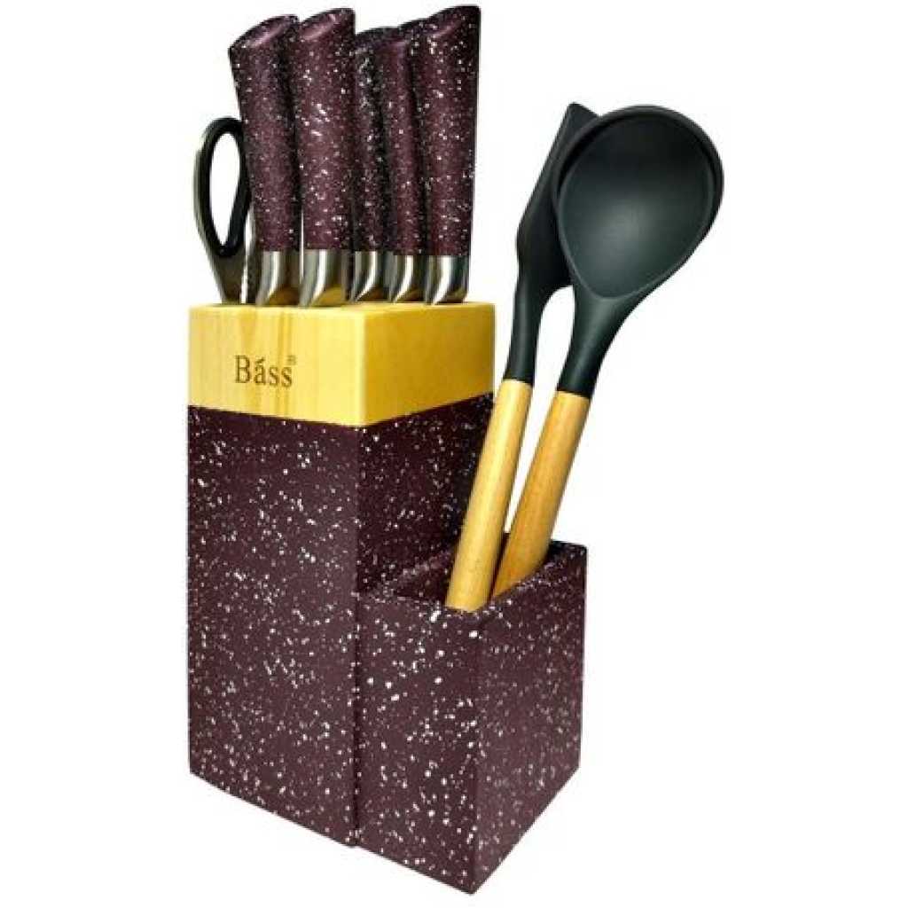 Bass 11 Piece Stainless Steel Modern Knife Set On Bamboo Block Stand And Non-Stick Spoons Utensil Set With cleaver Scissors Bread Knife Steak Knife Sharpener- Multicolor