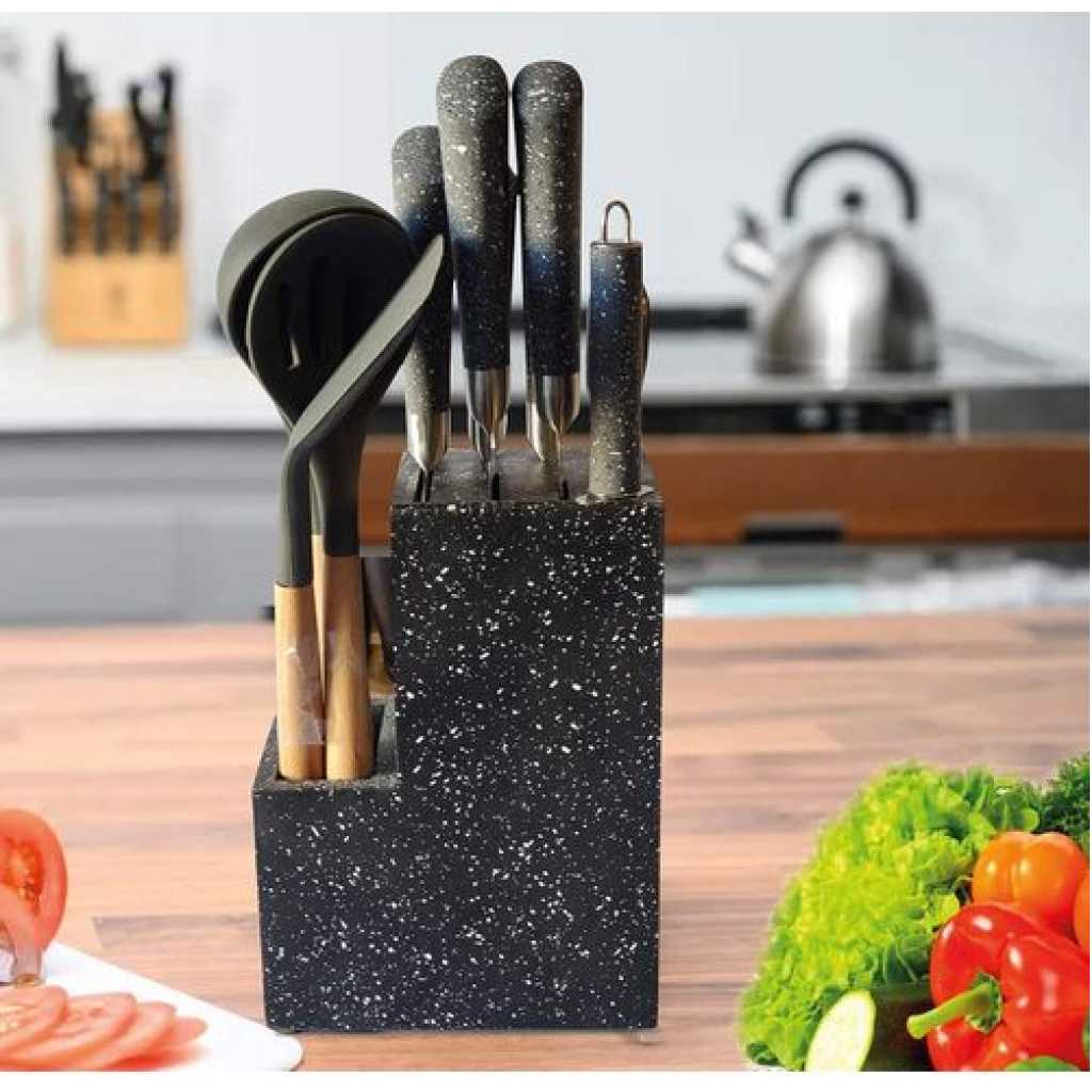 Our high-quality knife set offers the right knife for any task. The blades are made from stainless steel and the handles have a protective TPR coating. – Chef Knife: A multi-functional knife with a curved blade allowing the user to rock the knife for more precision. Its sharp edge cuts, chops and slices any kind of produce with ease. – Carving Knife: Intended for cutting smaller and thinner slices of meat and fish. – Bread Knife: Its scalloped and serrated blade cuts bread, burgers and pizza clean and effortless. – Utility Knife: It is designed to cut all types of fruits and vegetables and remove fat or sinew from meat. – Paring Knife: This knife is perfect for peeling, trimming, and segmenting fruits and vegetables. – Steak Knives: Fully serrated blade increases cutting efficiency. – Cheese Knife: Purpose designed for slicing and serving cheese. – Pizza Knife: This knife has a curved serrated blade which makes it ideal for slicing pizza. – Sharpening Steel: In order to ensure that these knives maintain their high level of sharpness the set includes sharpening steel. – Knife Stand: This stand holds all the knives in this set and keeps your kitchen clean and orderly. Internal enclosures prevent damage to the blades. – Scissors: These Scissors can be separated into 2 parts to make them more easily stored should you not wish to use the stand.