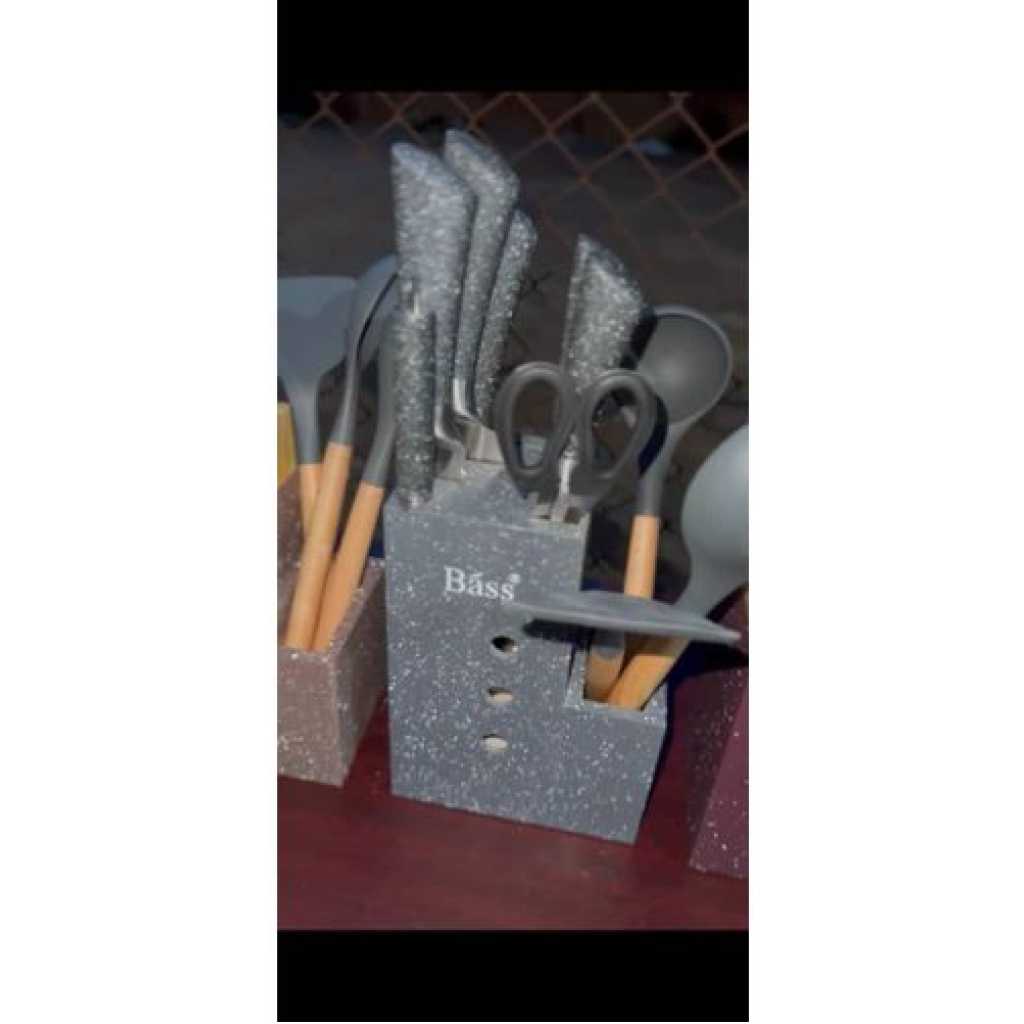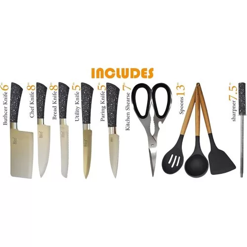 Key Features: Premium Quality: First Quality Stainless Steel and Very Sharp Gift Box: Beautifully Gift Boxed and This will make a great gift! Safety: Dishwasher Safe Design: This unique design of 11 piece set of Bass Stainless Steel knives will provide you with 5 beautiful knives in a Stainless Steel block Complete Set: This beautiful set of knives is sure to compliment your kitchen perfectly