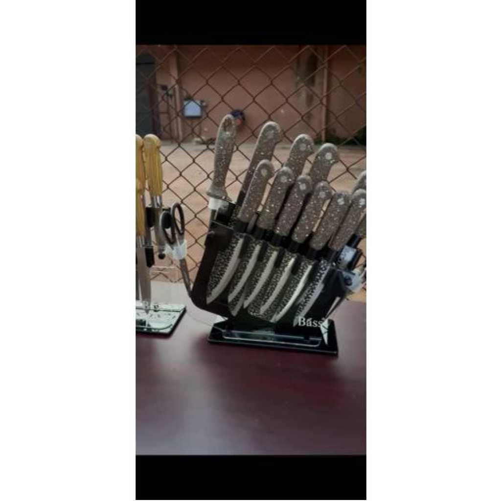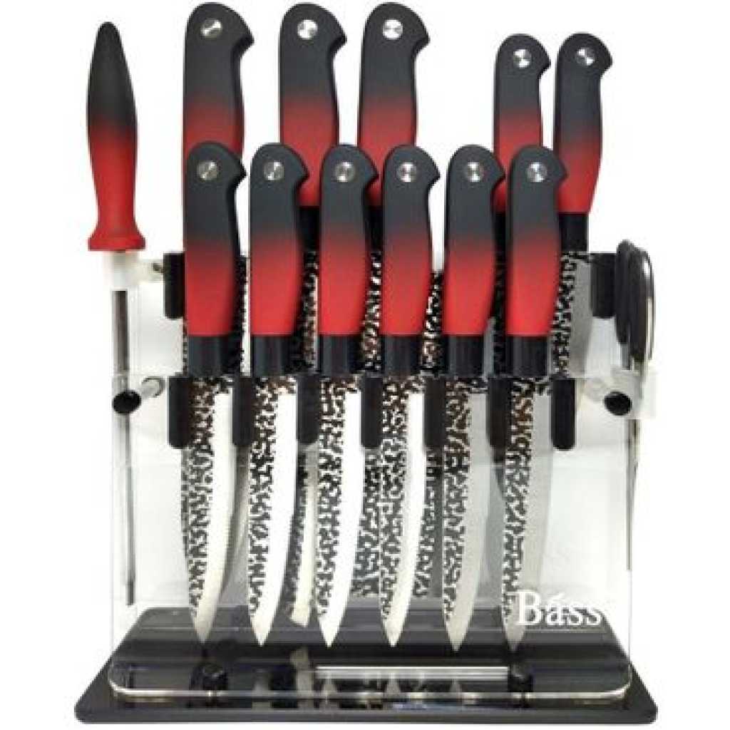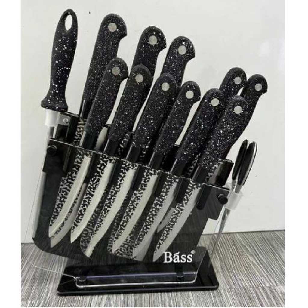 Bass 14 Piece Professional Set of kitchen knives Soft Touch Coated Handle Includes Sharpener, Stand & Vegetable Peeler, Ultra Sharp Cutlery for Cutting and Cooking- Multicolor