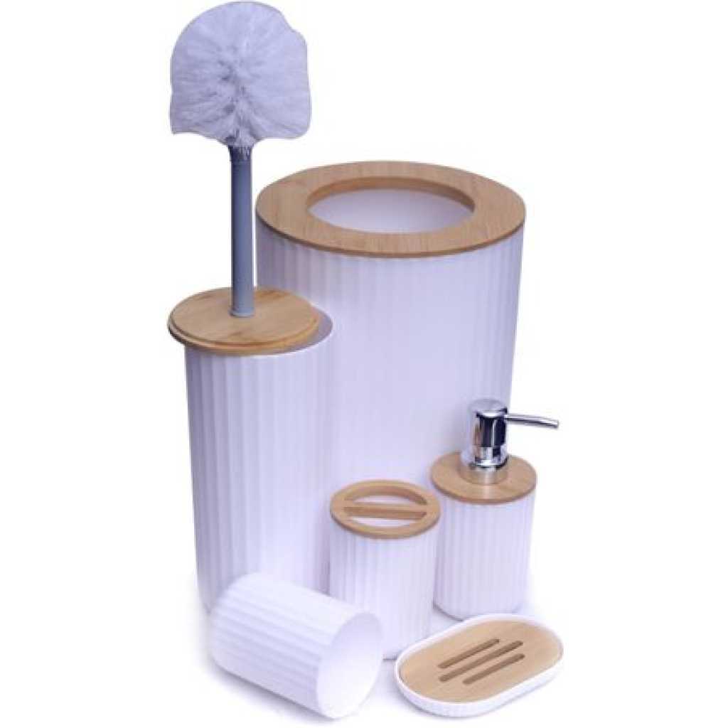 Key Features: Bathroom Accessories Set, Bathroom Wash Set, 6 Pieces Waste Bin Toilet Brush Holder Toothbrush Holder Cup Soap Dispenser Soap Dish Bathroom Accessories Gift Set- Multicolor Elegant Design: Take your bathroom decor to stylish new heights with this bathroom accessories set, very stunning and a great touch of extra elegance to the bathrooms, perfect for giving as a gift for a housewarming or a wedding. Freestanding: The base is plat and they can all stand on the countertop freely and stablely.The toilet brush has a long handle for easy grip and will keep you from dirt. Bathroom Accessories Set: One set containing 6 pieces of bathroom accessories, including a toothbrush holder, toothbrush cup, soap dispenser, soap dish, toilet brush holder, and trash can, you will get all you need for your bathroom. High-Quality Material: Made of bamboo wood and plastic material, Eco-friendly and odorless, durable to use. Wide Application: Suitable for home, bathroom, dormitory, hotel, apartment, washing room, basement, RV and etc. No matter it is for your families and friends, or for your colleagues and customers, this set is the perfect present.