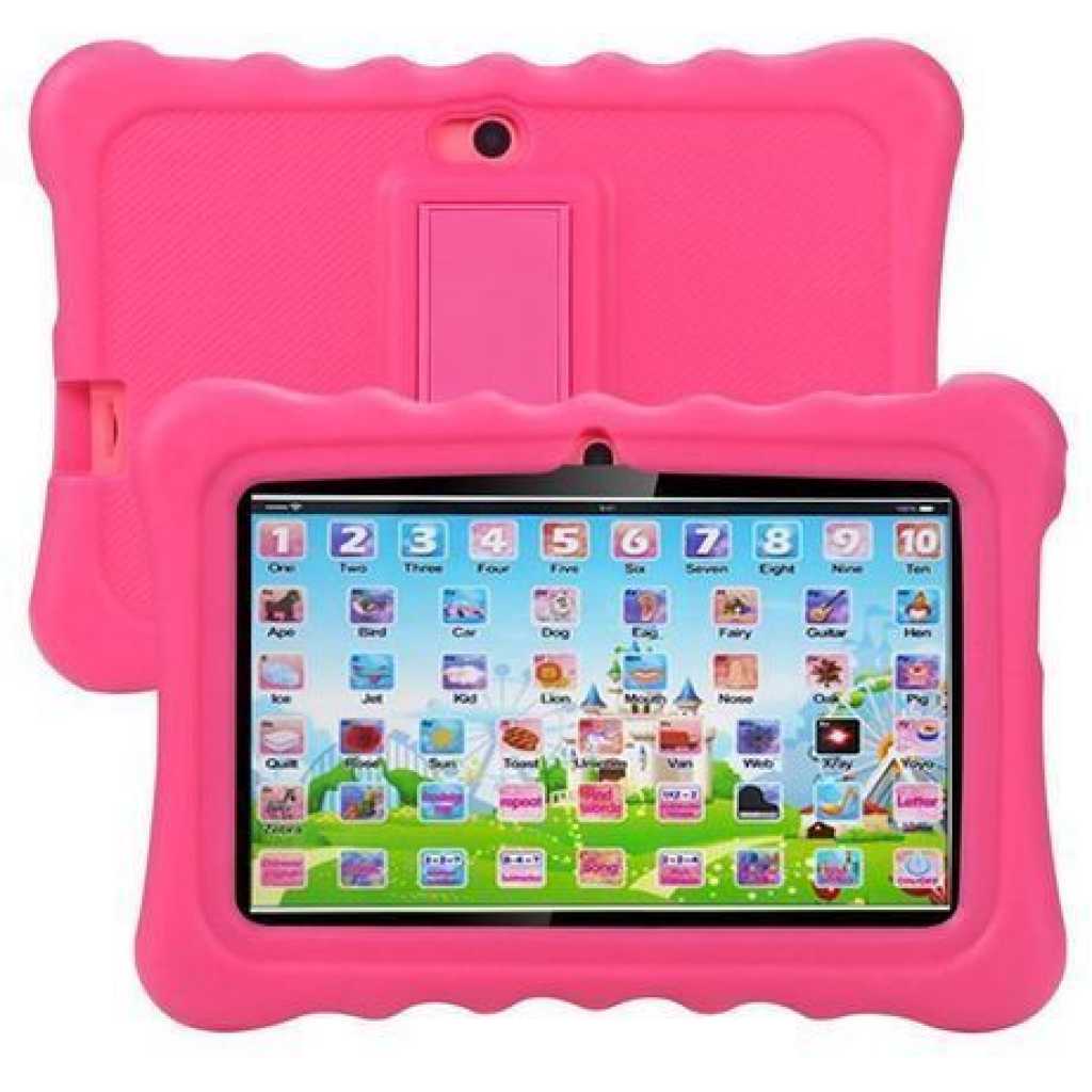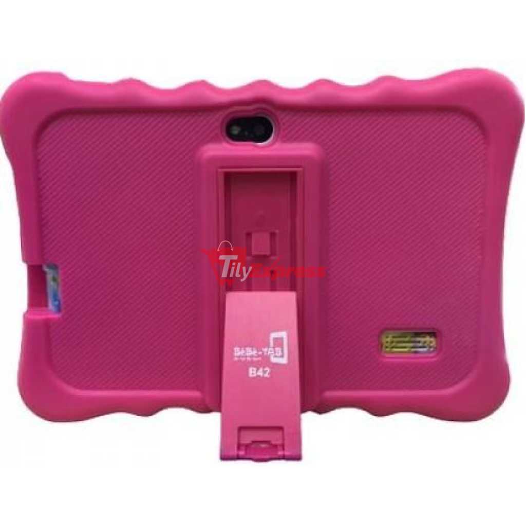 Bebe Kids Gaming Learning Tab – Pink. NOTE: Suitable for children below the age of 5 years. Screen Size Its a 7 inch screen tablet which is handy for children below 5 years since they have small hands Storage and Ram The tab comes equiped with 32gb Internal memory and 2gb ram, giving the user space enough for their educational videos, games and also their pictures to keep them entertained throughout the day. The 2gb Ram is also handy to ensure that the tab does not buffer as they are using it. creating a more friendly environment for them to enjoy their childhood. Connectivity The tab has different connection modes through which you can add information to it. These modes are;- The tab connects to the internet via WiFi to give the child access to youtube, play store and other services that require internet, it does not use sim cards. It is also bluetooth enabled to connect to the different audio output devices or to allow you send information to the tab from other devices. It also connects to other devices via USB ; this allows you to transfer files to and from the tab. Protection The tab comes with a very strong rubber cover to protect the tab from the unendless drops that may occur during its time of use. The cover slightly protrudes over the screen to protect the front part of the tab as well. This offers an all round protection to the tab.Also the cover has a standing support that enables the child to work with it while not touching it. This also helps protect the tab from unnecessary falls Applications This tab comes with preinstalled applications to kick start the use of the tab. It also has Play Store for you to add more applications to it with no limits. Free yourself, give your child a tab that will give them a chance to learn as they grow. Key Features: Bebe Kids Gaming Learning Tab – Pink. 7 inch screen Comes with a cover 32gb internal memory 2gb ram Comes pre loaded with some kids entertainment