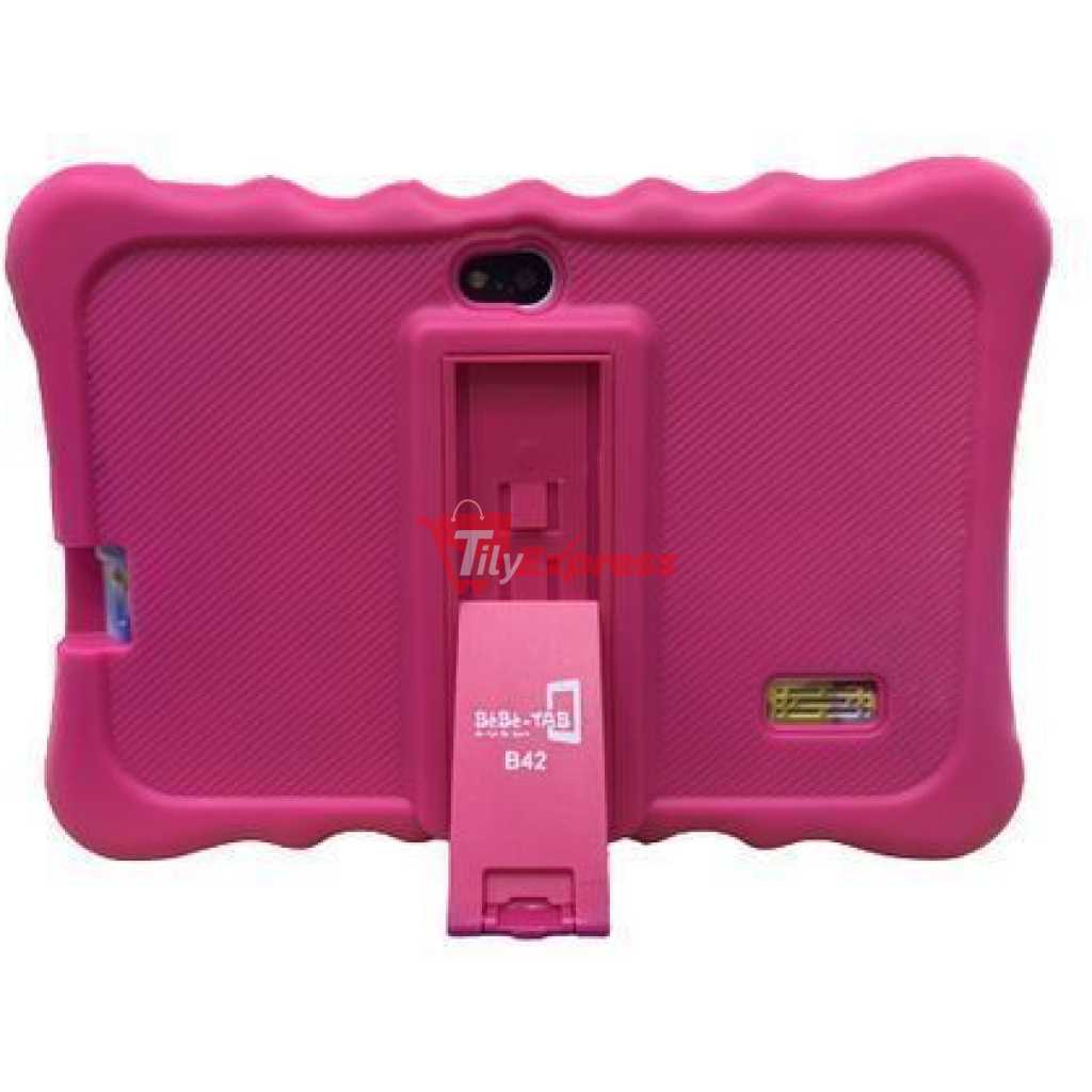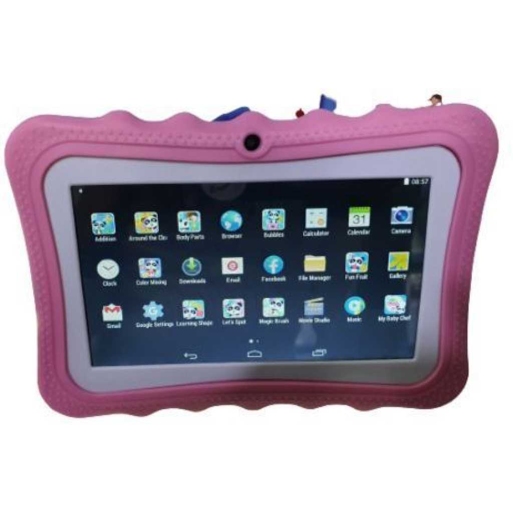 Bebe Kids Gaming Learning Tablet 3GB, 32 GB – pink. City Hall K7 Learning tab NOTE: Suitable for children below the age of 5 years. Screen Size Its a 7 inch screen tablet which is handy for children below 5 years since they have small hands Storage and Ram The tab comes equiped with 32gb Internal memory and 2gb ram, giving the user space enough for their educational videos, games and also their pictures to keep them entertained throughout the day. The 2gb Ram is also handy to ensure that the tab does not buffer as they are using it. creating a more friendly environment for them to enjoy their childhood. Connectivity The tab has different connection modes through which you can add information to it. These modes are;- The tab connects to the internet via WiFi to give the child access to youtube, play store and other services that require internet, it does not use sim cards. It is also bluetooth enabled to connect to the different audio output devices or to allow you send information to the tab from other devices. It also connects to other devices via USB ; this allows you to transfer files to and from the tab. Protection The tab comes with a very strong rubber cover to protect the tab from the unendless drops that may occur during its time of use. The cover slightly protrudes over the screen to protect the front part of the tab as well. This offers an all round protection to the tab.Also the cover has a standing support that enables the child to work with it while not touching it. This also helps protect the tab from unnecessary falls Applications This tab comes with preinstalled applications to kick start the use of the tab. It also has Play Store for you to add more applications to it with no limits. Free yourself, give your child a tab that will give them a chance to learn as they grow.