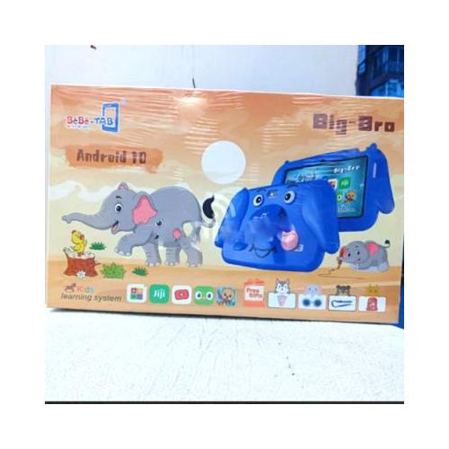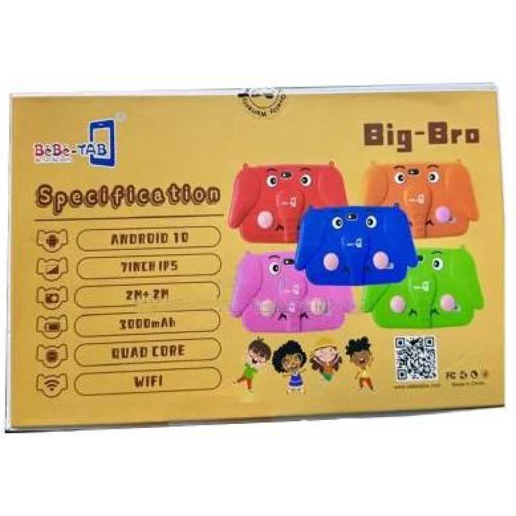 Amazing LCD Display This tablet has a 7 inch Immersive Display ( 1024 x 600 pixels resolution ) with symetric bezel for un-interrupted visual experience for gaming, watching videos, multi-tasking and more BEST GIFT FOR KIDS: Latest IWAWA software, up to 20 pre-installed parent-control free kids apps (including Youtube, Surf-web, Gmail, Voice search, etc), educational games, books, music, and movies, and many more download from installed Google Store; Iwawa allows you to manage usage limits, no need to worry about unfriendly content on the internet, kids can get access to fun and games, books, videos, and browsing internet which you choose for them KID-PROOF CASE: High-quality quality soft and lightweight case to feel comfortable hold in hand and meanwhile protect against any drops and bumps caused by kids at play; The case is environment-friendly, sweat-proof, unscented and will do no harm to kids’ health. LEARNING WHEN PLAYING: We believe an exclusive kid tablet will be the best tool to help your kids discover, learn, and grow, educational learning and practice contents are designed just for your kids to learn while having fun Brand: Bebe-Tab Model: Big bro Type: Tablet OS: Android 10 SIM: WiFi Hardware CPU: Quad-core 1.3GHz Processor RAM: 4GB ROM: 128GB Audio Format: MP3, WAV, AAC, eAAC, M4A Video format : MPEG4, H.264, H.265, MOV Connectivity: WiFi, GSM, Bluetooth, GPRS, Sensors: Accelerometer, Proximity, Light, Gyroscope Network WiFi Display Screen Size: 7″ Display Type: IPS Resolution: 1200*820 Camera Front camera: 2 MP with a flashlight Back camera: 5mp with a flashlight Battery Capacity mAh3000mAh In the box: Tablet, Pouch, Charger and Free Gifts