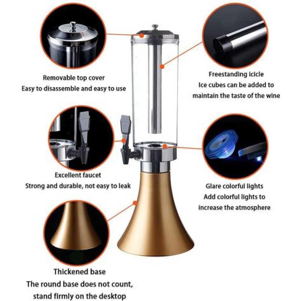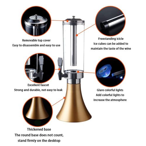 Beer Dispenser Beverage Tower 3L Drinking Water Column with Faucet Level Indicator Beverages Parties Restaurants Bars. looking for some beer tower dispensers for your party, bar, or man cave. ice tube in the center filled with ice to keep drinks cold Built-in led lights to light up with amazing colors.7 colors auto changing. 3.0 L capacity, the weighted base is stability. removable tube for easy use and cleaning. fits beer, cocktails, soft drinks, punch, fruit juice, and beverages. Ready for self-service in any party, sports bars and restaurant, Simply fill a plastic ice tube with water, freeze, (or ice, not freeze), and then place it in your tower for refreshingly chilled beverages. Note: pls add water to the ice tube to the 2/3 percentage. Don’t fill it fully. Otherwise, it will damage the tube, because the water will change to ice and the volume become larger after the water is put into the refrigerator. Material: ABS and AS Dimensions: 20.8*6.7 inch(51×17 cm) 3L Beer Tower Beverage Dispenser with Tap and Ice Tube for Drinking – Silver Key Features: Beer Dispenser Beverage Tower 3L Drinking Water Column with Faucet Level Indicator Beverages Parties Restaurants Bars. It has a creative faucet for easy pouring of the drink. The body is crystal clear. Has a sealed lid design. Practical small funnel. Circular chassis. Gold-tone stand. Can be loaded with 3L of drinks.