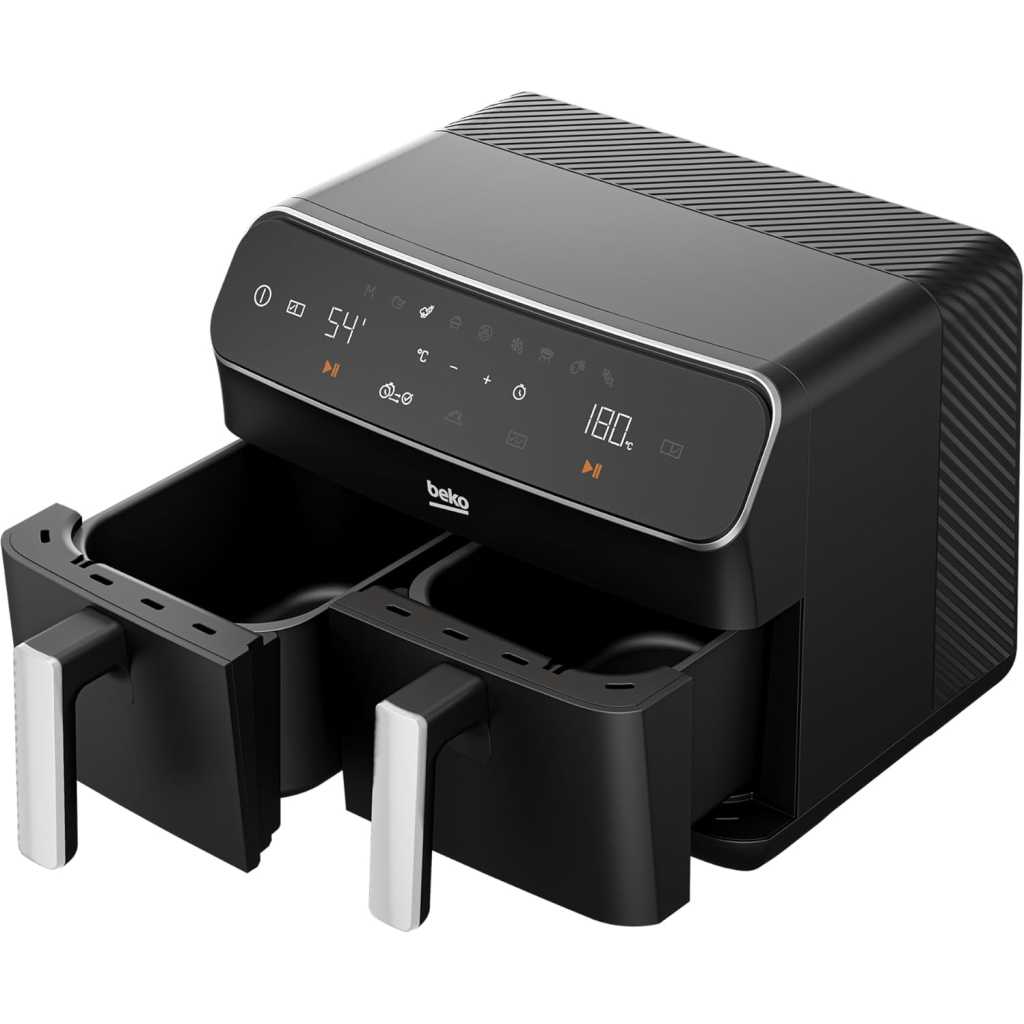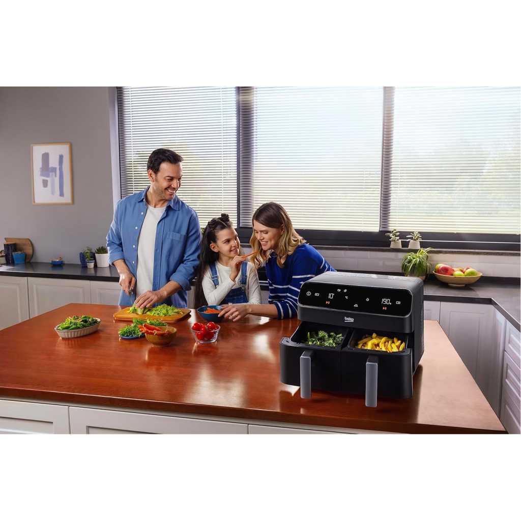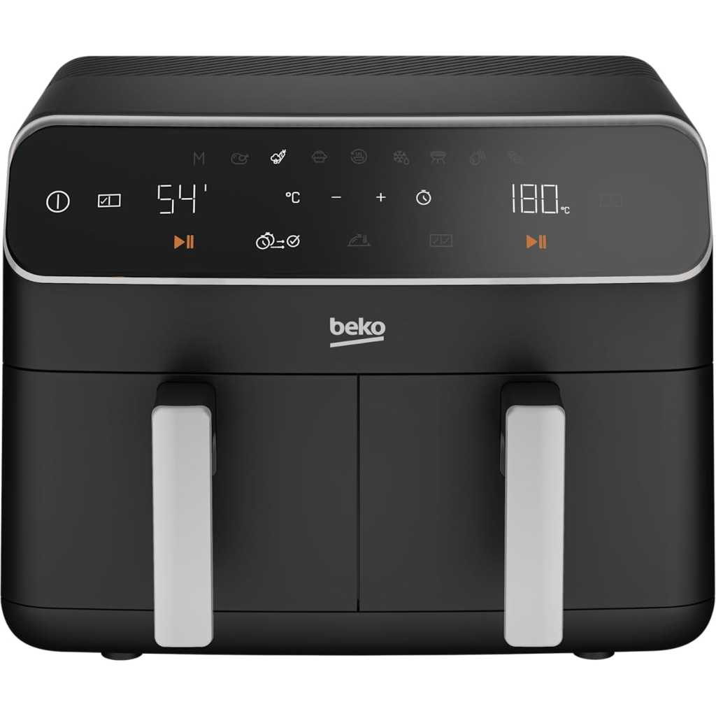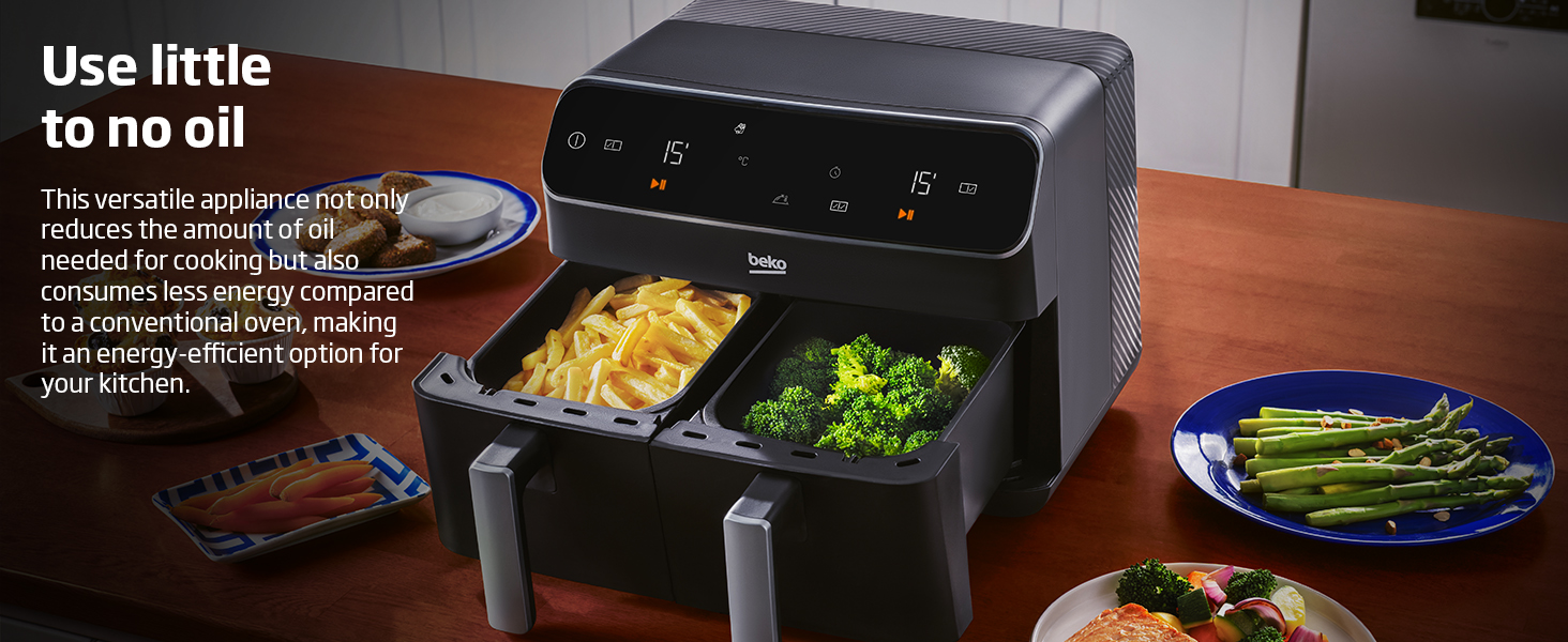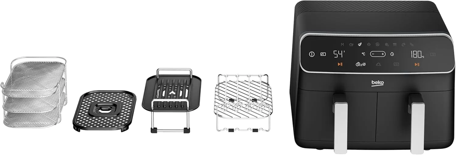 Beko Dual Zone Air fryer ExpertFry FRL5388B | 8.5L Capacity | Smart Finish | Match Cook | Wide LED Screen | 9 Automatic Cooking functions | Dehydrate | Air Fry, Black. From the manufacturer Use little to no oil – This versatile appliance not only reduces the amount of oil needed for cooking but also consumes less energy compared to a conventional oven, making it an energy-efficient option for your kitchen. 8.5L Dual Zone – Thanks to this model’s 8.5L Dual Basket, you can cook two large dishes simultaneously without mixing odours, maximizing your cooking efficiency, and saving time in the kitchen. Dishwasher Safe Accessories – Complete with four dishwasher-safe accessories, including a dehydrating rack, cooking rack, grill, and skewer rack, this stylish air fryer provides convenient and versatile cooking options Smart Finish – Cook two different dishes with ease with the Smart Finish feature. This intelligent programme ensures both dishes are ready at the same time, streamlining your cooking process and saving you time. Match Cook – Achieve perfectly cooked meals every time with the Match Cook feature. By easily copying cooking settings from one side to the other, this programme will save you time while delivering delicious results. Wide LED Screen – Thanks to the wide LED display, you can easily navigate through your Air Fryer’s menu options and temperature settings, making cooking a seamless experience. 9 Automatic Cooking Functions – Featuring 9 automatic cooking functions, including Manual, Grill and Dehydrating, this versatile appliance provides convenient meal preparation with pre-set cooking modes for a variety of dishes.