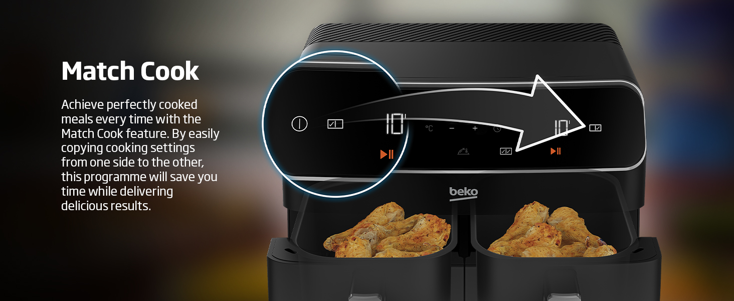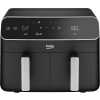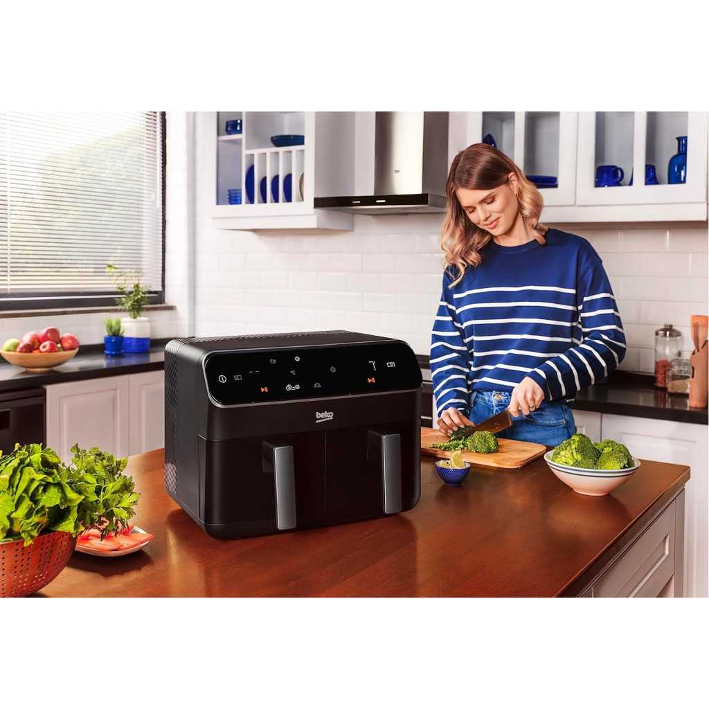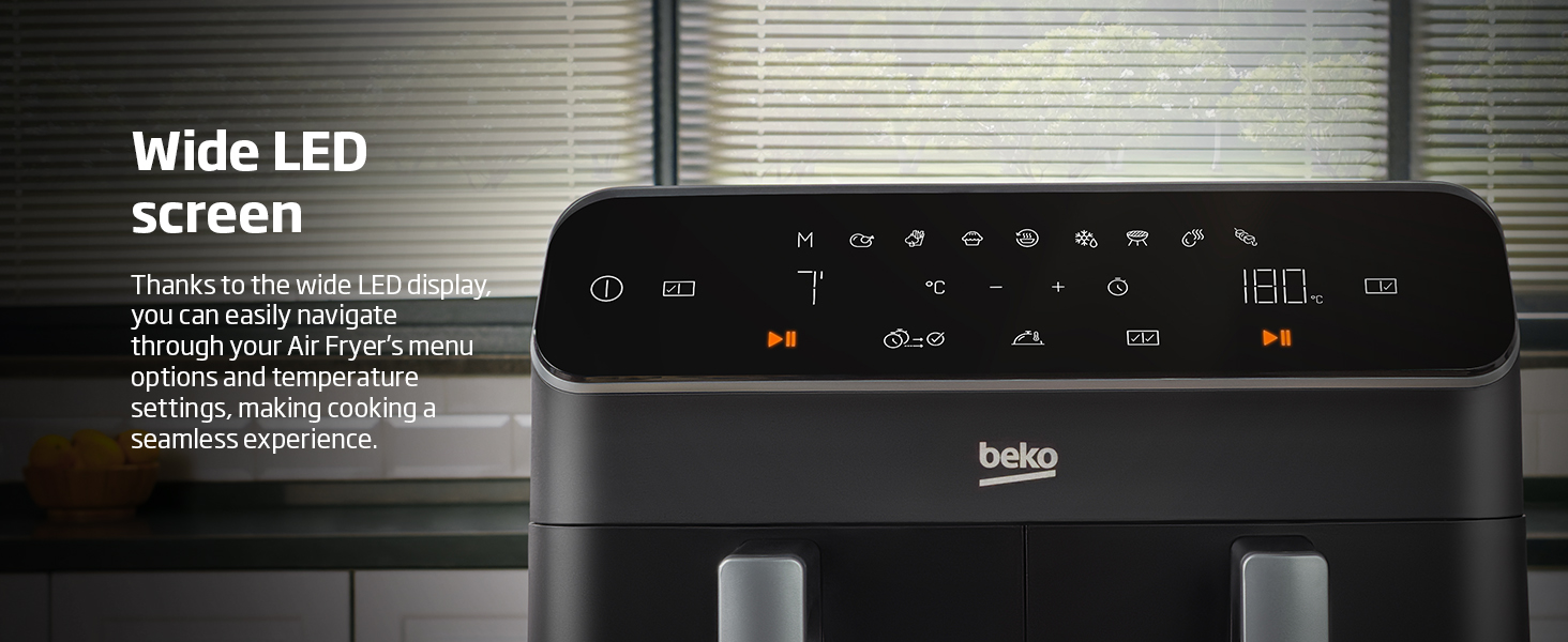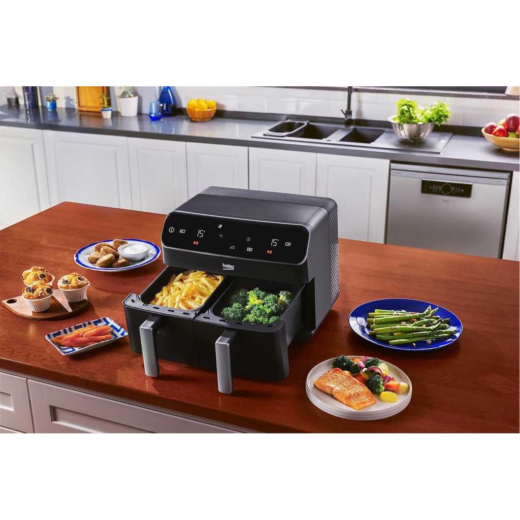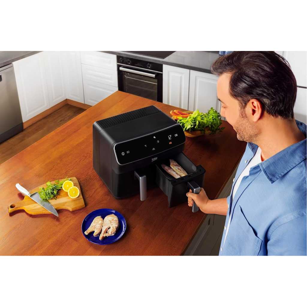 Beko Dual Zone Air fryer ExpertFry FRL5388B | 8.5L Capacity | Smart Finish | Match Cook | Wide LED Screen | 9 Automatic Cooking functions | Dehydrate | Air Fry, Black. From the manufacturer Use little to no oil – This versatile appliance not only reduces the amount of oil needed for cooking but also consumes less energy compared to a conventional oven, making it an energy-efficient option for your kitchen. 8.5L Dual Zone – Thanks to this model’s 8.5L Dual Basket, you can cook two large dishes simultaneously without mixing odours, maximizing your cooking efficiency, and saving time in the kitchen. Dishwasher Safe Accessories – Complete with four dishwasher-safe accessories, including a dehydrating rack, cooking rack, grill, and skewer rack, this stylish air fryer provides convenient and versatile cooking options Smart Finish – Cook two different dishes with ease with the Smart Finish feature. This intelligent programme ensures both dishes are ready at the same time, streamlining your cooking process and saving you time. Match Cook – Achieve perfectly cooked meals every time with the Match Cook feature. By easily copying cooking settings from one side to the other, this programme will save you time while delivering delicious results. Wide LED Screen – Thanks to the wide LED display, you can easily navigate through your Air Fryer’s menu options and temperature settings, making cooking a seamless experience. 9 Automatic Cooking Functions – Featuring 9 automatic cooking functions, including Manual, Grill and Dehydrating, this versatile appliance provides convenient meal preparation with pre-set cooking modes for a variety of dishes.