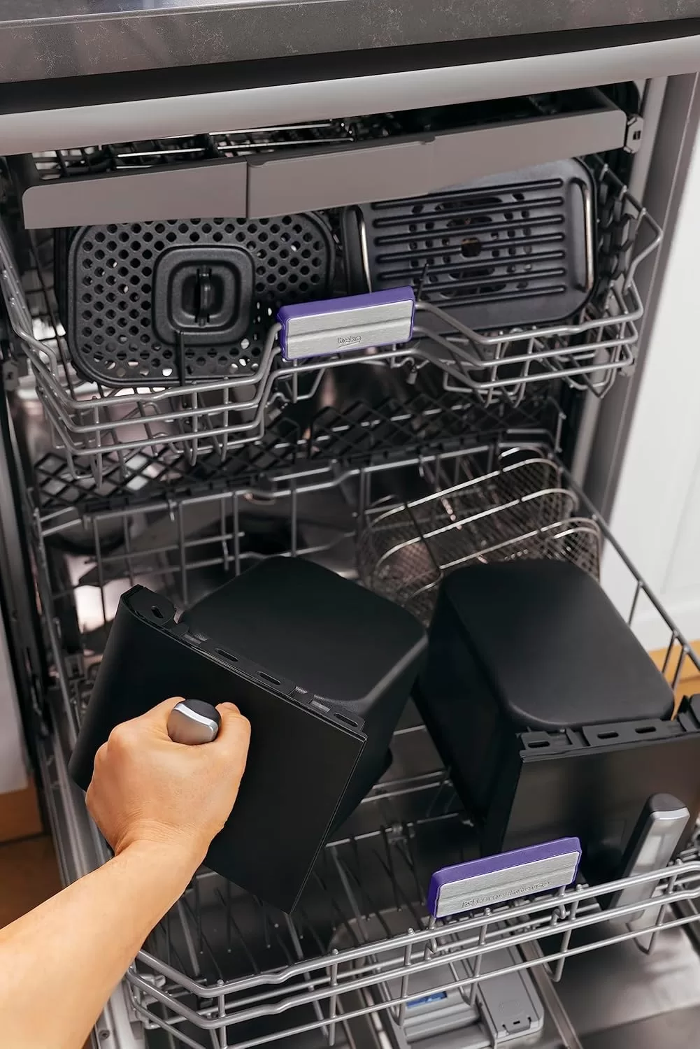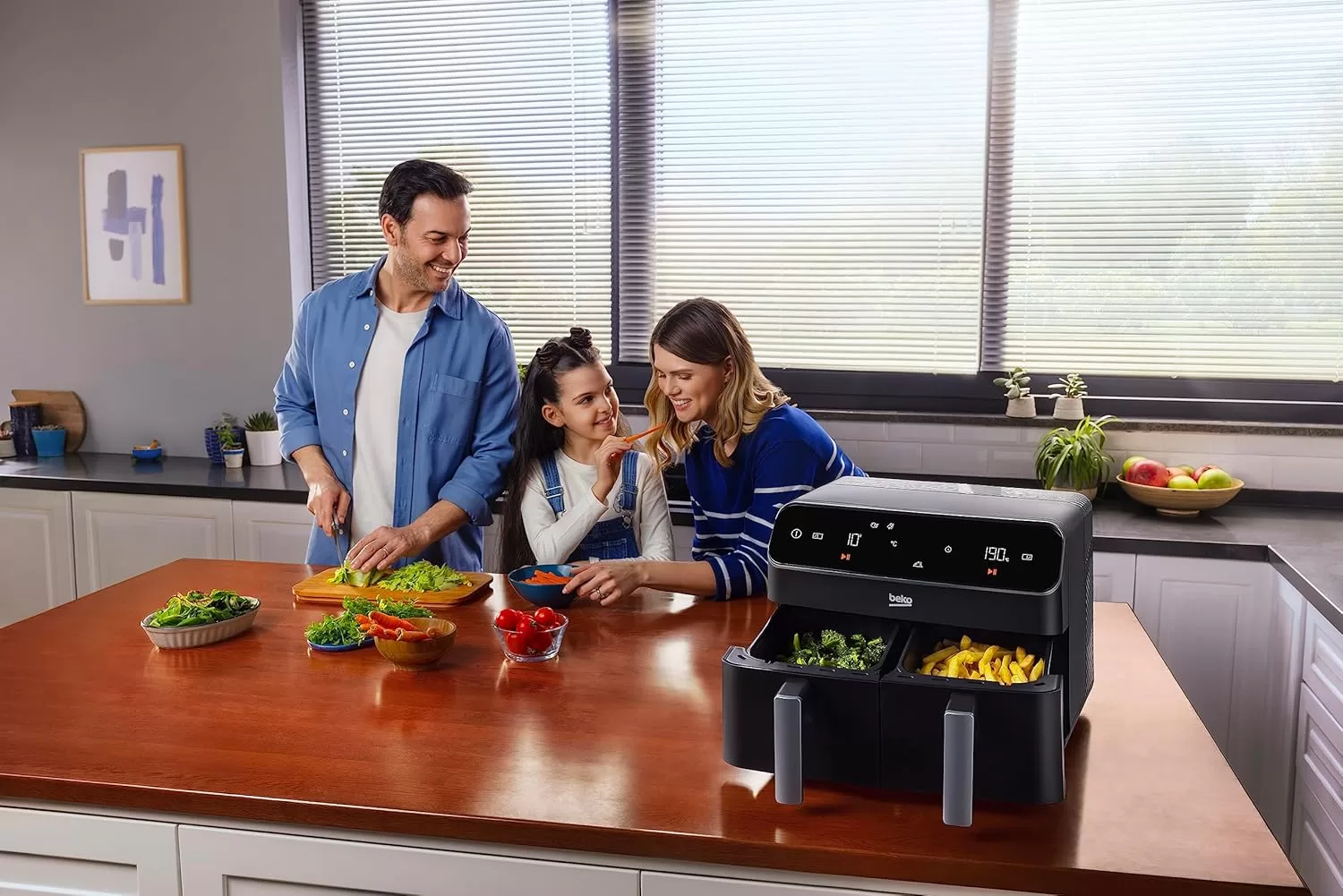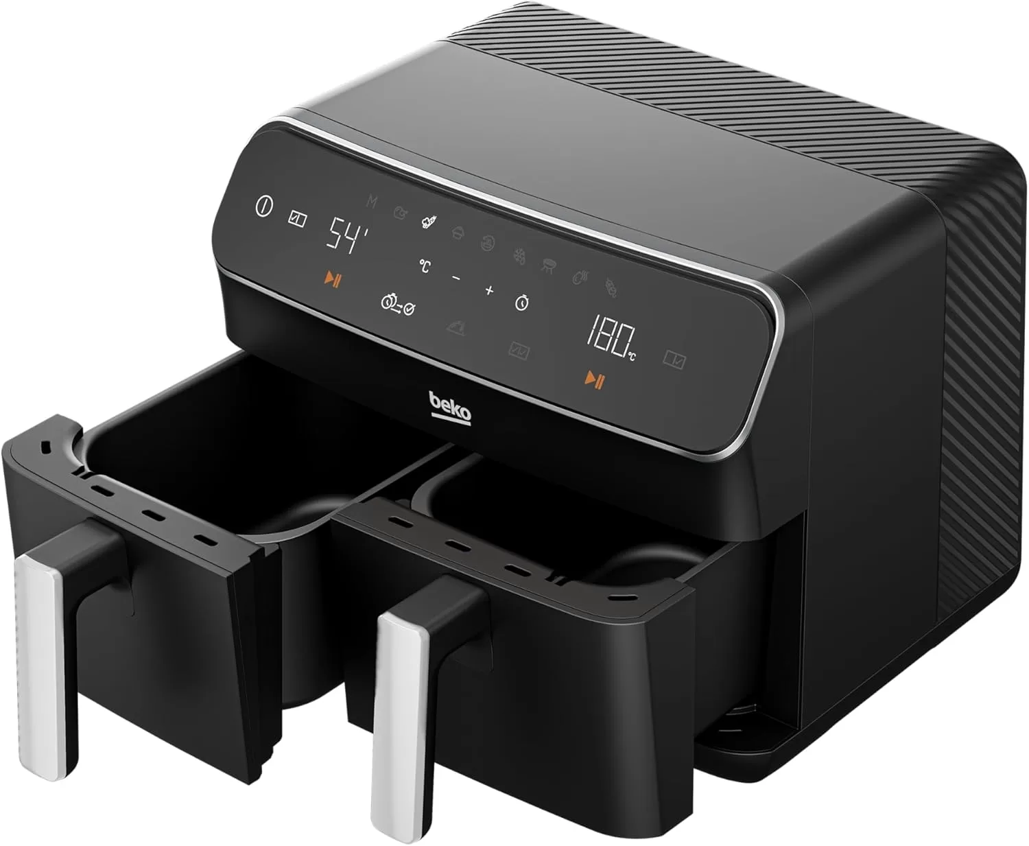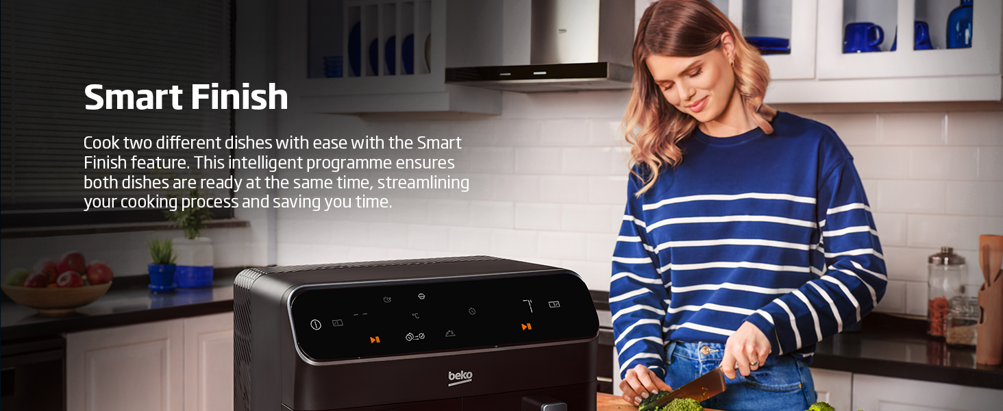 Beko Dual Zone Air fryer ExpertFry FRL5388B | 8.5L Capacity | Smart Finish | Match Cook | Wide LED Screen | 9 Automatic Cooking functions | Dehydrate | Air Fry, Black. From the manufacturer Use little to no oil – This versatile appliance not only reduces the amount of oil needed for cooking but also consumes less energy compared to a conventional oven, making it an energy-efficient option for your kitchen. 8.5L Dual Zone – Thanks to this model’s 8.5L Dual Basket, you can cook two large dishes simultaneously without mixing odours, maximizing your cooking efficiency, and saving time in the kitchen. Dishwasher Safe Accessories – Complete with four dishwasher-safe accessories, including a dehydrating rack, cooking rack, grill, and skewer rack, this stylish air fryer provides convenient and versatile cooking options Smart Finish – Cook two different dishes with ease with the Smart Finish feature. This intelligent programme ensures both dishes are ready at the same time, streamlining your cooking process and saving you time. Match Cook – Achieve perfectly cooked meals every time with the Match Cook feature. By easily copying cooking settings from one side to the other, this programme will save you time while delivering delicious results. Wide LED Screen – Thanks to the wide LED display, you can easily navigate through your Air Fryer’s menu options and temperature settings, making cooking a seamless experience. 9 Automatic Cooking Functions – Featuring 9 automatic cooking functions, including Manual, Grill and Dehydrating, this versatile appliance provides convenient meal preparation with pre-set cooking modes for a variety of dishes.
