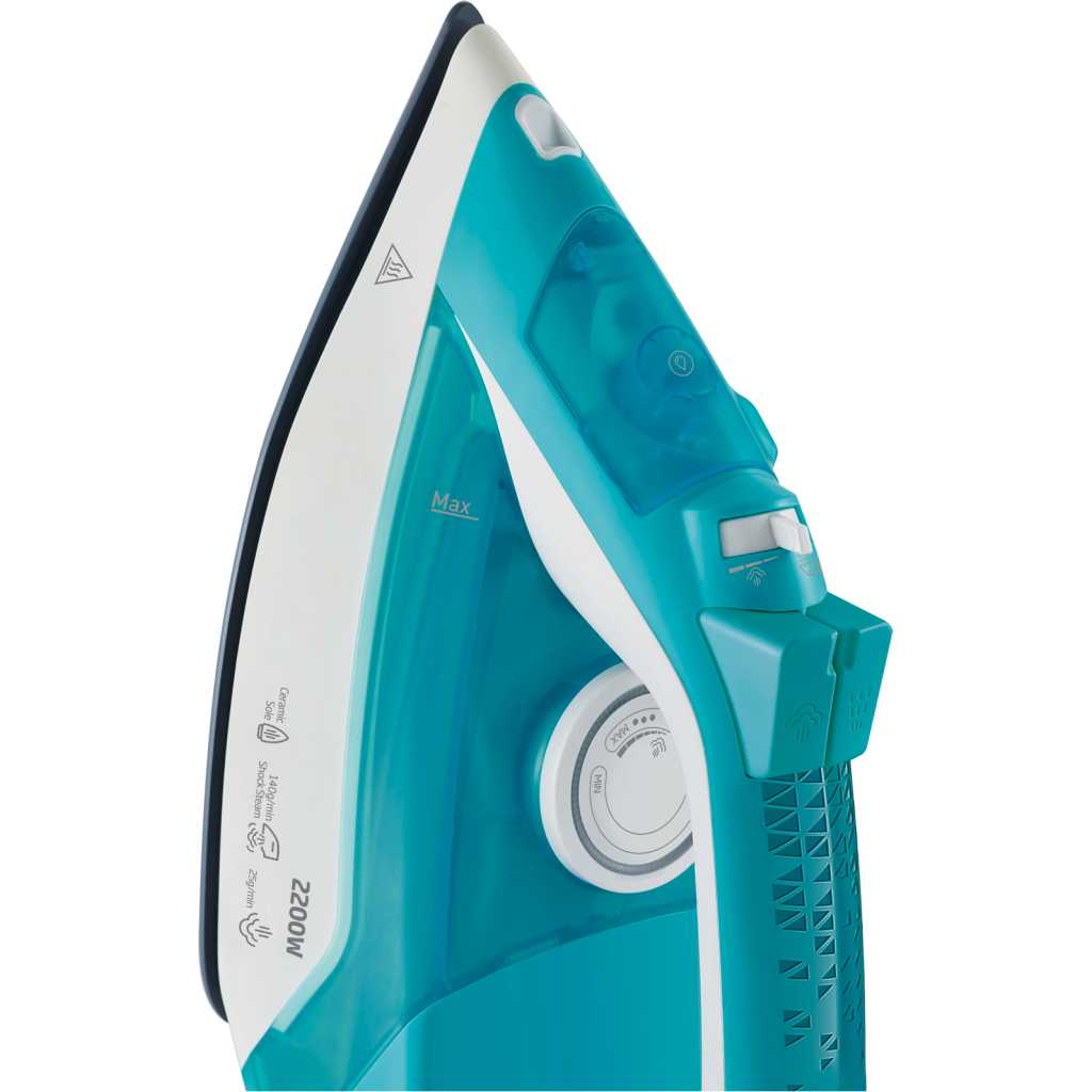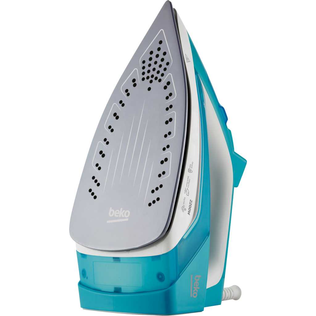 Beko Steam Iron, 2200W, Ceramic Soleplate, Anti-Drip, Self Cleaning, 25g/min Continuous Steam, SIM 3122 T – Turquoise. Ceramic-coated soleplate with steam pools. 2200Watts. 25 g/min continuous steam. 110 g/min shock steam, Manual knob control, and steam control. 3-Way Auto shut-off. Mechanical Anti-Drip, Self-Clean. Vertical Steam. Key Features: Beko Steam Iron, 2200W, Ceramic Soleplate, Anti-Drip, Self Cleaning, 25g/min Continuous Steam, SIM 3122 T – Turquoise. Ceramic-coated soleplate with steam pools. 2200Watts. 25 g/min continuous steam. 110 g/min shock steam, Manual knob control, and steam control. 3-Way Auto shut-off. Mechanical Anti-Drip, Self-Clean. Vertical Steam.