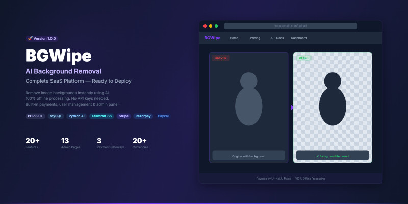 BGWipe - AI Background Removal SaaS Platform. AI background removal SaaS with API key selling, 3 payment gateways, wallet, affiliate system & admin panel. No API key needed