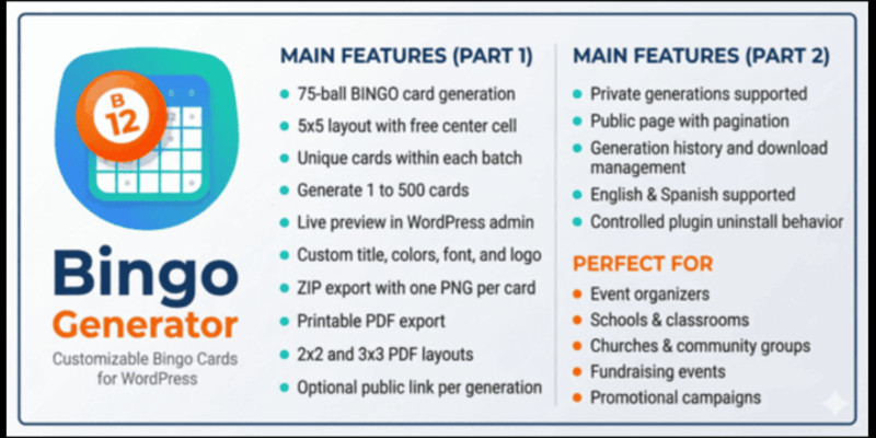 Bingo Generator for WordPress. Create branded 75-ball bingo card generations in WordPress with live preview, PNG ZIP export, printable PDF export and More
