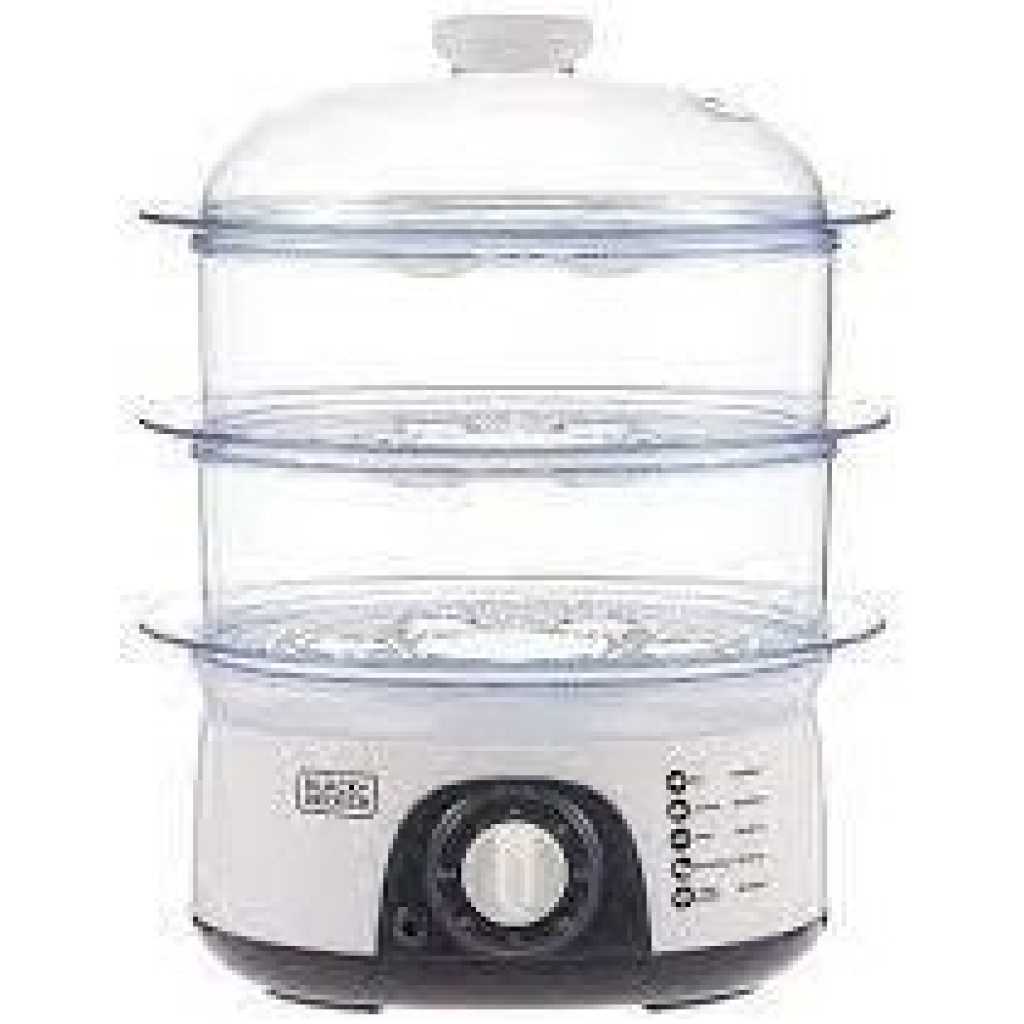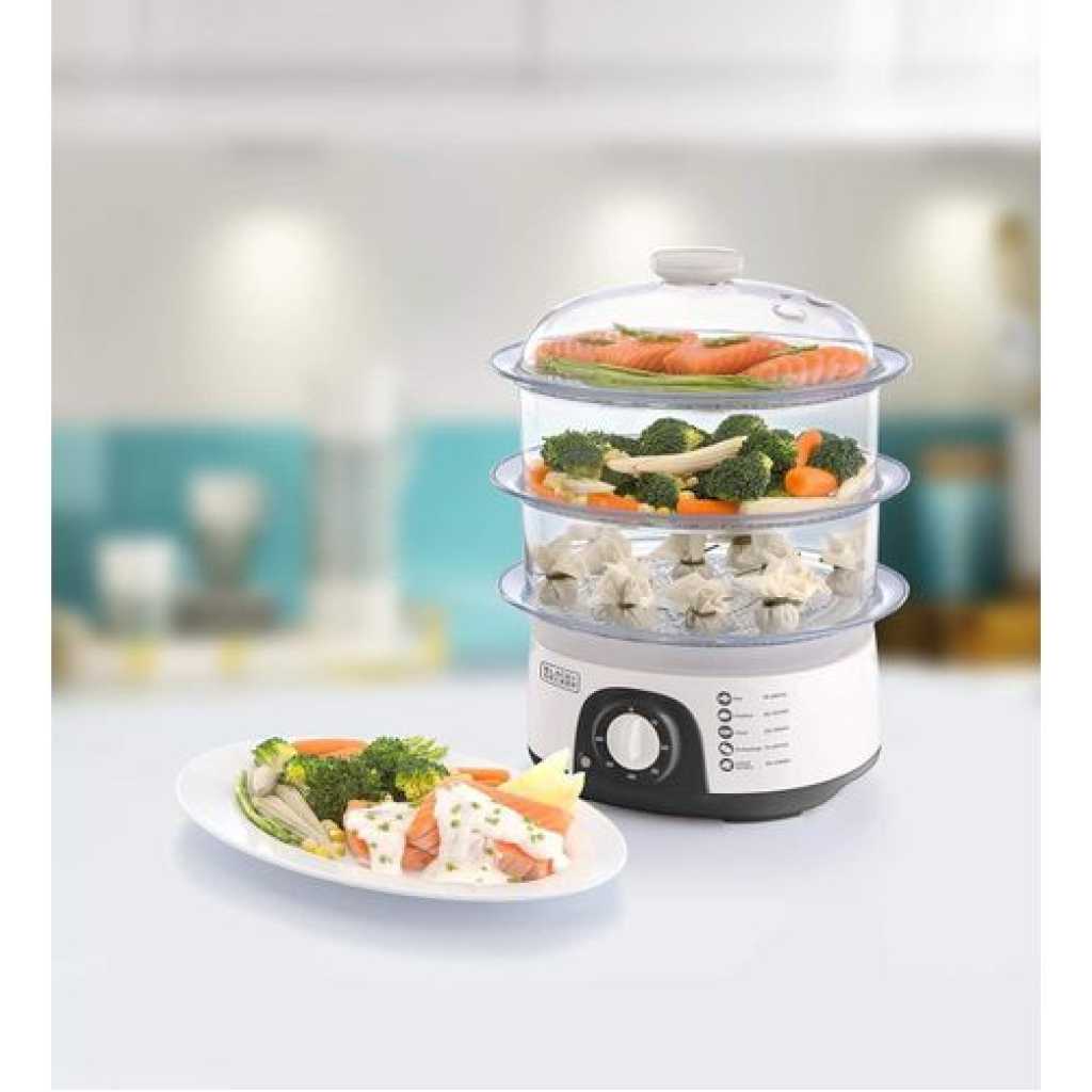Key Features: BLACK+DECKER 10L Vegetable Food Steamer 3-Tier Detachable With Timer and Dishwasher Safe, Makes Preparation Quick pot- Clear Weight 1.98 Kg Voltage 220-240 V Power 775 W 3 tiers for cooking various foods at once A mechanical timer ensures perfect results 10-litre bowls for making family meals Stack-able design for effortless cooking assembly and storage Number of Tiers: 3