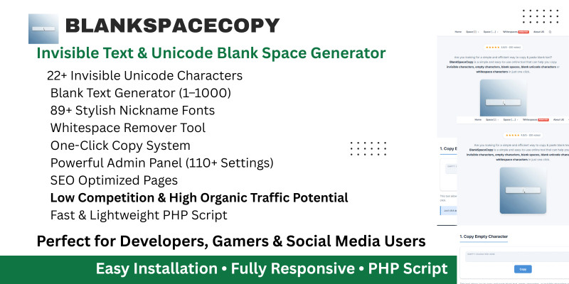 BlankSpaceCopy - Invisible Text Platform. Copy invisible text, generate blank spaces & styled nicknames with this fast, SEO-friendly PHP platform.