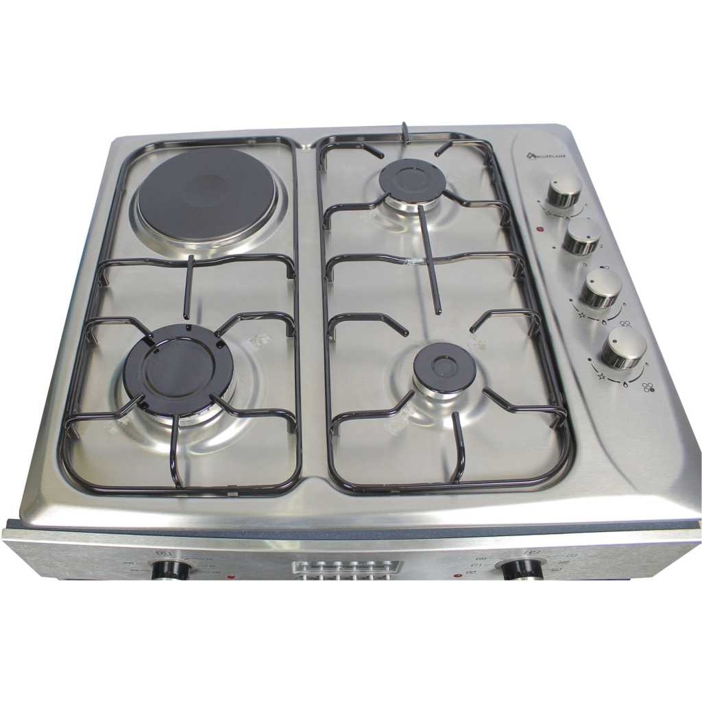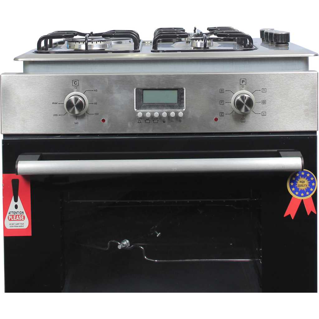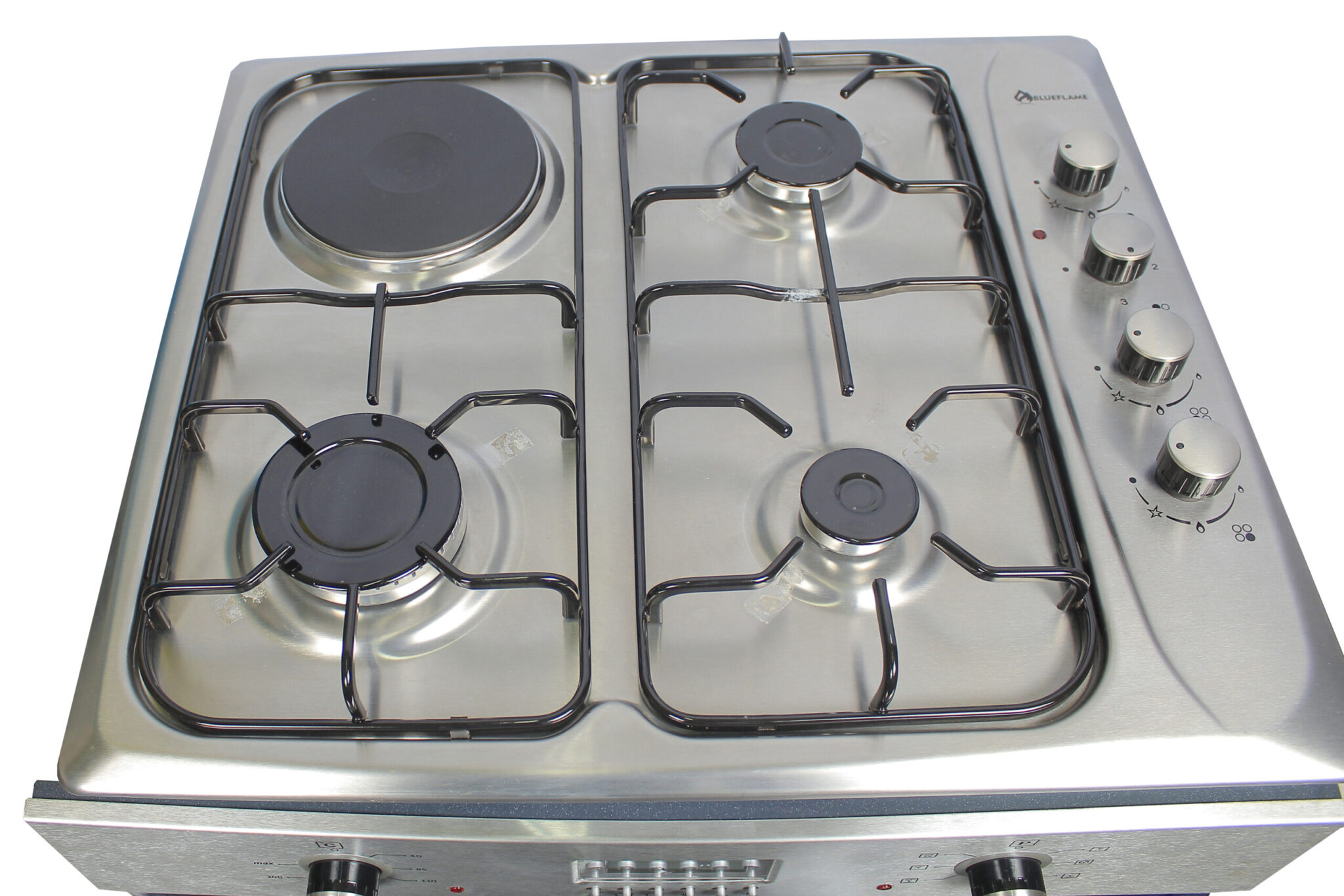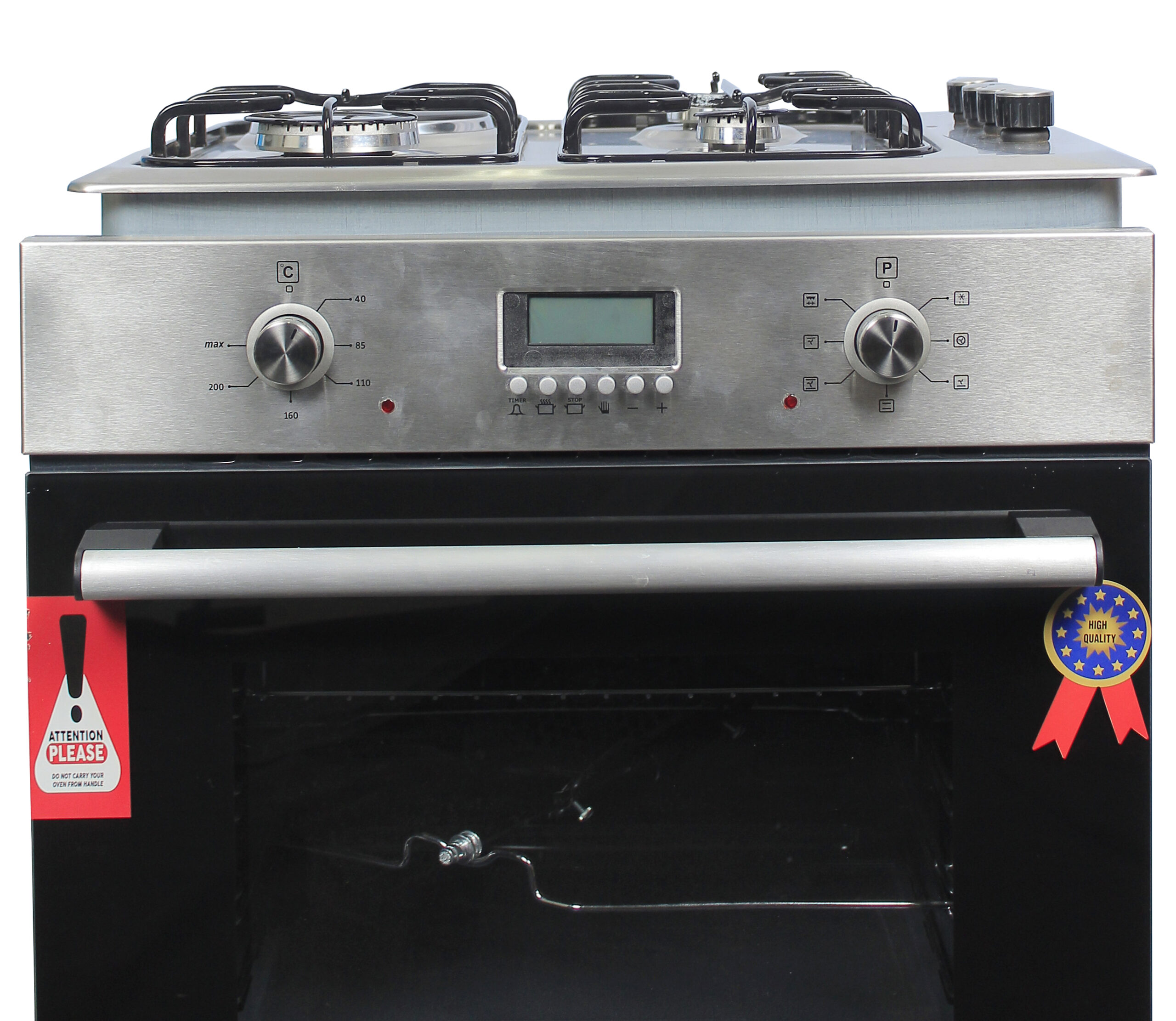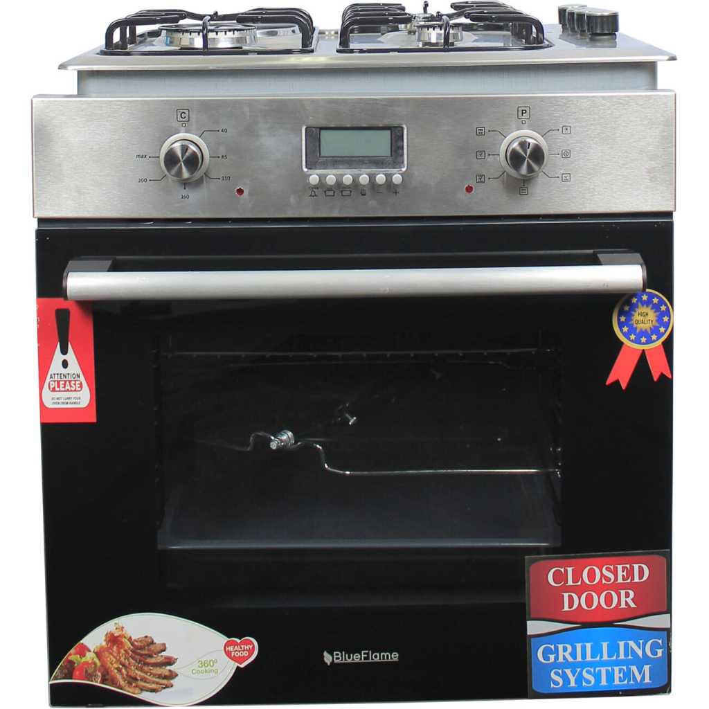 Blueflame 60cm Built-in Cooker 43IC; 3-Gas Burners And 1-Electric Plate, Electric Oven, Oven Fan, Grill Heater, Thermostat, Fan, Auto Ignition – Inox. Electric oven 3 gas burners and 1 electric plate 2 years of guarantee and 3 years of warranty Cooling Fan Up & Down Heating Elements Grill Heater Turbo Fan (0+6 Functions) Limit Thermostat Oven Lamp Stainless Steel & Tempered Black Glass Combined Control Panel 1 Oven Tray 1 Oven Wire Grid Double Glass Oven Door Silver Color Pop Up Knobs & Aluminum Handle