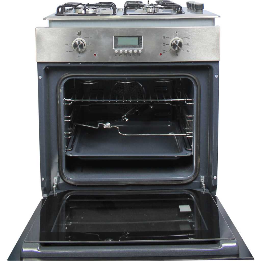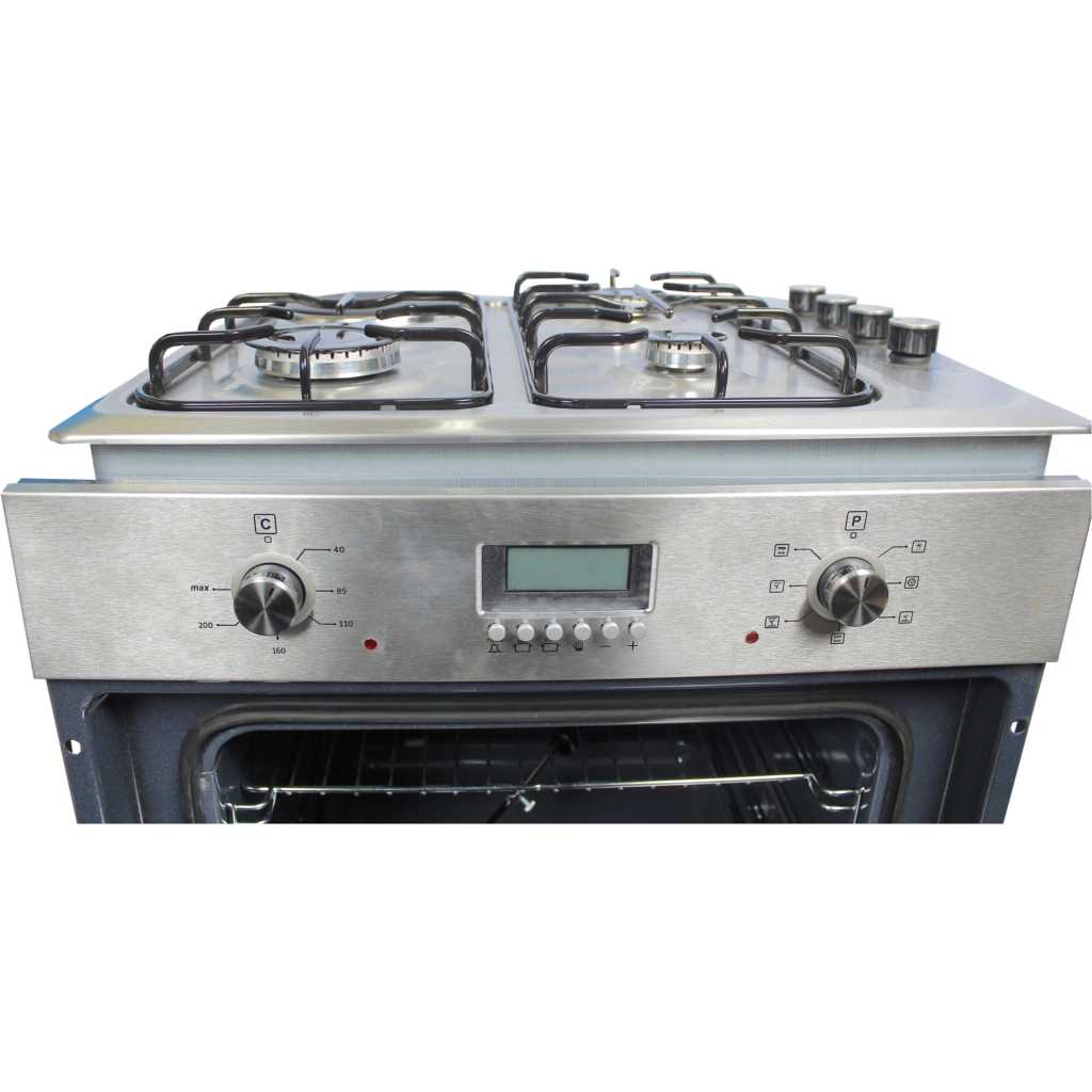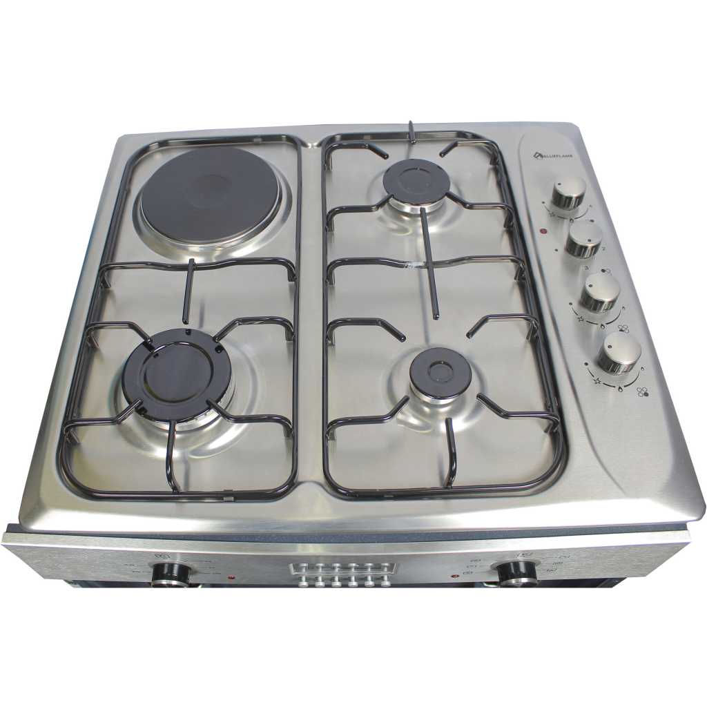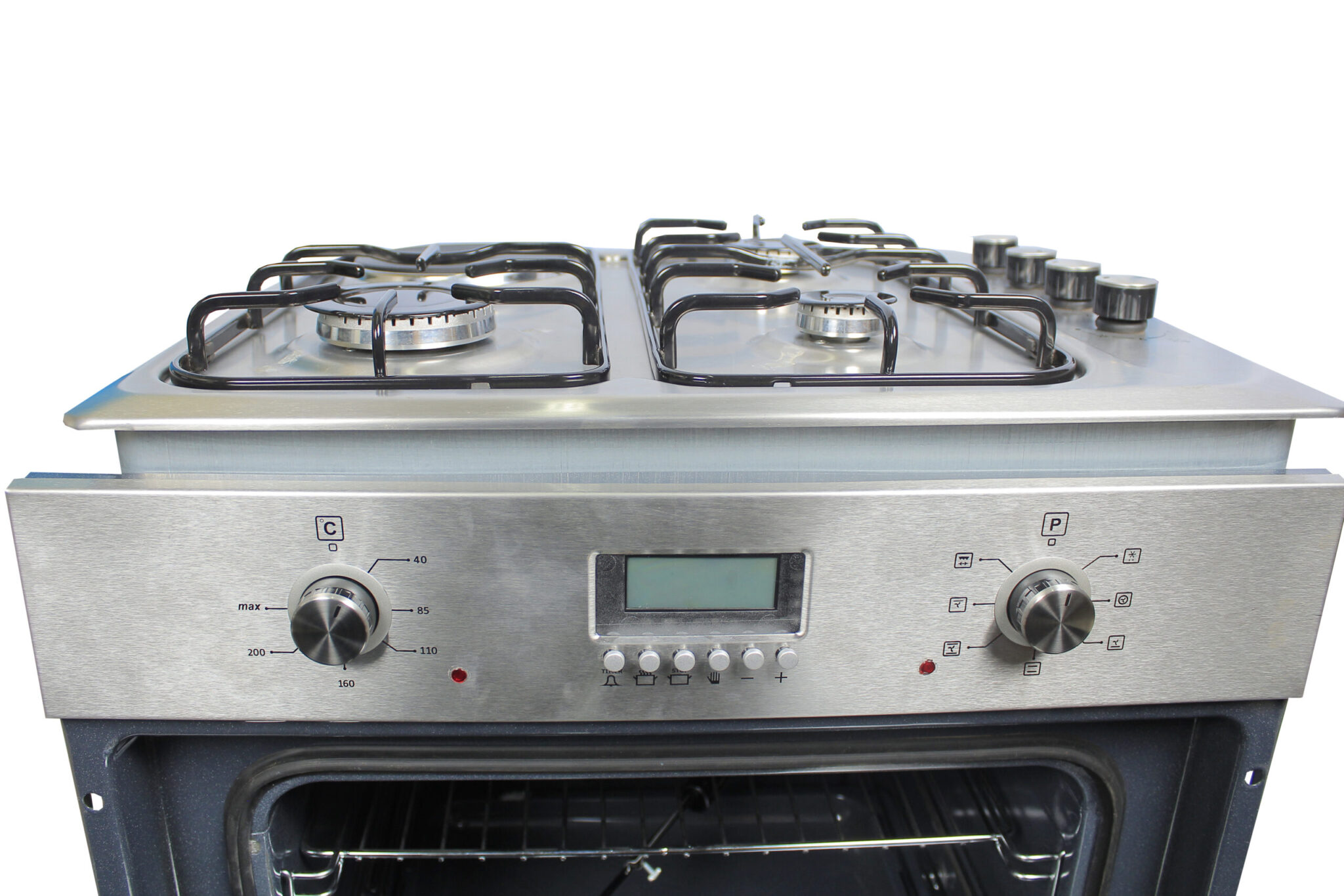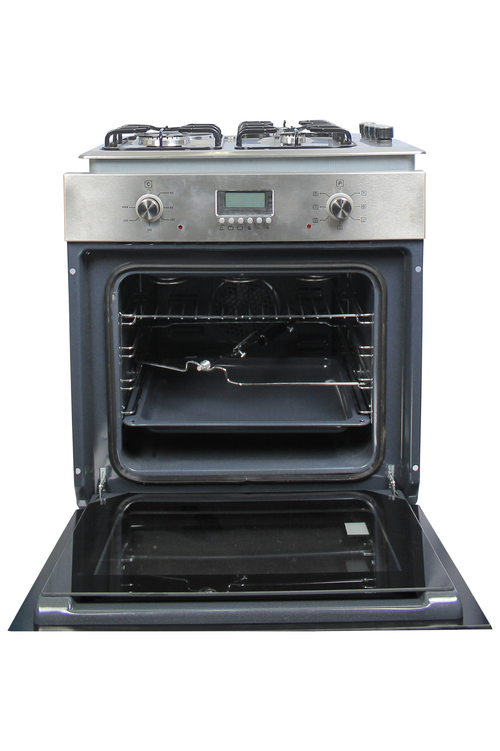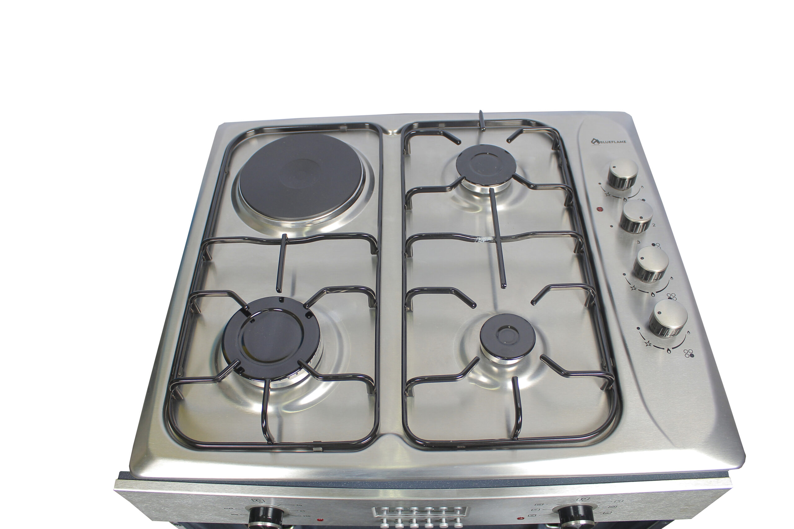 Blueflame 60cm Built-in Cooker 43IC; 3-Gas Burners And 1-Electric Plate, Electric Oven, Oven Fan, Grill Heater, Thermostat, Fan, Auto Ignition – Inox. Electric oven 3 gas burners and 1 electric plate 2 years of guarantee and 3 years of warranty Cooling Fan Up & Down Heating Elements Grill Heater Turbo Fan (0+6 Functions) Limit Thermostat Oven Lamp Stainless Steel & Tempered Black Glass Combined Control Panel 1 Oven Tray 1 Oven Wire Grid Double Glass Oven Door Silver Color Pop Up Knobs & Aluminum Handle