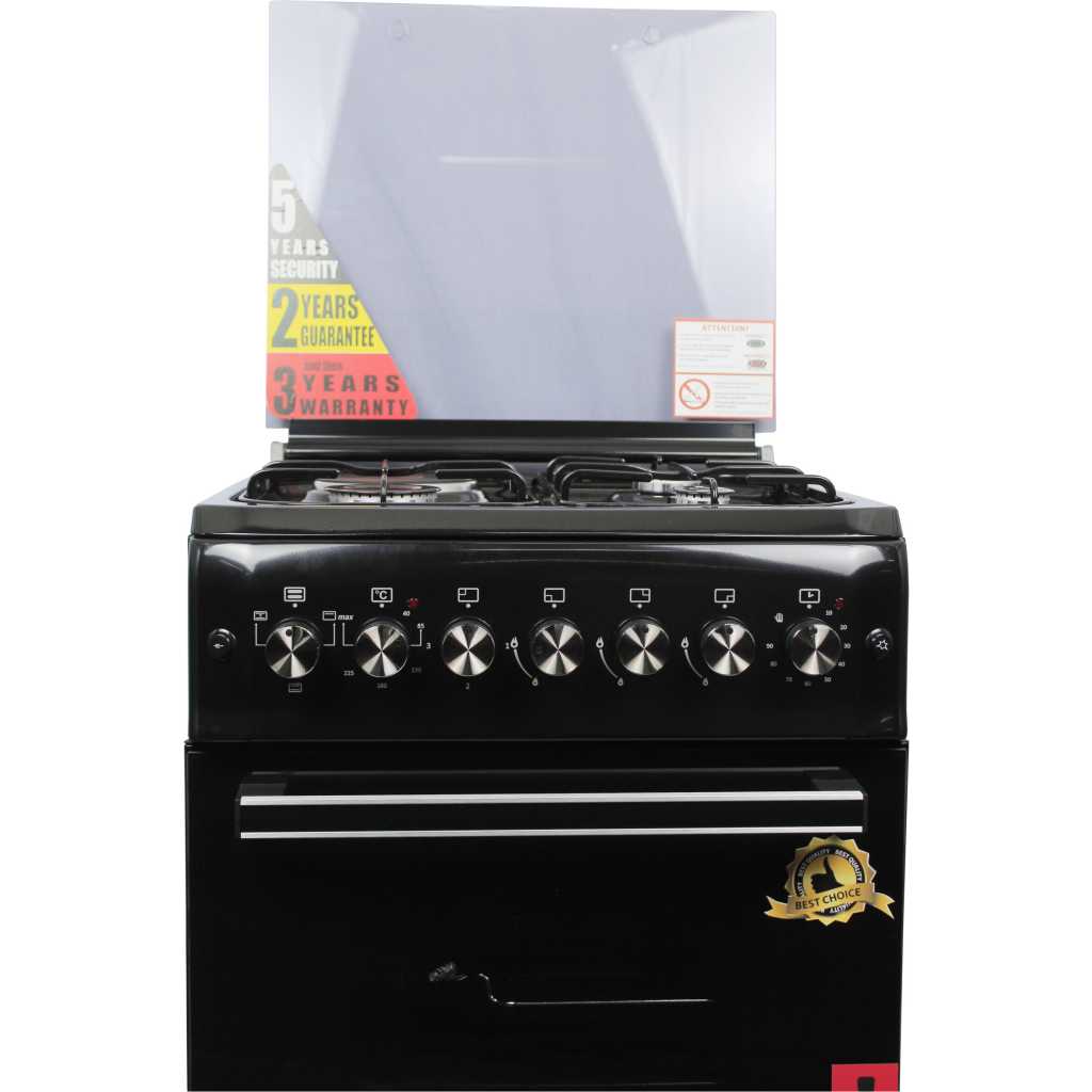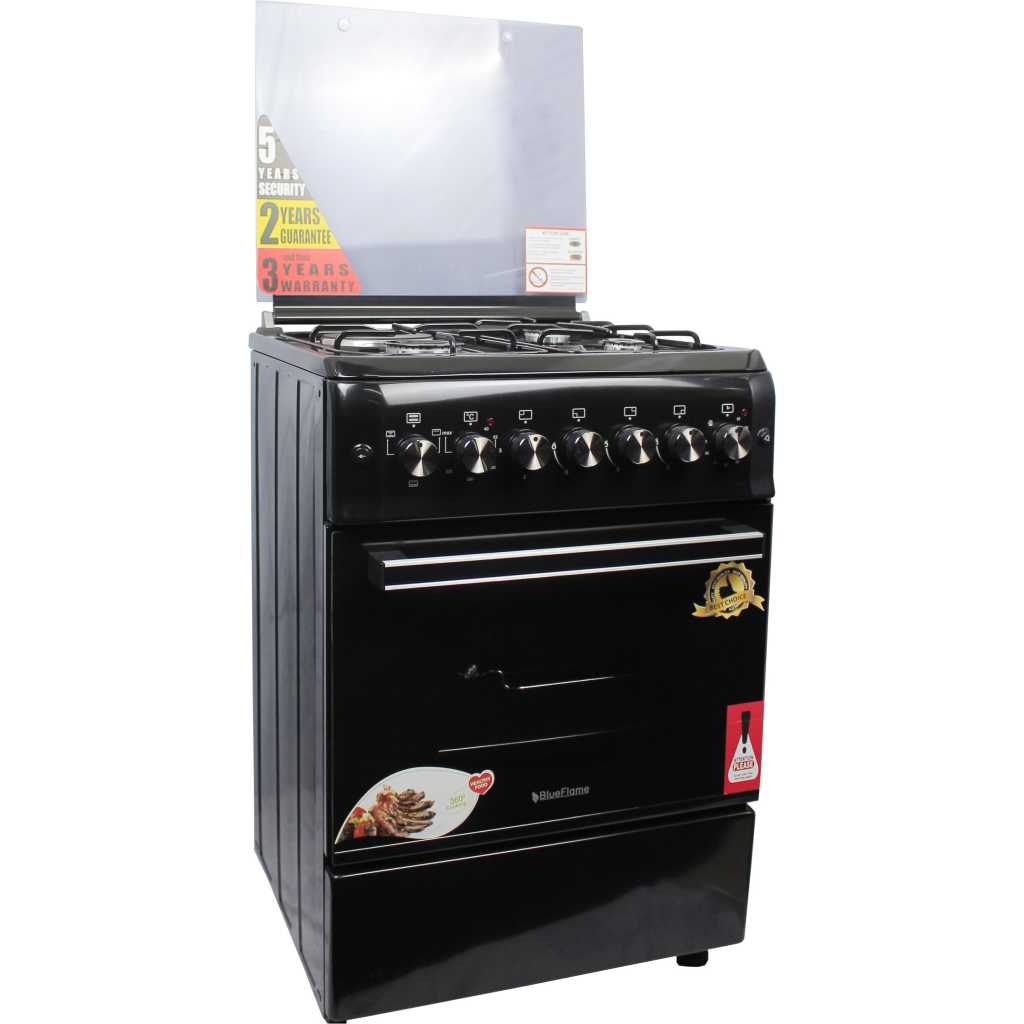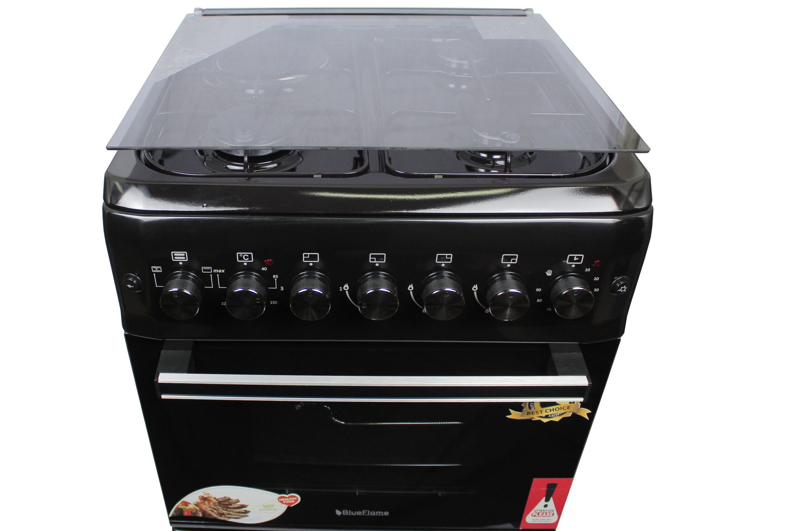 BlueFlame Cooker 60x60cm, 2 Gas Burners And 2 Electric Plates; S6031EFRP With Electric Oven& Grill, Auto Ignition, Rotisserie, Oven Lamp – Black 2 Gas Burners 2 Electrical plate Electrical Grill Electrical Oven Turbo fan Push Button Ignition Thermostat Turnspit(rotisserie) Enamel Grid Glass Lid 1 Tray + Wire Grid Analog Timer Chromed Oven Rack Adjustable Legs Stainless steel 2 years of guarantee and 3 years of warranty