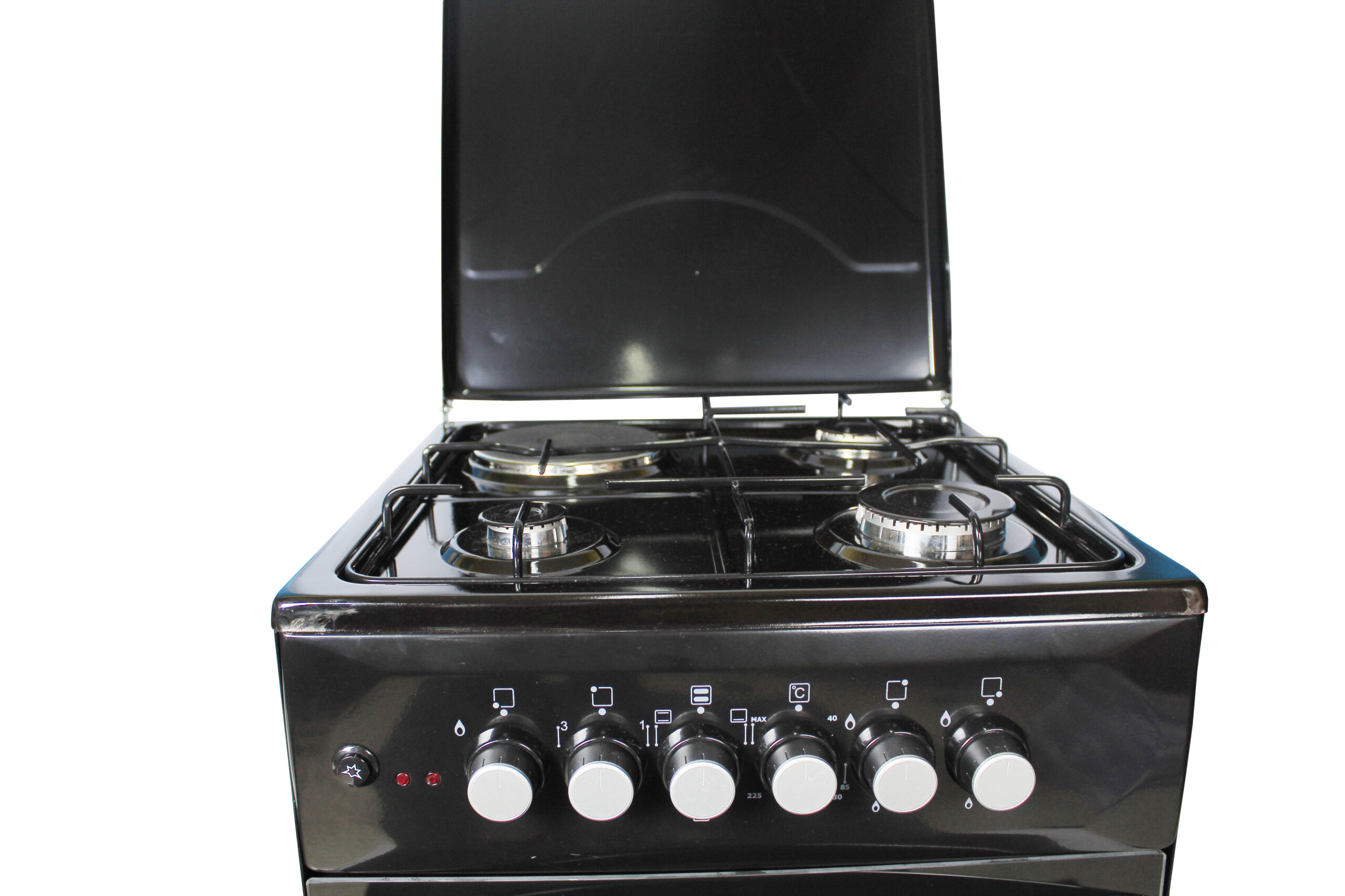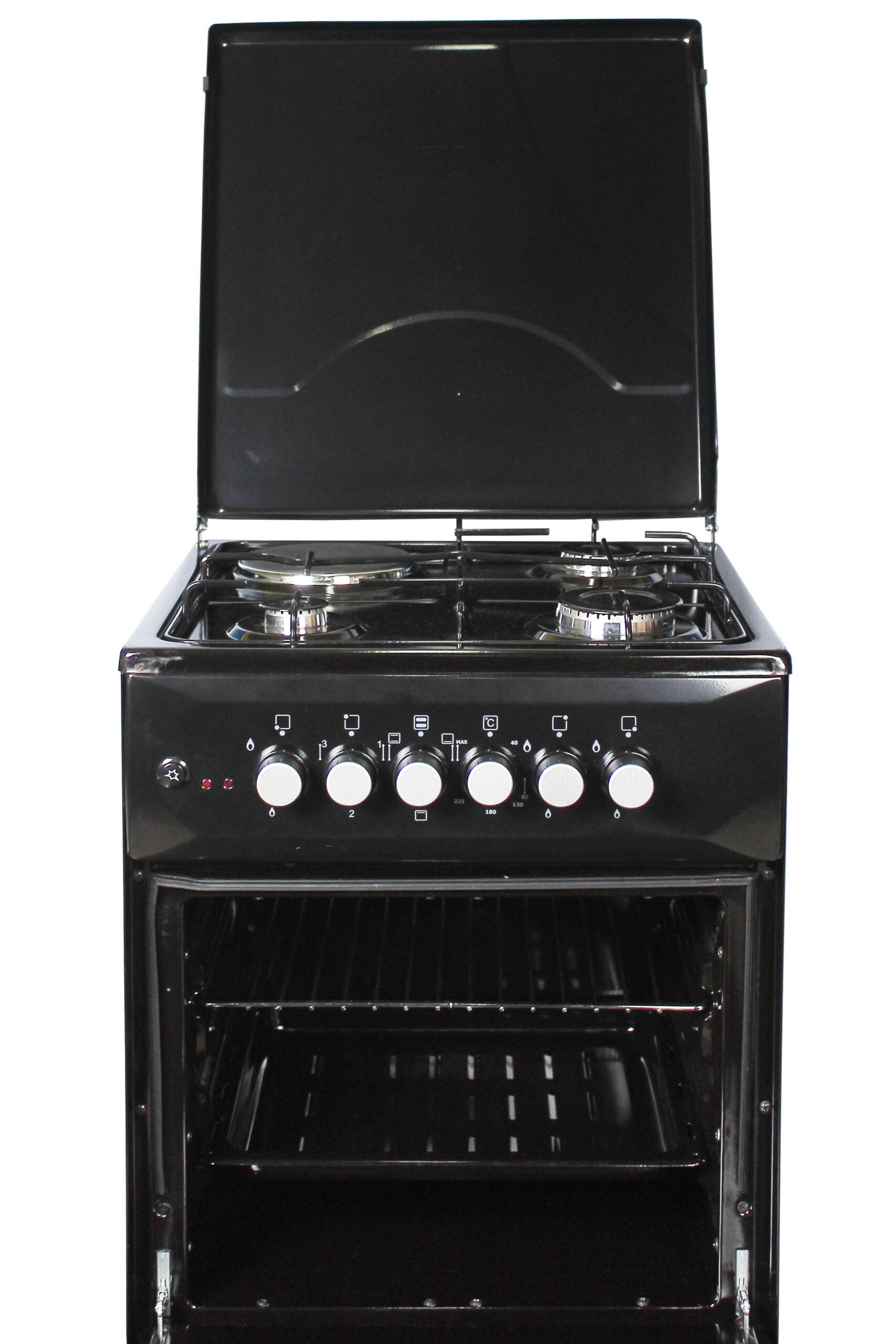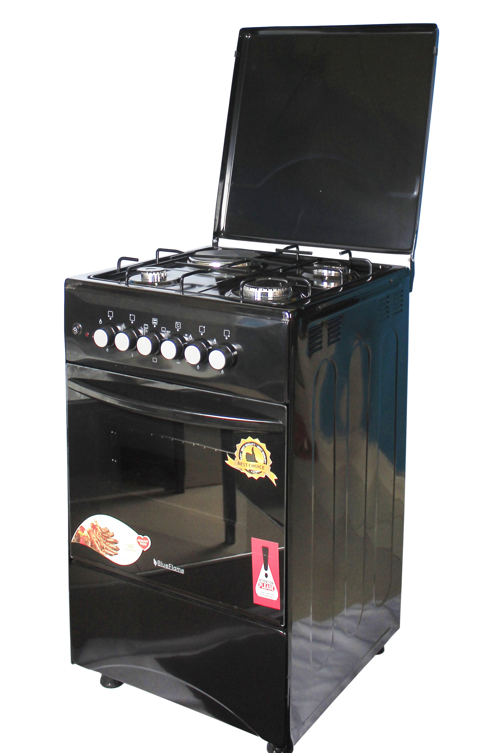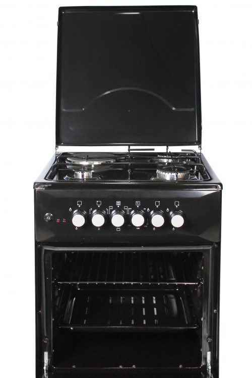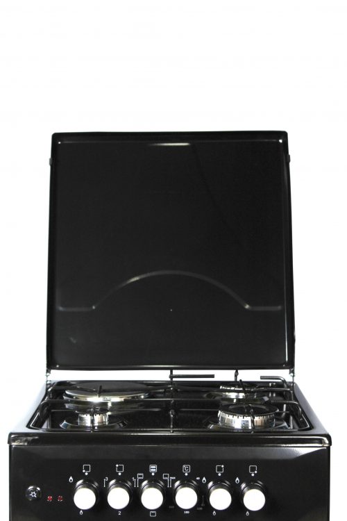 Key Features: Blueflame Cooker C5031E – B 50x50cm 3gas burners and 1 electric plate with electric oven, black. 1 Electrical Hot Plate 3 Gas Burners Electrical Oven Thermostat Push Button Ignition Enamel Oven & Hob Cavity Metallic top Lid Oven lamp 1 Tray + Wire Grid Chromed Oven Rack Adjustable Legs Black in color 2 year gaurantee and 3 year warranty