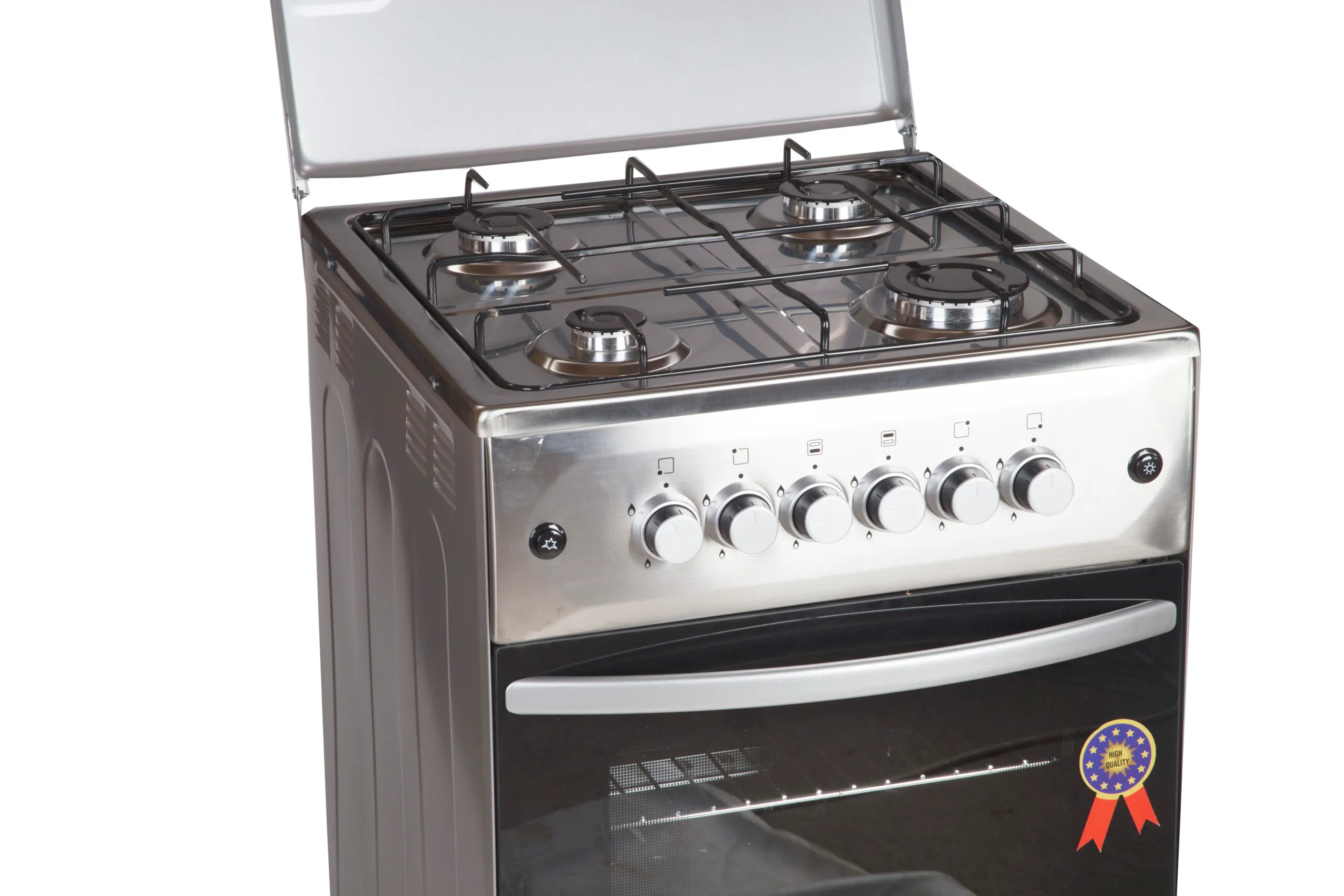 Gas Oven (MANUAL IGNITION) Push Button Ignition Removable Pot Grid Enamel Oven & Hob Cavity Metallic top Lid Oven lamp 1 Tray + Wire Grid Chromed Oven Rack Adjustable Legs Stainless steel 2 year gaurantee and 3 year warranty