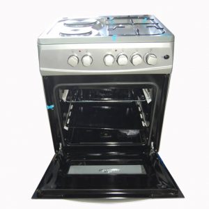 DESCRIPTION REVIEWS (0) 3 Gas Burners 1 Electrical plate Electrical Grill Electrical Oven Push Button Ignition Thermostat Turnspit(rotisserie) Turbo Fan Enamel Grid Glass Lid 1 Tray + Wire Grid Analog Timer Chromed Oven Rack Adjustable Legs Black in colour 2 years of guarantee and 3 years of warrant