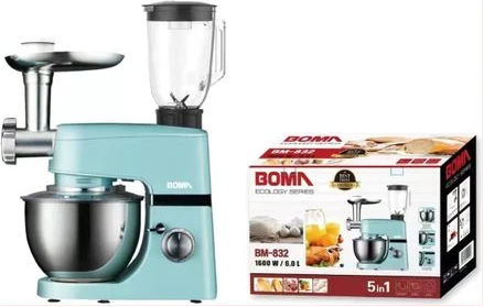 Boma 5-in-1 Multifunctional Stand Mixer Our kitchen stand mixer is equipped with an 7.5QT stainless steel bowl with a dough hook, a beater and a whisk. Also, you can make milkshake and juice with the juice blender, yummy meatballs and meat sauce with the meat grinder. The bowl is updated with two handles for easy operation. The instruction manual includes accessory installation tutorial and recipes, you can use our product without worry. The powerful planetary mixing system for mixing bread dough, thick batters, meringues, and whipping cream, makes the mixing thoroughly and evenly Use the Pulse option, which gets the highest speed, to make juice, milk shake, or rinse the juice cup easily Please do not put the blender into the dishwasher