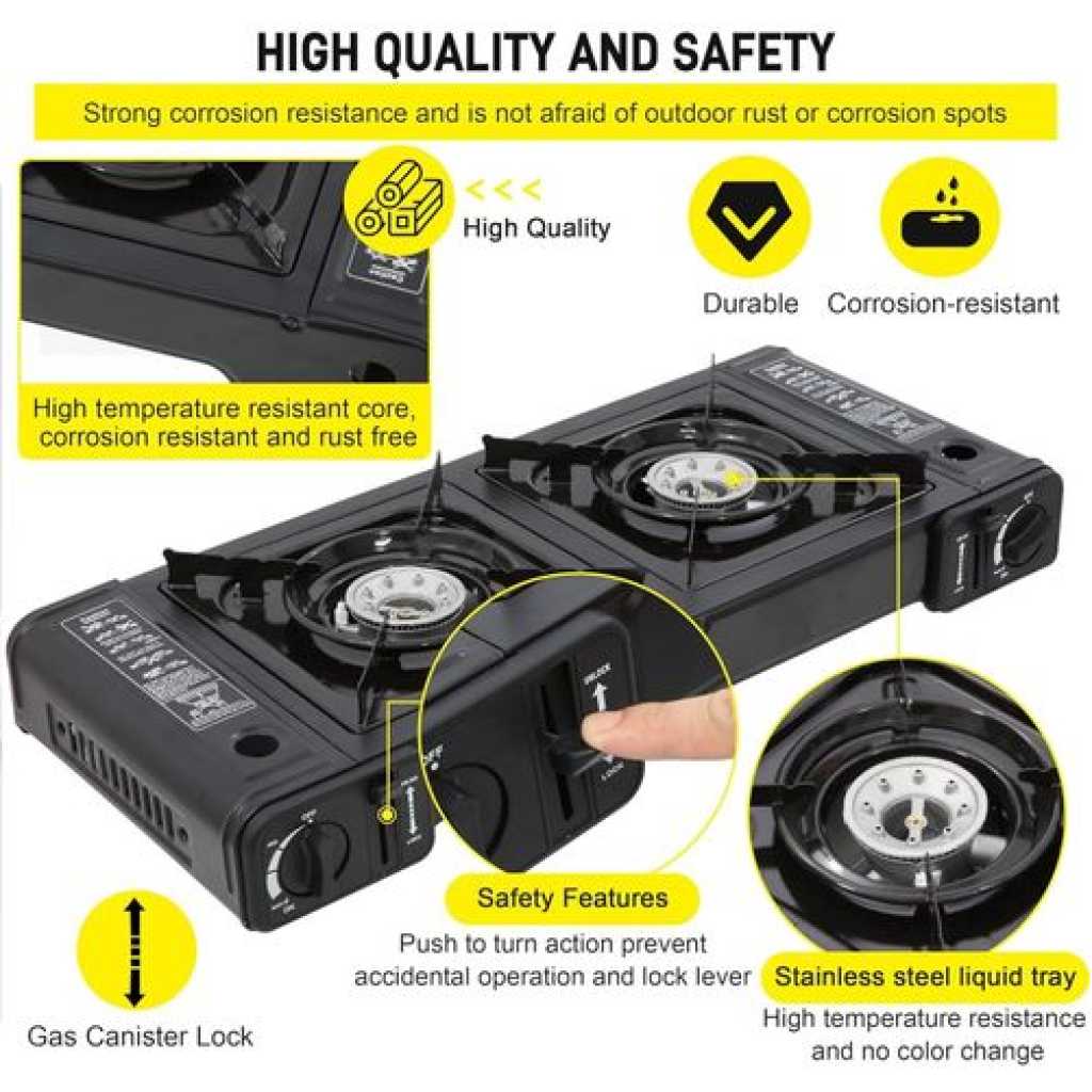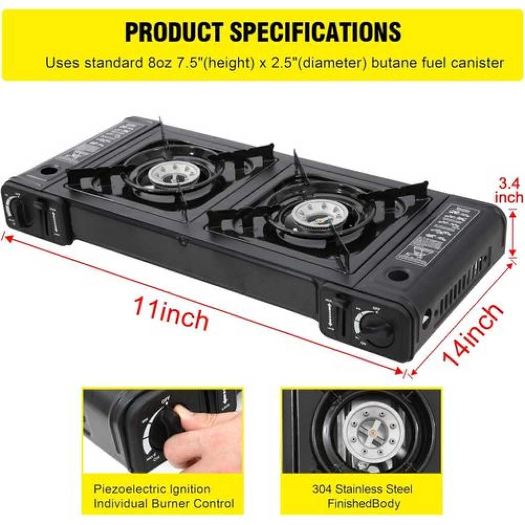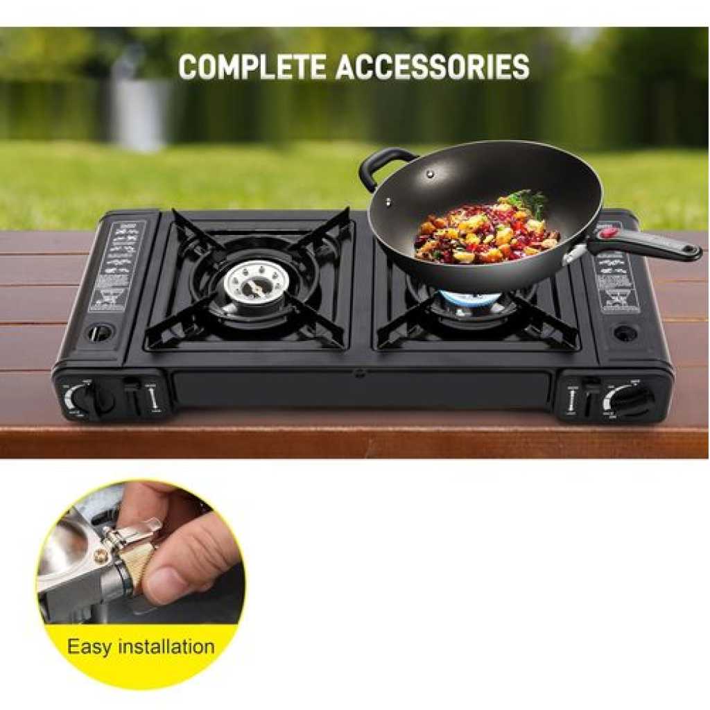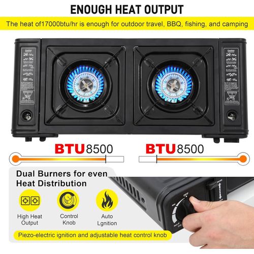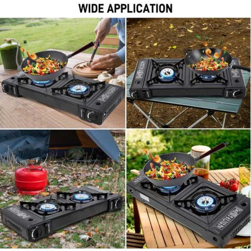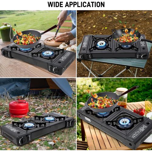 Boma Propane Camping Stove 2 Burners Portable Camping Stove Double Auto Ignition Camping Burner LPG for RV, Apartments, Outdoor – Black PERFECT DIMENSION Product Size:24inch*11inch*3.4inch HIGH HEAT OUTPUT Portable Gas Stove Powered at 17,000 BTU/hr, Heats up Food Quickly and Evenly with Auto Ignition. HIGH QUALITY&SAFETY The camping stove is made of 304 stainless steel for durability and comes with a new grate that holds frying pans and pans securely without slipping The gas stove comes with four non-slip rubber feet. DUAL-USE MORE CONVENIENT Two modes of use are at your disposal, one with a propane tank and the other with a 16 oz. propane cylinder that can be used for up to 1 hour on high. COMPLETE ACCESSORIES 2 Burner Portable Camping Stove, with Carrying Case, Easy to carry. WIDE APPLICATION Perfect for outdoor kitchens and weather conditions, rain or shine, especially for outdoor kitchens and barbecue islands. Key Features: Boma Propane Camping Stove 2 Burners Portable Camping Stove Double Auto Ignition Camping Burner LPG for RV, Apartments, Outdoor – Black 【High Heat Output】-Portable Gas Stove Powered 17,000 BTU/hr, Heats up Food Quickly and Evenly with Auto Ignition, no Need for Cumbersome Start-up, and Heats up Quickly Features a Control Knob to Conveniently Set. 【Complete Accessories】-2 Burner Portable Camping Stove, with Carrying Case, Easy to carry. 【Perfect Dimension】-This Gas Cooktop Size:24” x 11” x 3.4” Propane Stove with a New Stove Frame, the Woks and Pans can be Placed Steadily Without Slipping Gas Burner Comes with four Non-slip Rubber Legs. 【Portable Gas Stove】-This Camping Stove is durable and made of 304 stainless steel, Compatible With Propane Fuel, Up to 1 hour on high on one 16 oz. propane cylinder (sold separately). 【Wide Application】Perfect for Outdoor Kitchens and Weather Conditions, rain or Shine, especially for Outdoor Kitchen and BBQ Island. At the same time, Burner Comes with a Piezo Ignition Function to Sidestep the Need for Conventional Matches or Lighters When Igniting Your Burner. Simply Push and Turn the Knob to Enable the Flame.