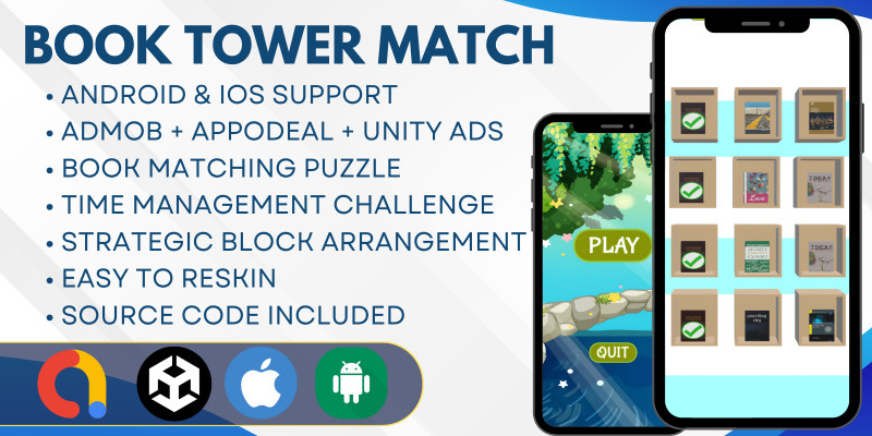 Book Tower Match Unity Game - Android IOS. A complete Unity 2D puzzle game. Match books under time pressure. Full C# source code, AdMob ads, ready for Android & iOS.
